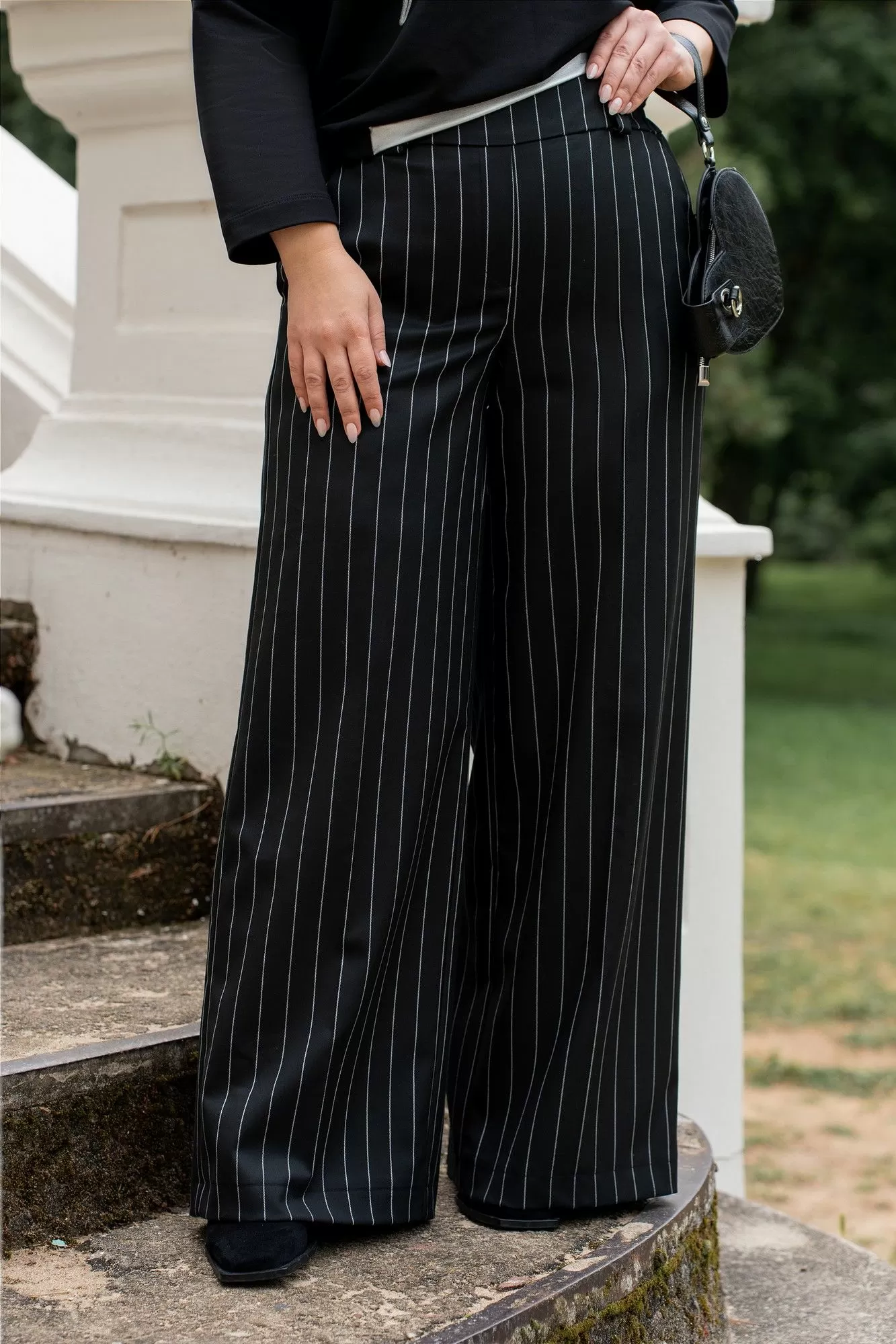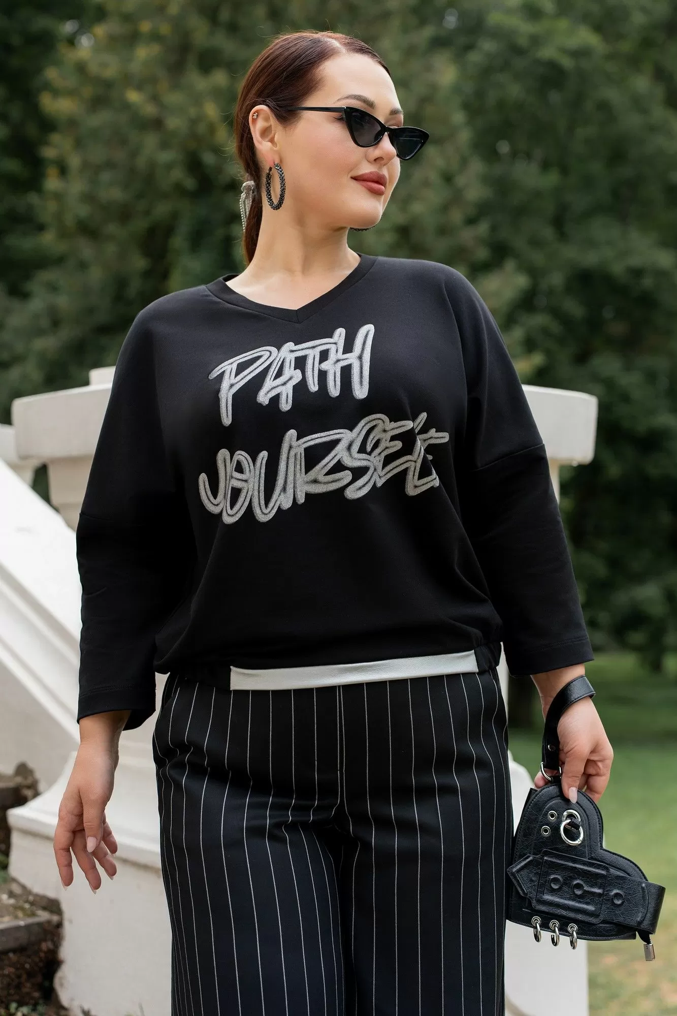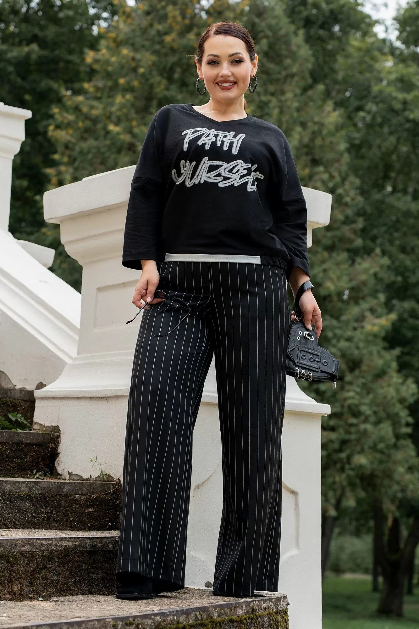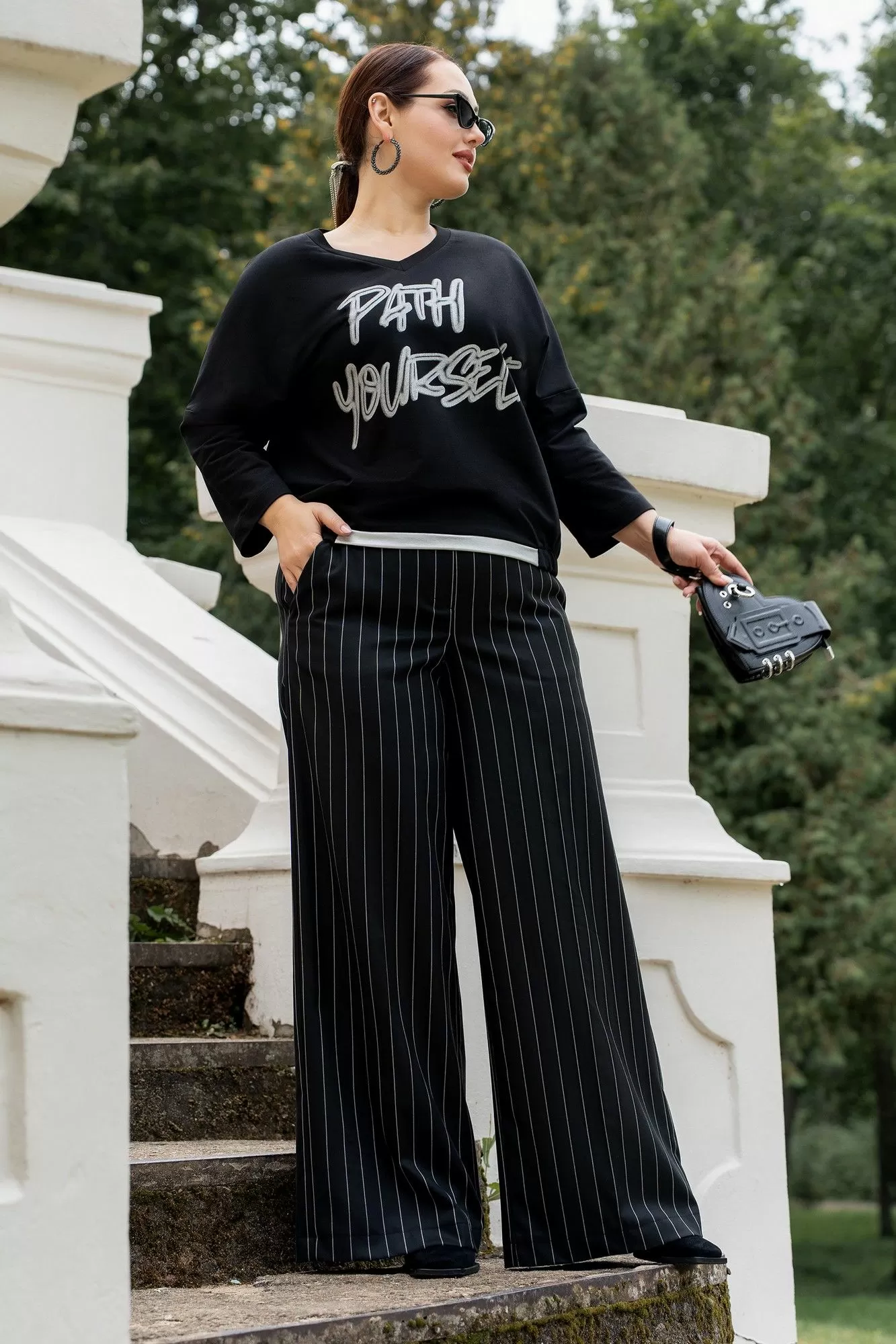 Костюм брючный,сочетание полоски и трикотажа создает шикарный образ как для работы,отдыха,так и для повседневной жизни.Джемпер выполнен из премиум трикотажа, свободного силуэта,с V-образным вырезом горловины, со спущеным плечом, рукава 7/8. По полочке серебрянная дизайнерская печать, по низу серебрянная вставка. Спинка со средним швом. Горловина обработана бейкой. по низу спинки и бокам с эластичной резинкой. Брюки прямого лаконичного силуэта, из класической костюмной полоски, по переду пояс вставка со шлёвками, по спинке пояс с эластичной резинкой. Брюки с боковыми наклонными карманами. Брюки со стрелками.
