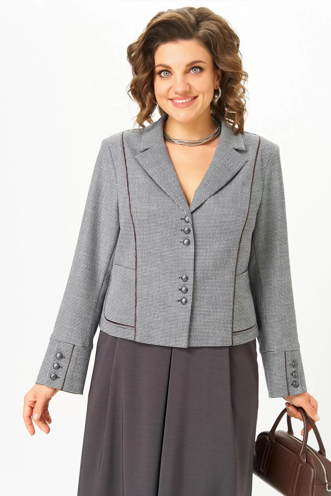 Костюм построен на контрасте фактур и цветов: строгая чёрно-белая «гусиная лапка» + глубокий графитово-коричневый низ. Коричневая отстрочка-кант на жакете выступает связующим звеном между верхом и низом, создавая единую цветовую историю. Рельефы и приталенный силуэт делают фигуру визуально стройнее и выше. Рукав втачной двухшовный с широкой манжетой и пуговицами. Юбка на подкладке. Для максимально комфортной посадки по бокам пояса вставлена эластичная резинка. Сочетание мягкого верха и строгого низа создаёт баланс между комфортом и аккуратностью, делая комплект универсальным для офиса, повседневных выходов и стильных деловых встреч.
