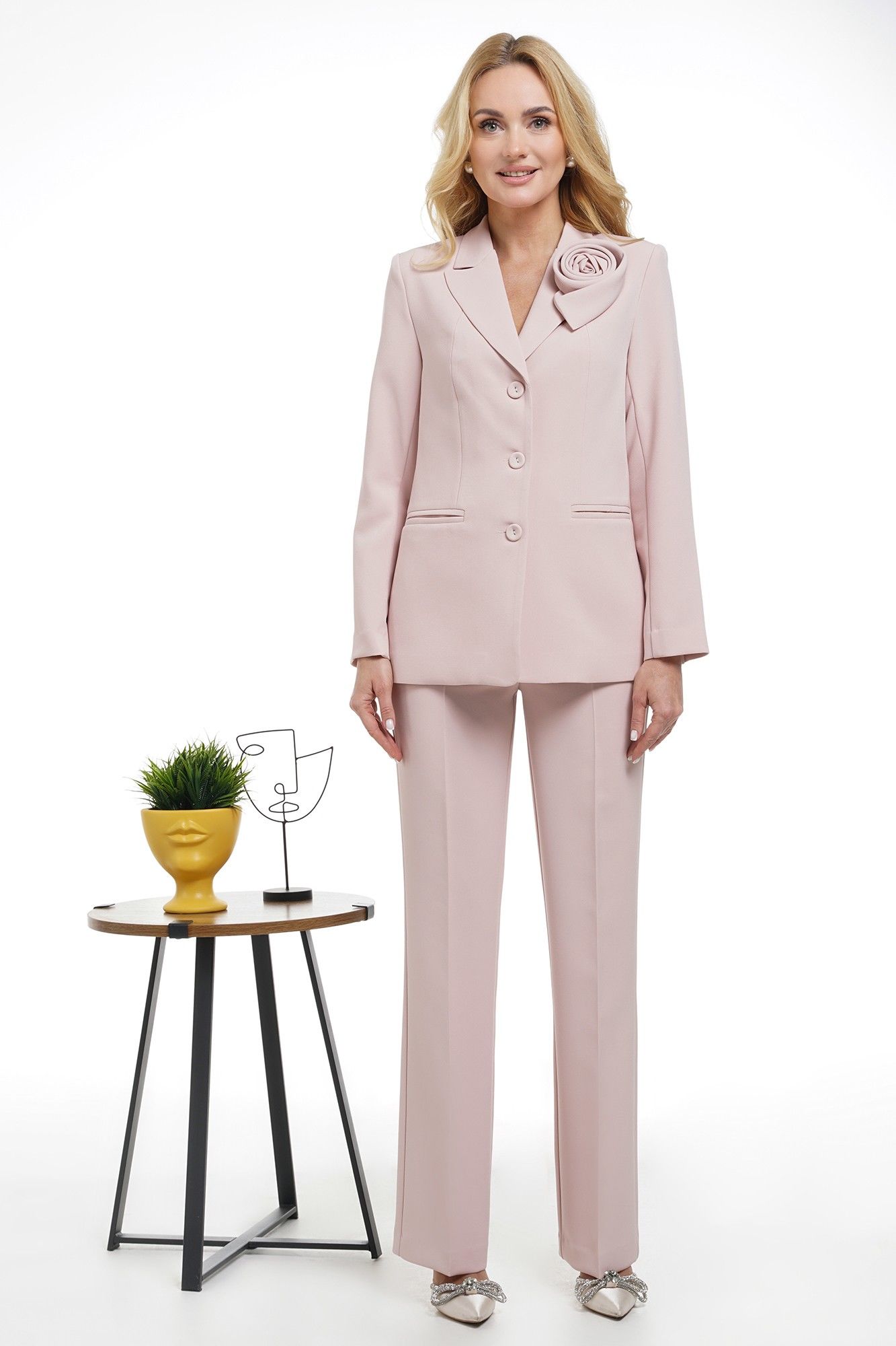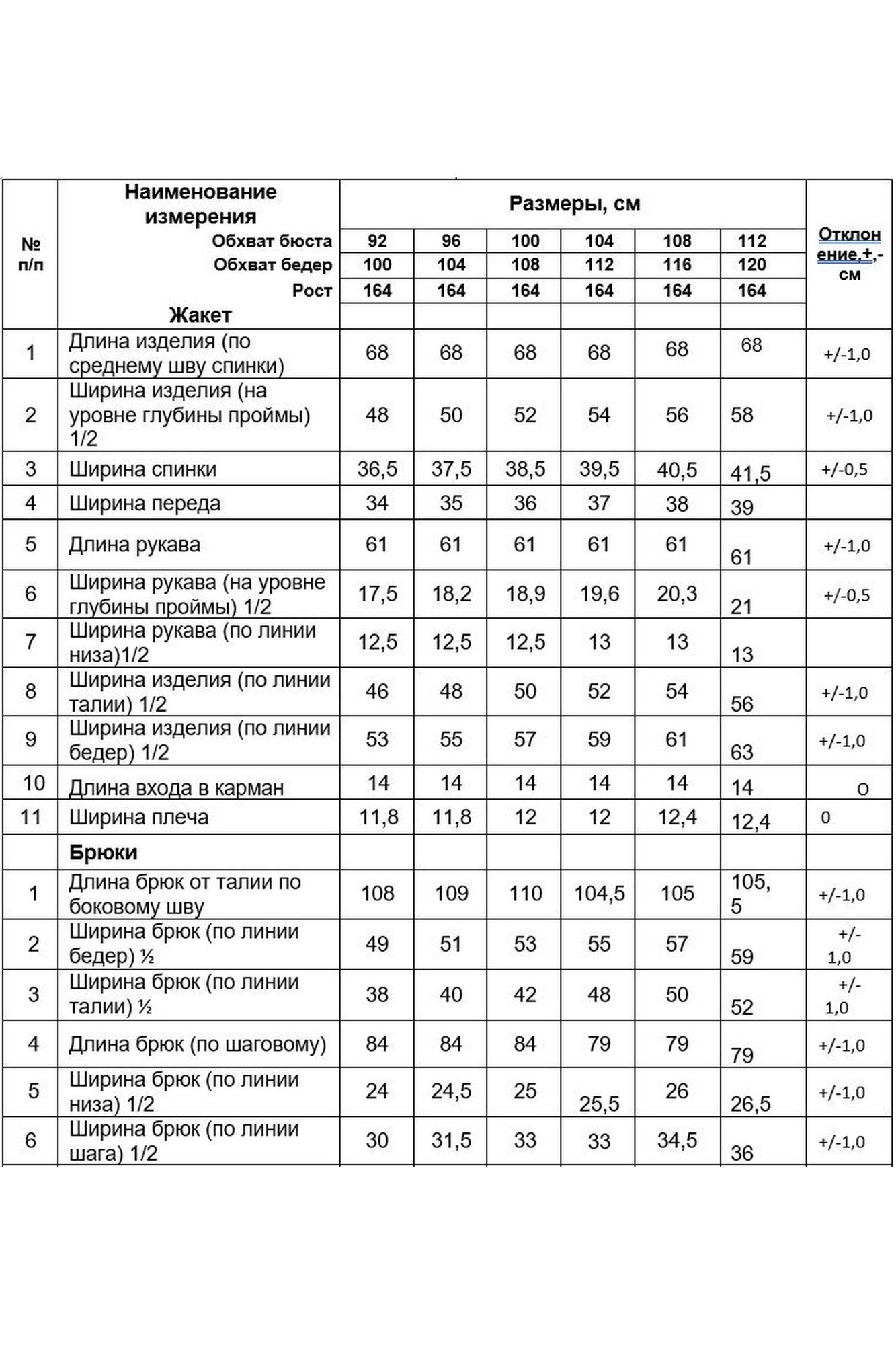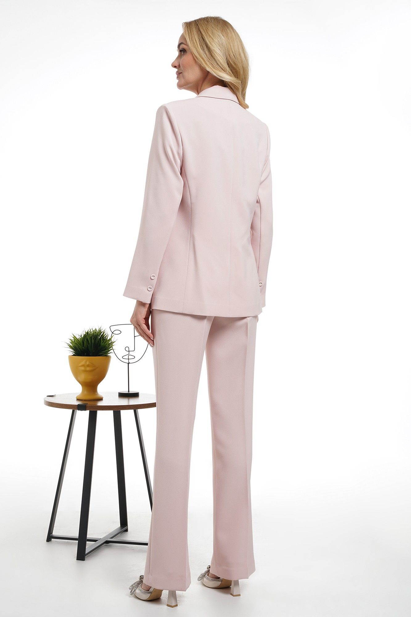 Комплект женский 2-х предметный состоит из жакета и брюк. Жакет полуприлегающего силуэта, частично на подкладке (перед, спинка), с центральной застёжкой на петли, пуговицы. Декорированный съёмным украшением. Перед с отложными лацканами, с рельефными швами, отрезным бочком, прорезными карманами с двумя обтачками. Спинка со средним швом. Рукава втачные, двухшовные, длинные, в локтевой шве шлица декорированная пуговицами. Воротник пиджачного типа. Брюки длинные, типа «клёш» прилегающего силуэта по бёдрам и от линии колена идут на расширение, со сгибом, на притачном поясе, застежкатипа «гульфик» на тесьму-молнию, петлю и пуговицу по поясу. Задние части с талевыми вытачками.