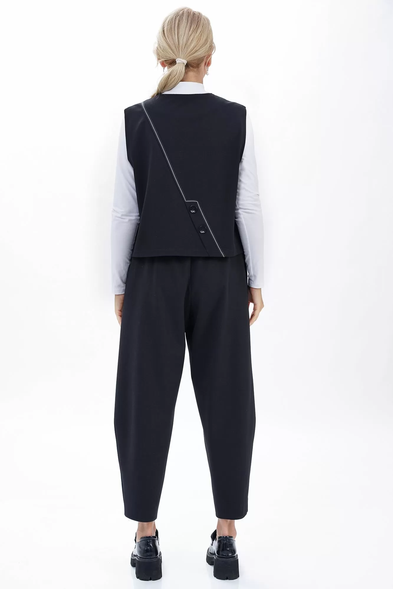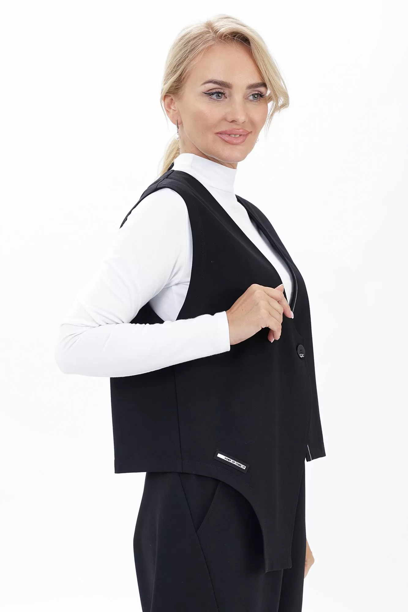 Жилет прямого, свободного силуэта, с застёжкой на петлю, пуговицу, правая часть переда с фигурной линией низа и декорирована нашивкой. Спинка с рельефным швом понизу переходящий в закрытую шлицу с пришивными пуговицами. По левой части переда, по спинки отделочная тесьма.