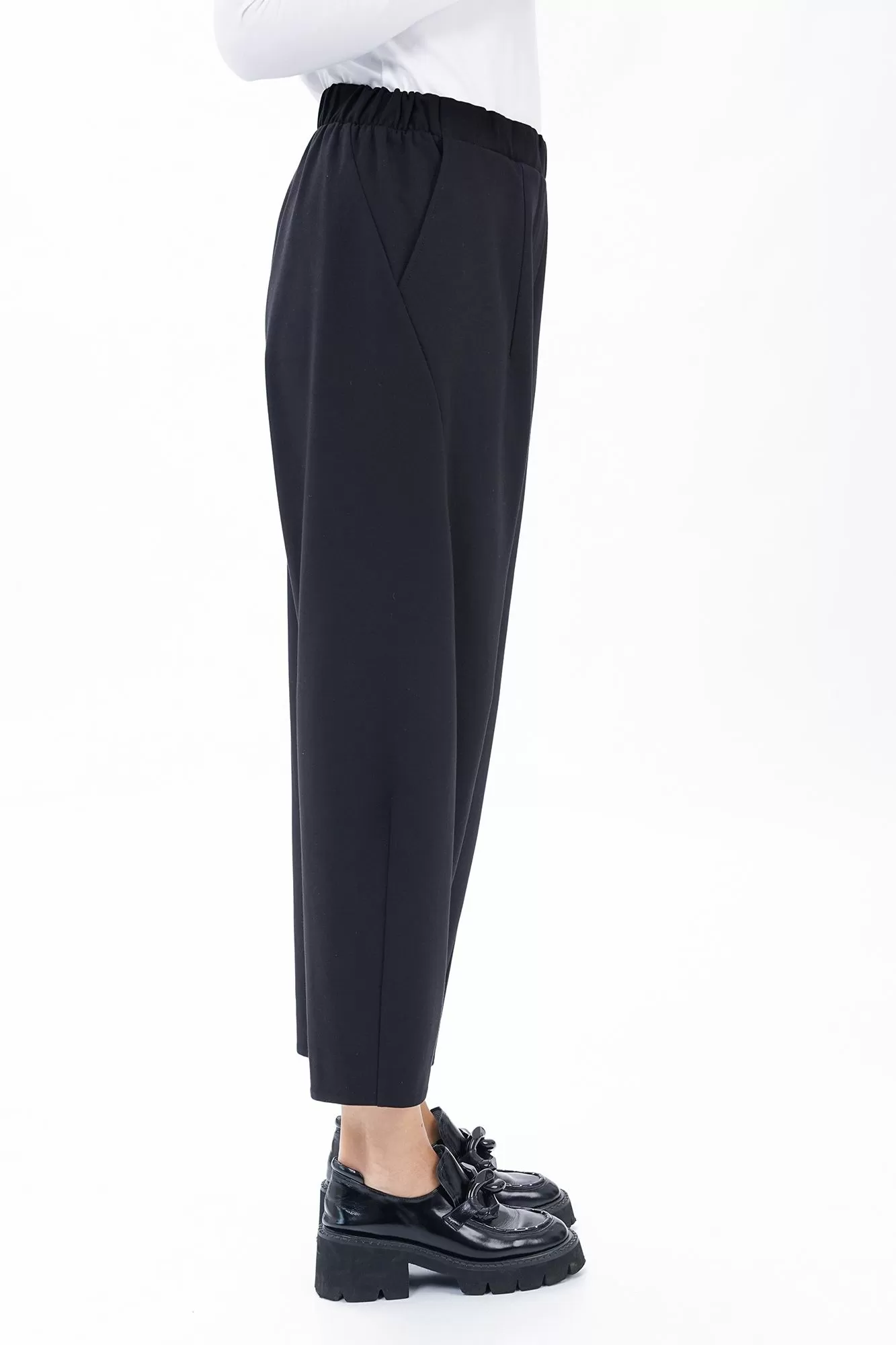 Брюки типа «банан», с притачным поясом на резинке, с имитацией застёжки типа «гульфик». С переходящими на перед фигурными боковыми швами, от линии низа по боковым конструктивные выточки. Низ обработан обтачкой. Передние части с косыми боковыми карманами и талевыми выточками.