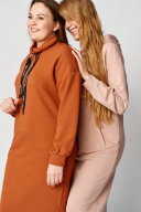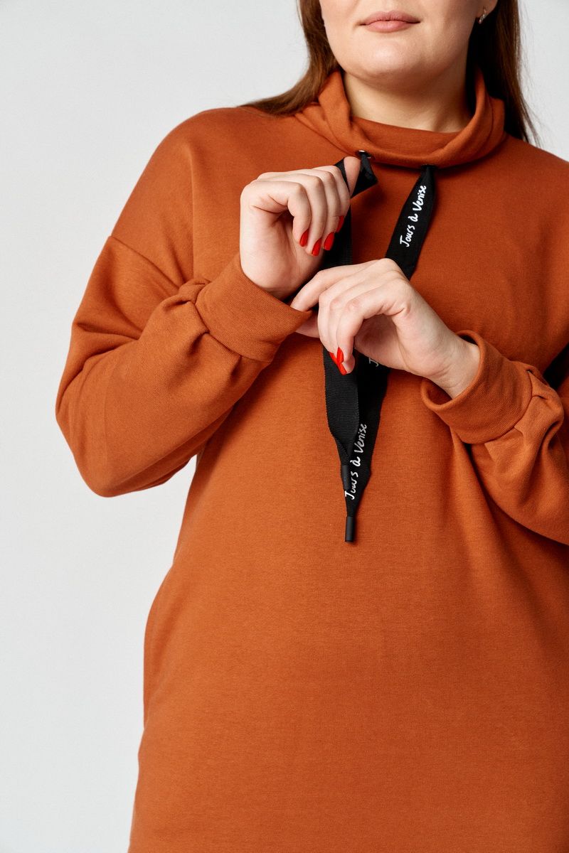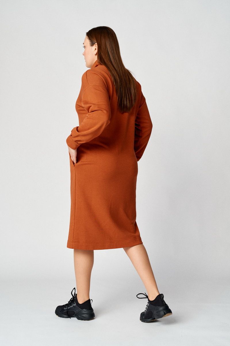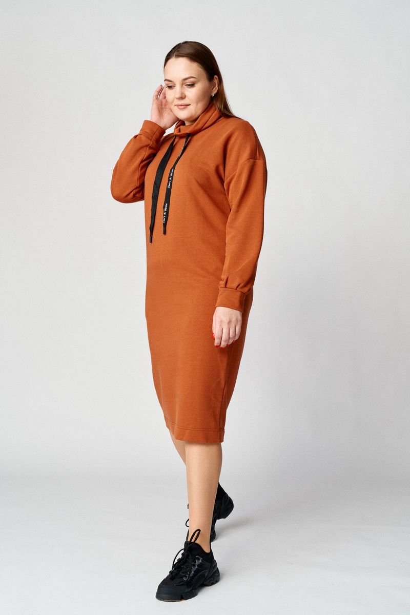 Стильное платье прямого свободного силуэта, чуть заужено к низу. Плечо приспущено, рукав притачной со складками по низу, притачивания манжеты. Горловина округлая, обработана свободным воротником-стойкой с протянутой декоративной тесьмой контрастного цвета. Спинка прямая цельная, перед прямой цельный с функциональными карманами в боковых швах. Длина изделия по спинке: 107 см Длина рукава от горловины: 77 см Длина рукава от проймы: 55 см