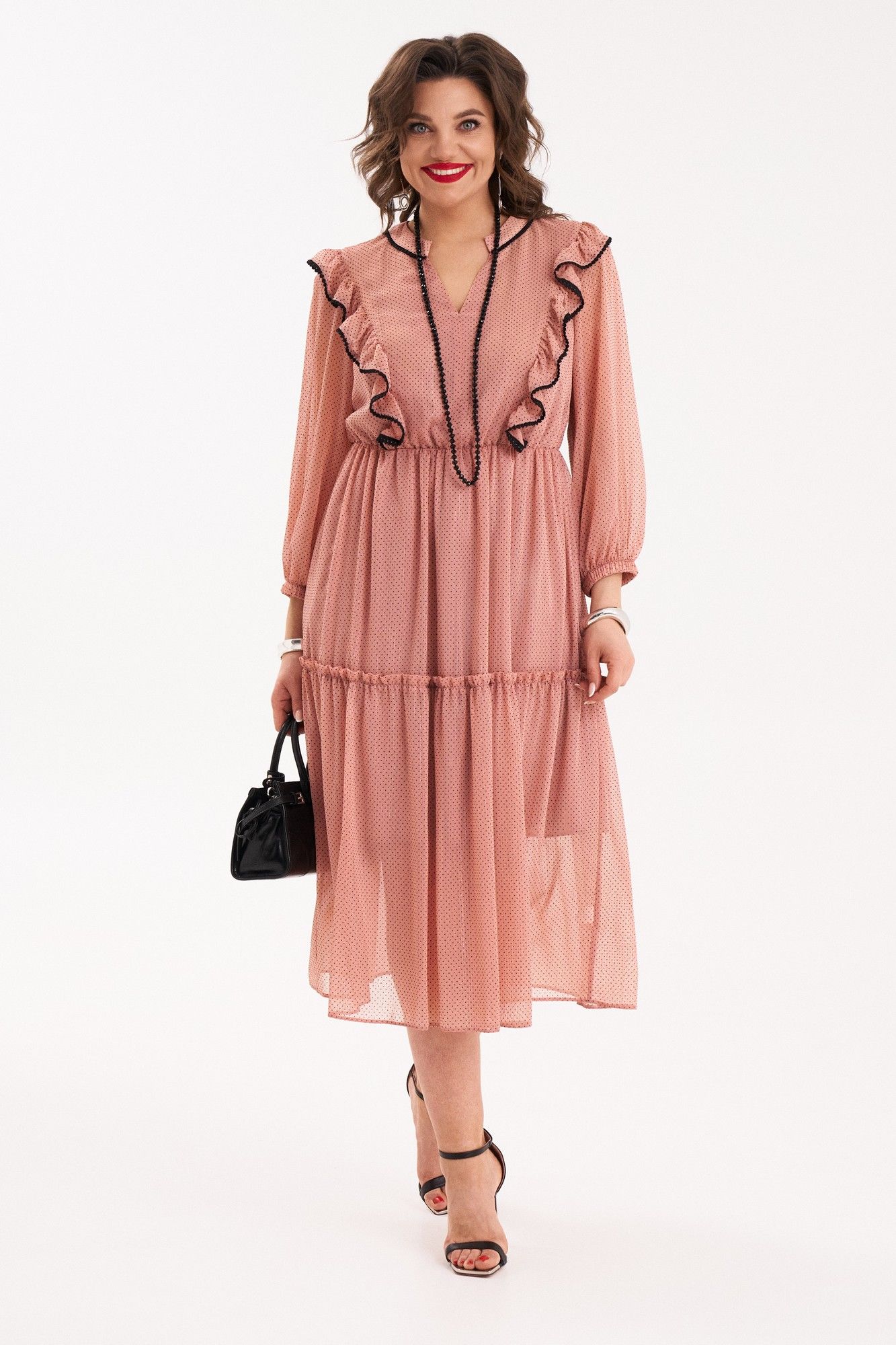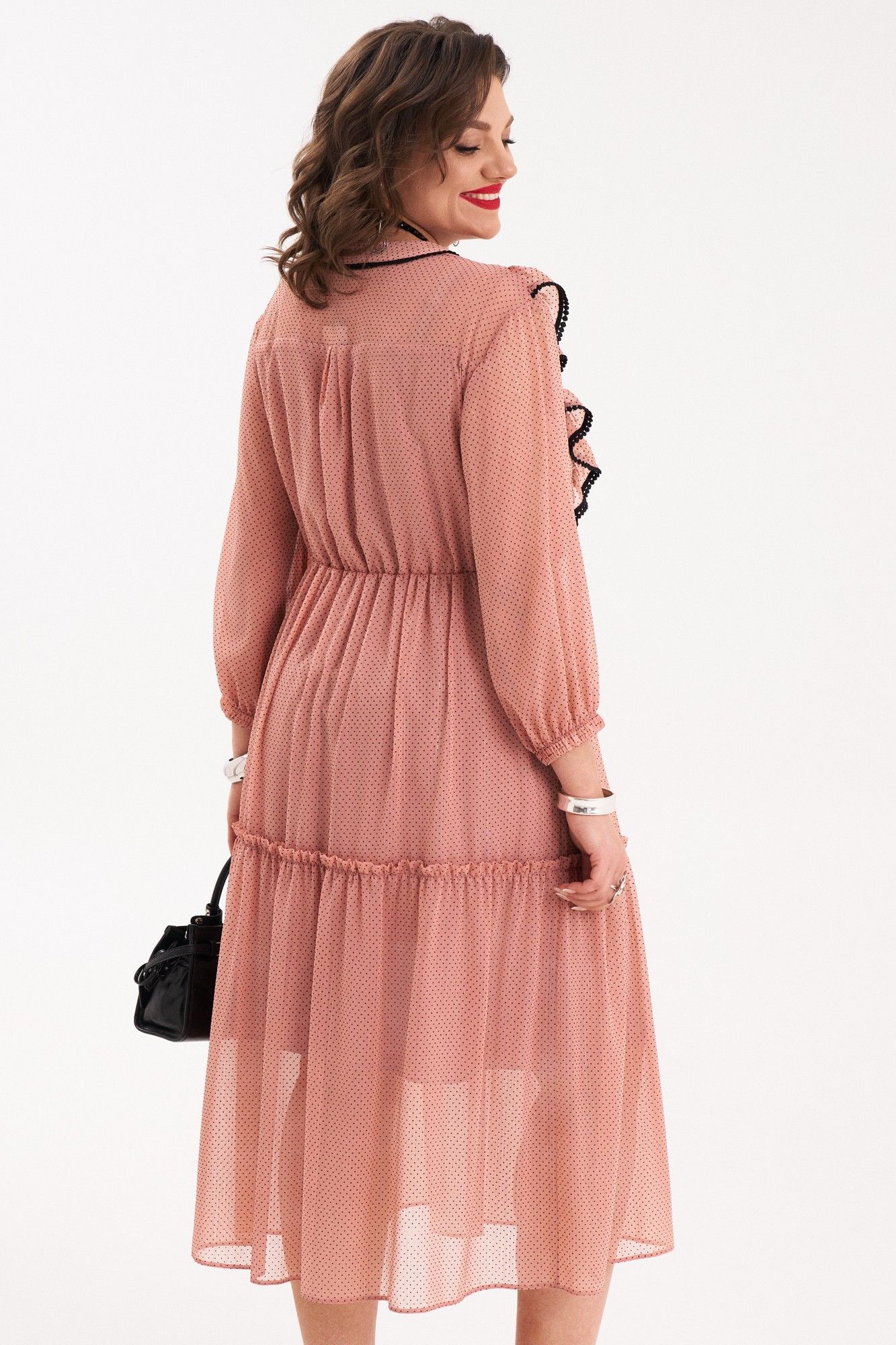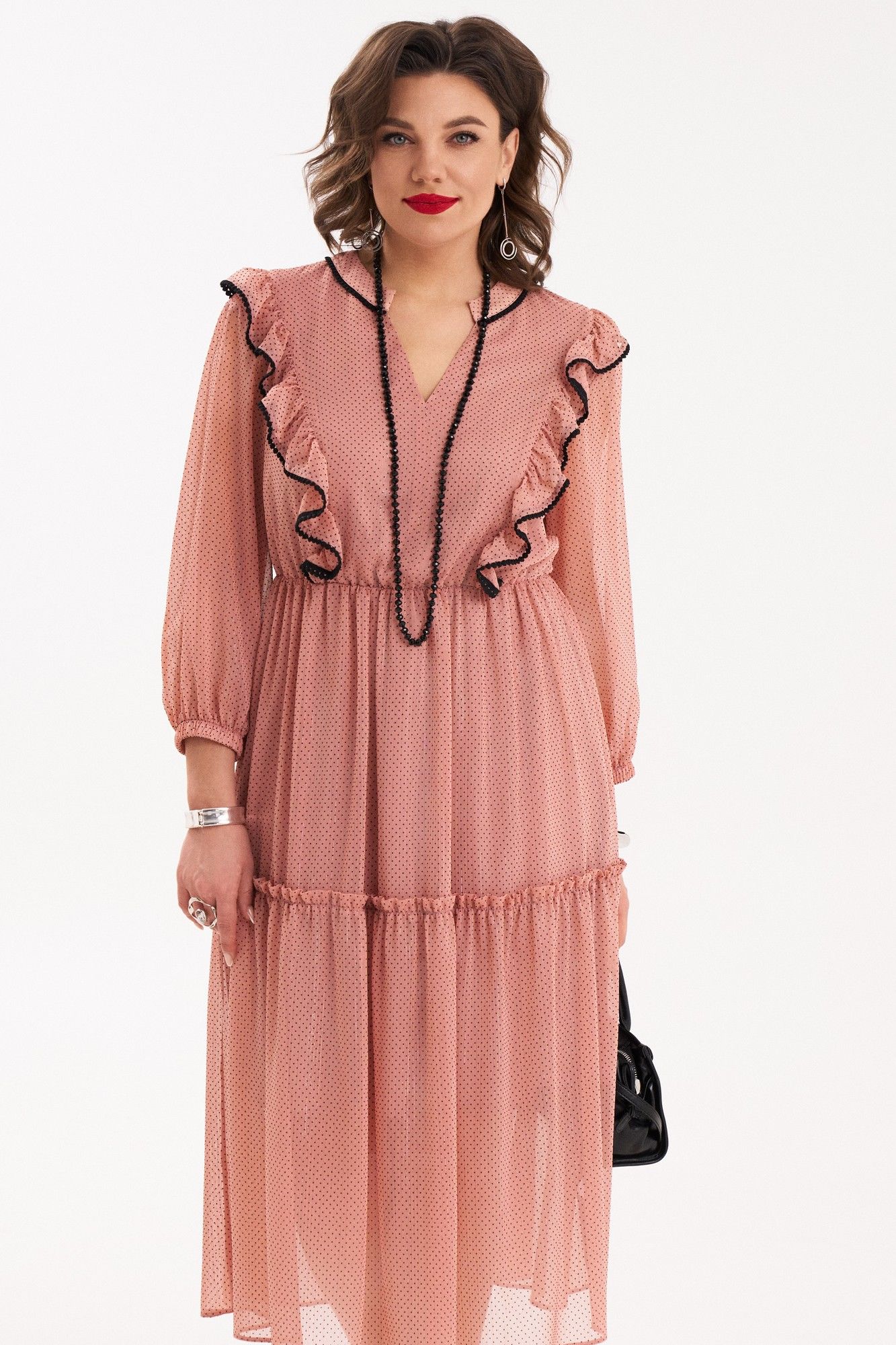Платье женское полуприлегающего силуэта, расклешенного к низу от талии, на подкладке. Платье отрезное по линии талии, собранное на резинку. Верхняя часть переда со средним швом и с рельефами, выходящими из плечевого шва и до талии. В швах рельефов расположены рюши, собранные на сборку и задекорированы черной, отделочной тесьмой. Спинка с притачной кокеткой, в шве которой расположена встречная складка в нижней части. Вырез горловины V-образный. Нижняя часть платья состоит из двух частей, нижняя часть которой собрана на сборку. Воротник – плосколежащая стойка, шов притачивания которой, задекорирован отделочной, черной тесьмой. Рукав втачной, внизу на резинке. В качестве декора используется съемный, тонкий, черный ремень. Платье очень женственное, удобное, не сковывает движения, может подойти на все случаи в жизни, как для вечерних прогулок по городу, так и для торжеств. Длина платья по спинке 117 см, длина рукава 47 см.