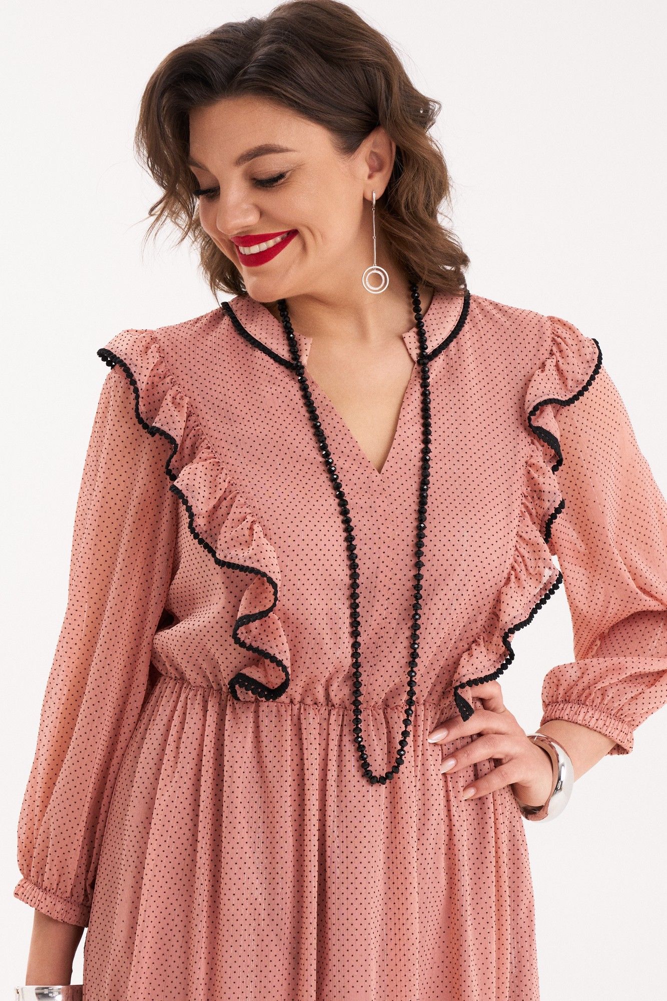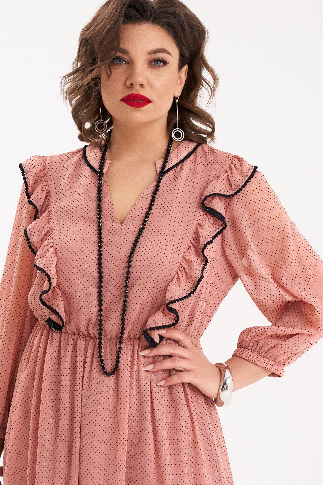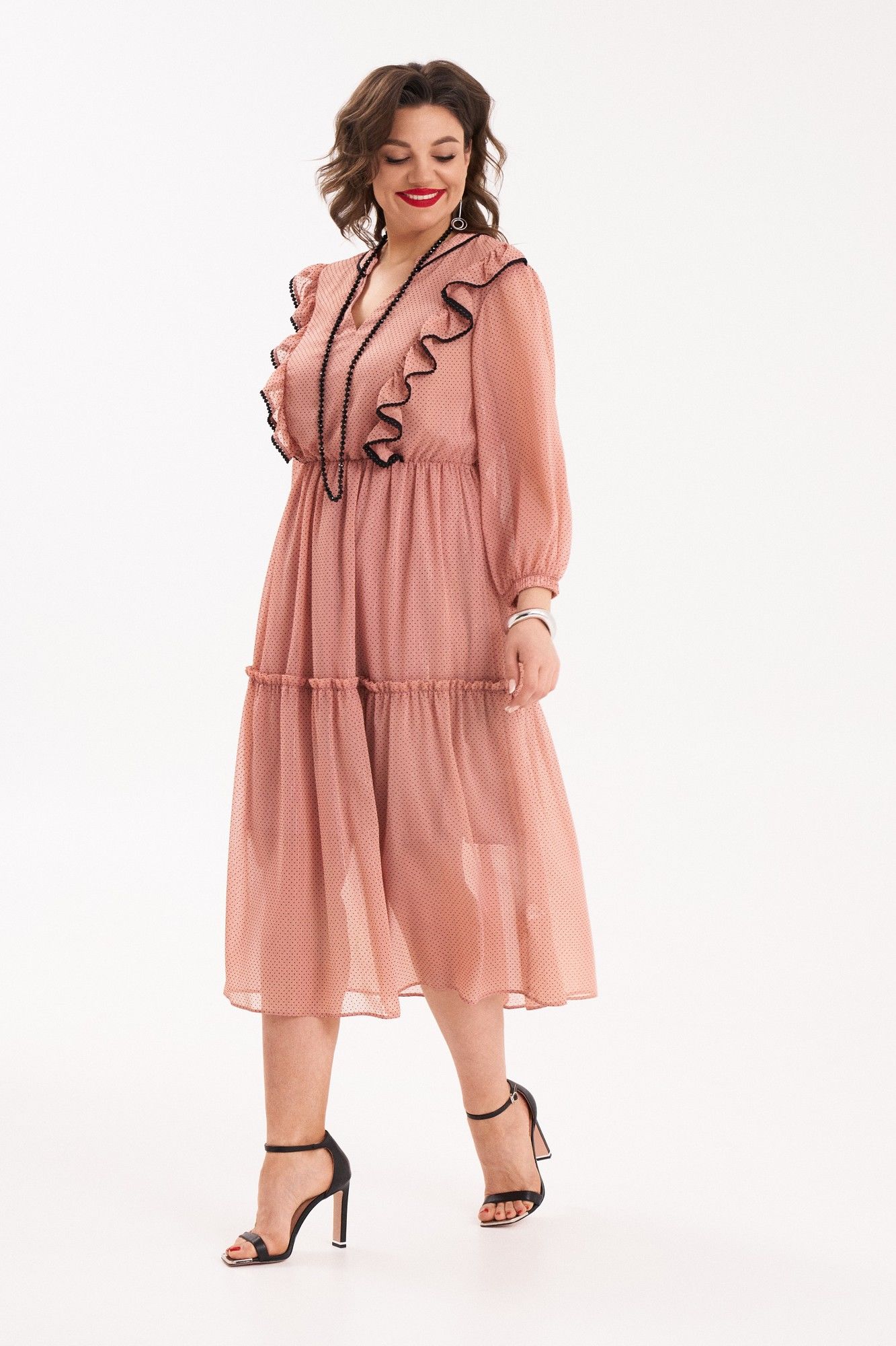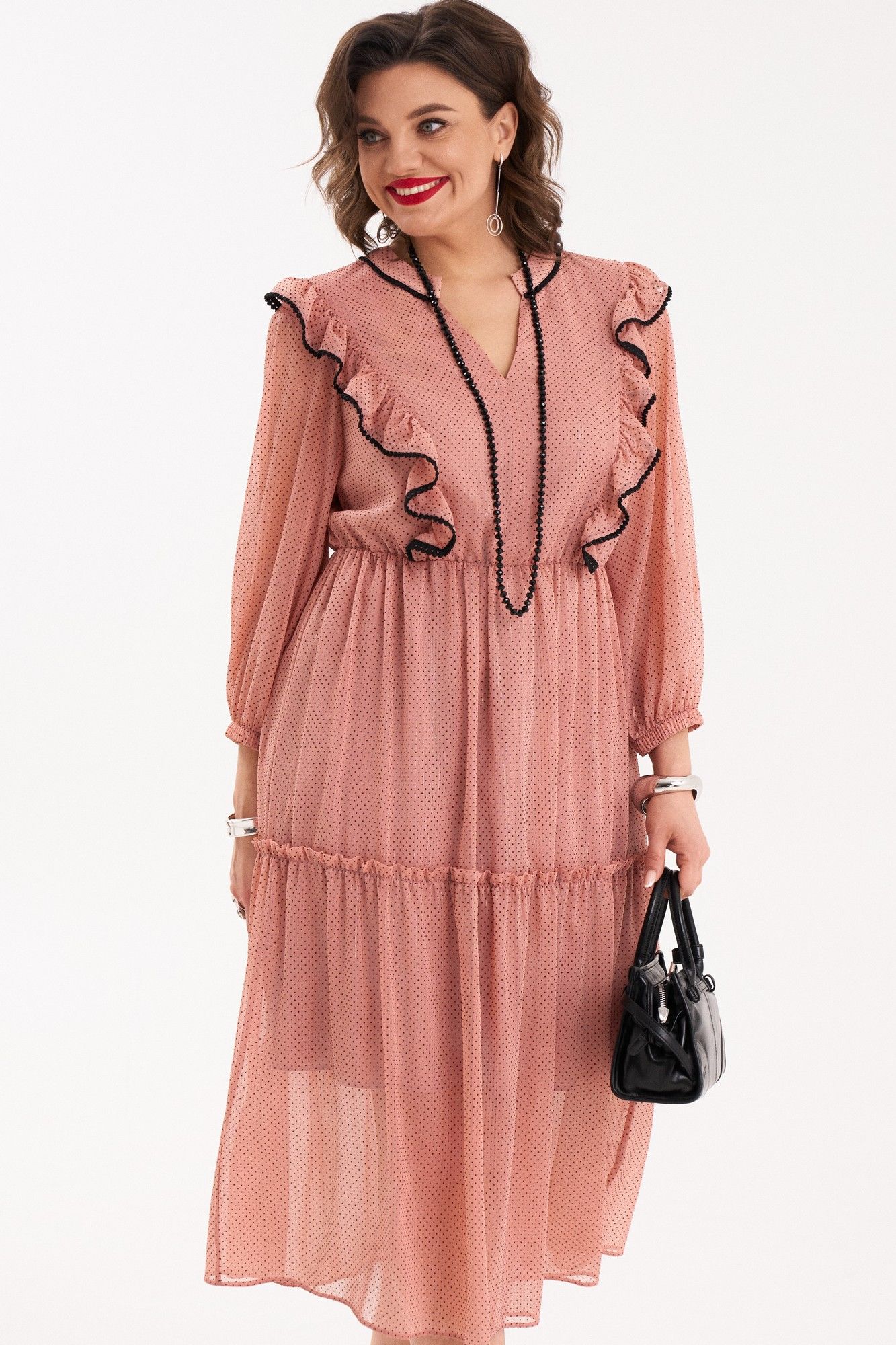 Платье женское полуприлегающего силуэта, расклешенного к низу от талии, на подкладке. Платье отрезное по линии талии, собранное на резинку. Верхняя часть переда со средним швом и с рельефами, выходящими из плечевого шва и до талии. В швах рельефов расположены рюши, собранные на сборку и задекорированы черной, отделочной тесьмой. Спинка с притачной кокеткой, в шве которой расположена встречная складка в нижней части. Вырез горловины V-образный. Нижняя часть платья состоит из двух частей, нижняя часть которой собрана на сборку. Воротник – плосколежащая стойка, шов притачивания которой, задекорирован отделочной, черной тесьмой. Рукав втачной, внизу на резинке. В качестве декора используется съемный, тонкий, черный ремень. Платье очень женственное, удобное, не сковывает движения, может подойти на все случаи в жизни, как для вечерних прогулок по городу, так и для торжеств. Длина платья по спинке 117 см, длина рукава 47 см.