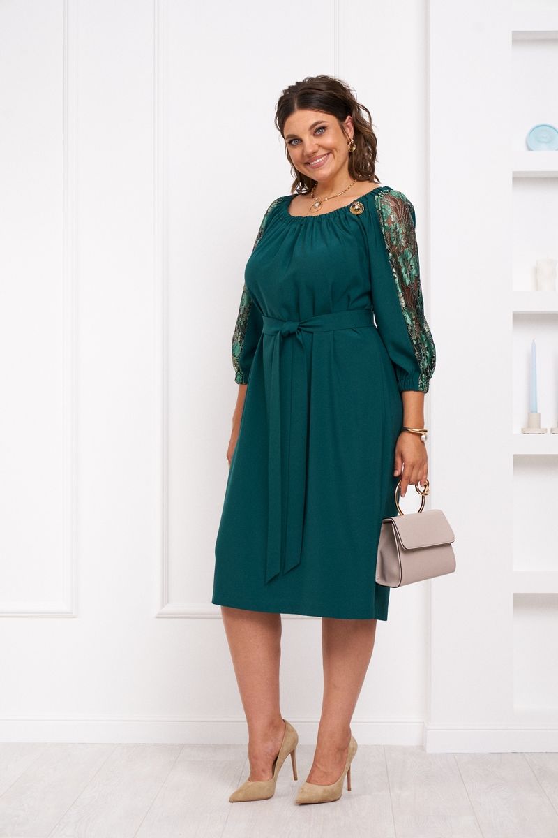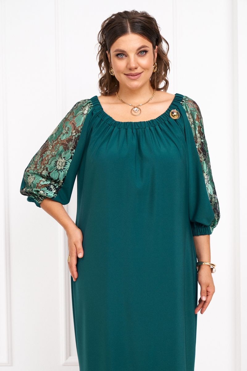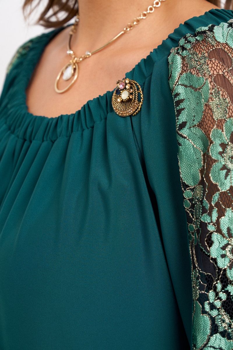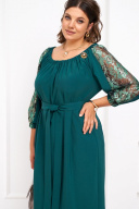 Нарядное женское платье свободного силуэта со сборкой по переду и спинке. Внизу по спинке разрез. Рукав реглан со вставкой по центру из гипюра, по низу рукава резинка. Линия талии подчеркивается поясом. Длина спинки - 103 см. Длина рукава от горловины - 57 см. 50 размер: ОГ- 126см, ОБ- 122см; 52 размер: ОГ-130см, ОБ - 126см. 54 размер ОГ - 134 см, ОБ- 130см.