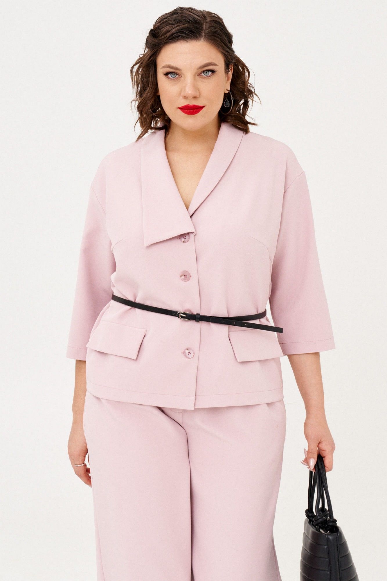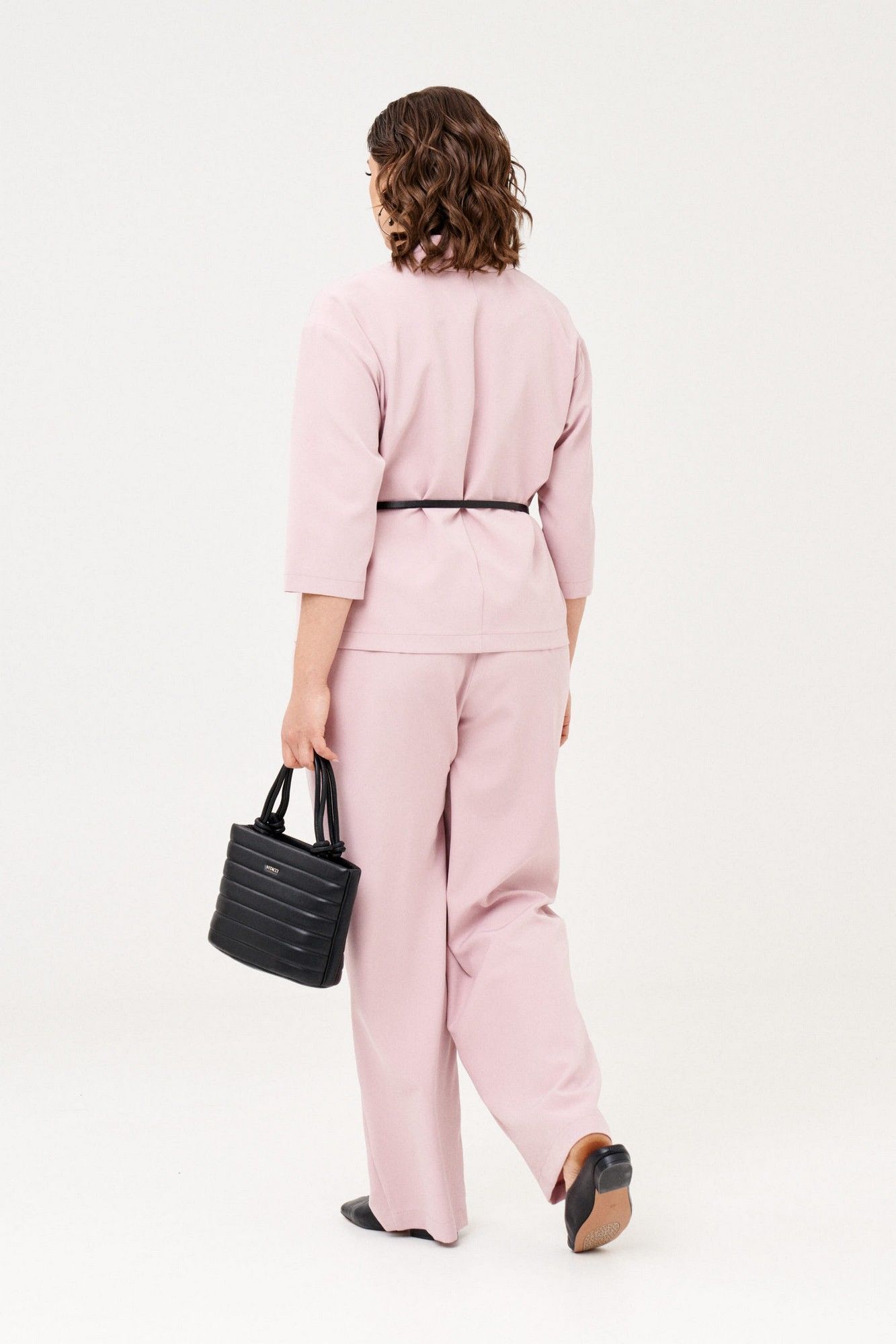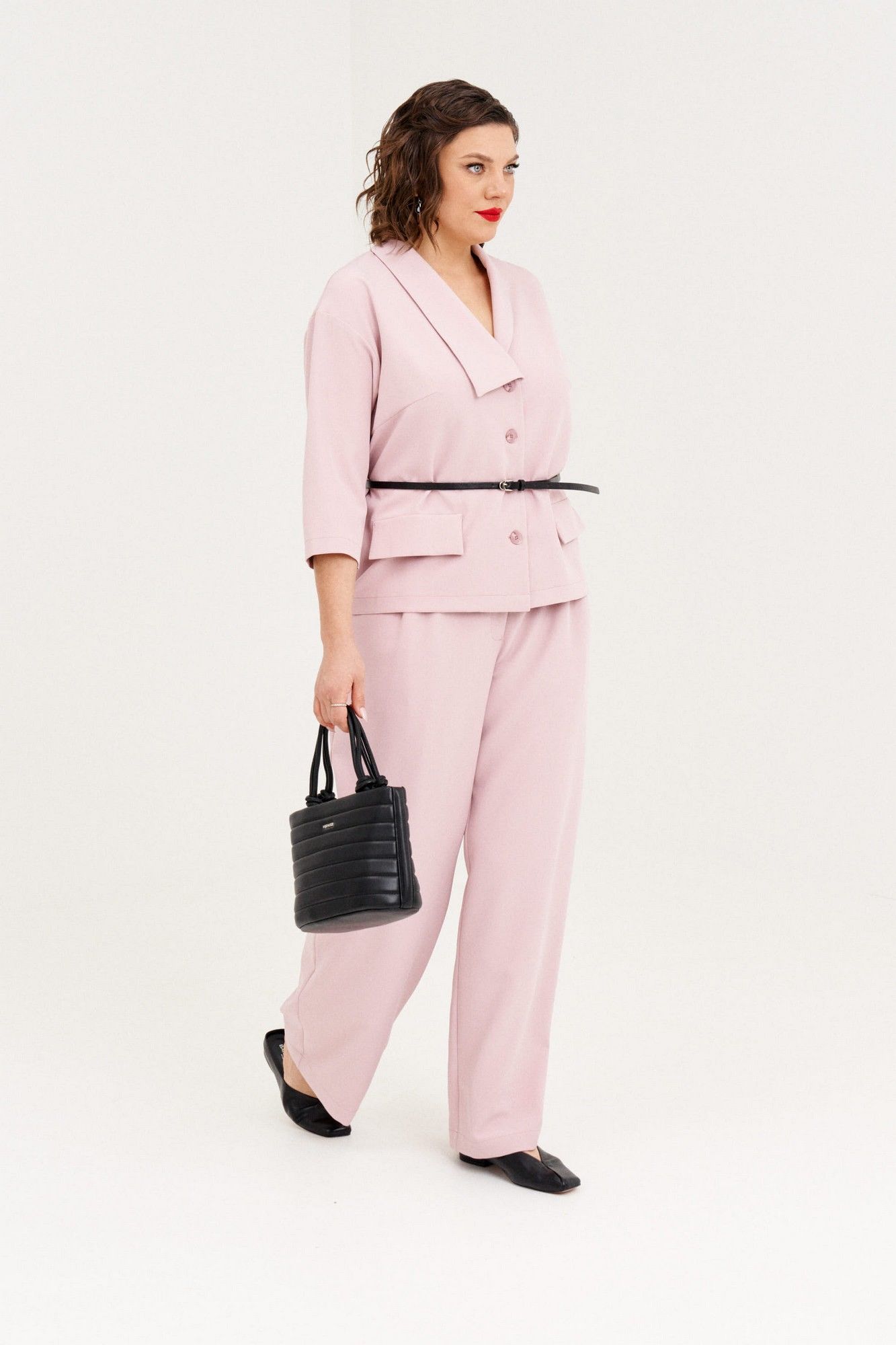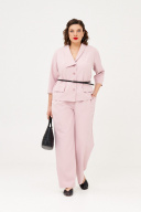 Эффектный женский костюм состоит из жакета без подкладки и брюк.Жакет прямого силуэта , спущена линия плеча. По переду клапаны, воротник ассиметричной формы. Центральная застежка на петли и пуговицы. Рукав 3/4. Линия талии подчеркнута съемным поясом. Брюки свободного покроя со складками вверху, широкие.Пояс притачной по линии талии, резинка сзади. По переду боковые внутренние карманы. Застежка спереди на молнию. 50 размер: ОГ- 108см, ОТ - 106 см, ОБ - 114см; ОТ брюк - 76см, растягивается до 88см, ОБ 116см. 52 размер: ОГ - 112см, ОТ- 110 см, ОБ- 118 см. ОТ брюк - 80см, растягивается до 92см, ОБ 120см. 54 размер: ОГ - 116 см, ОТ - 114 см, ОБ - 122 см, ОТ брюк - 84см, растягивается до 96см, ОБ 124см. Длина жакета 60 см, длина брюк 103см.