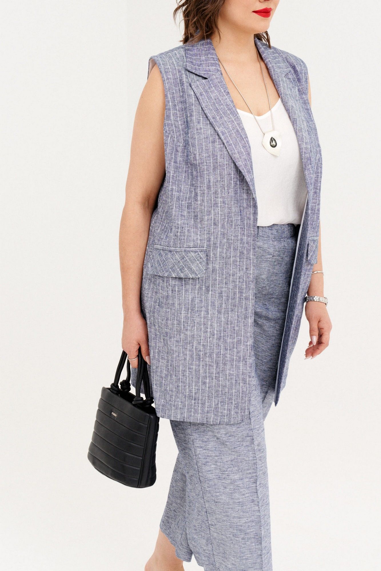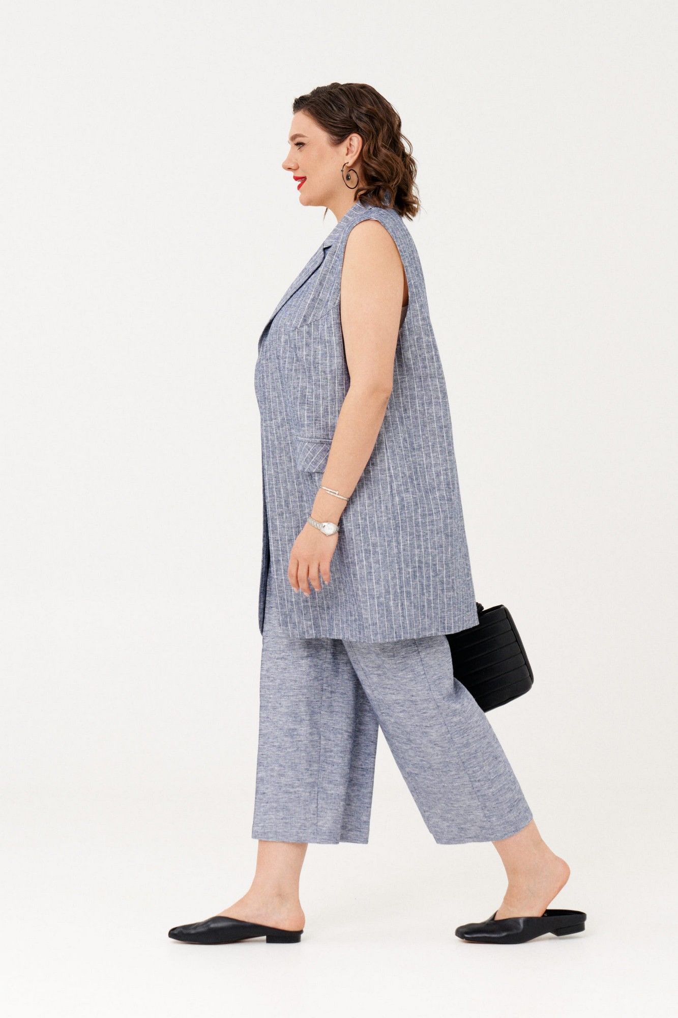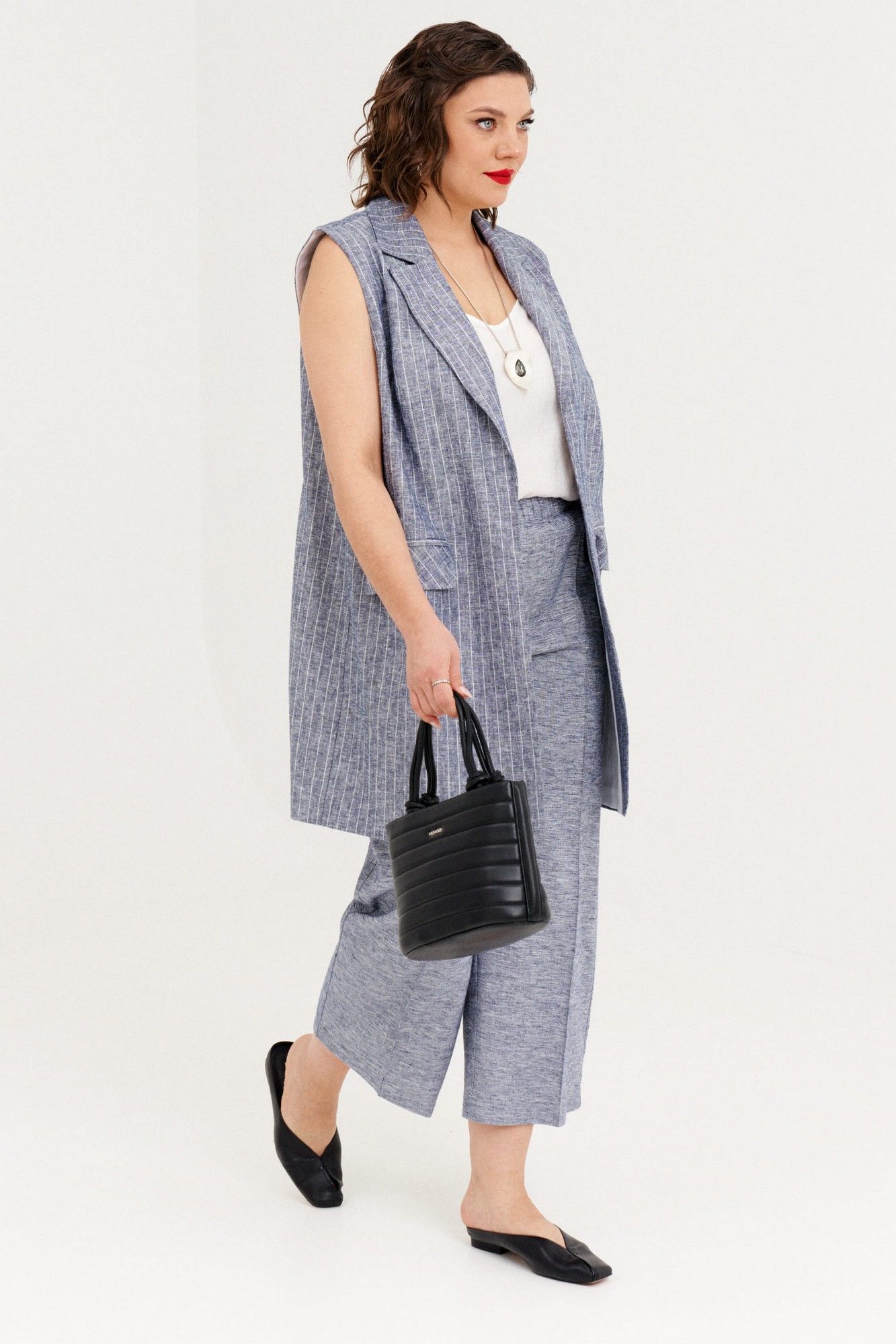 Стильный льняной комплект состоит из жилета и брюк. Жилет прямого силуэта, на подкладке, без застежки, удлиненный.По переду прорезные карманы, воротник пиджачного типа с лацканом. Брюки укороченные, широкие, без застежки, по переду защип. По линии талиипритачной пояс на резинке. В боковых швах внутренние карманы. В 50 размере: ОГ -116см, ОБ 120см, длина - 86 см; ОТ брюк -70 см, растягивается до 106см, ОБ 114 см, длина 91см; В 52 размере: ОГ -120см, ОБ 124см, длина - 86 см; ОТ брюк -74 см, растягивается до 110см, ОБ 118 см, длина 91см; В 54 размере: ОГ -124см, ОБ 128см, длина - 86 см; ОТ брюк -78 см, растягивается до 114см, ОБ 122см, длина 91см.