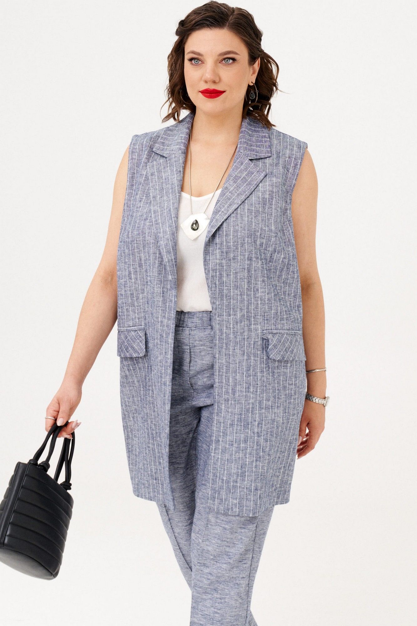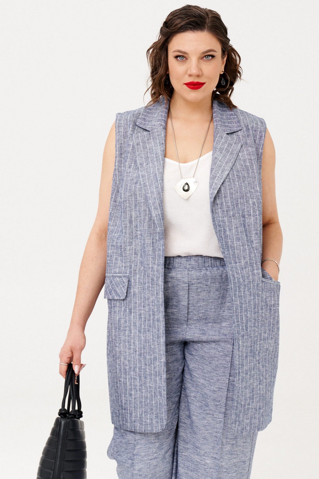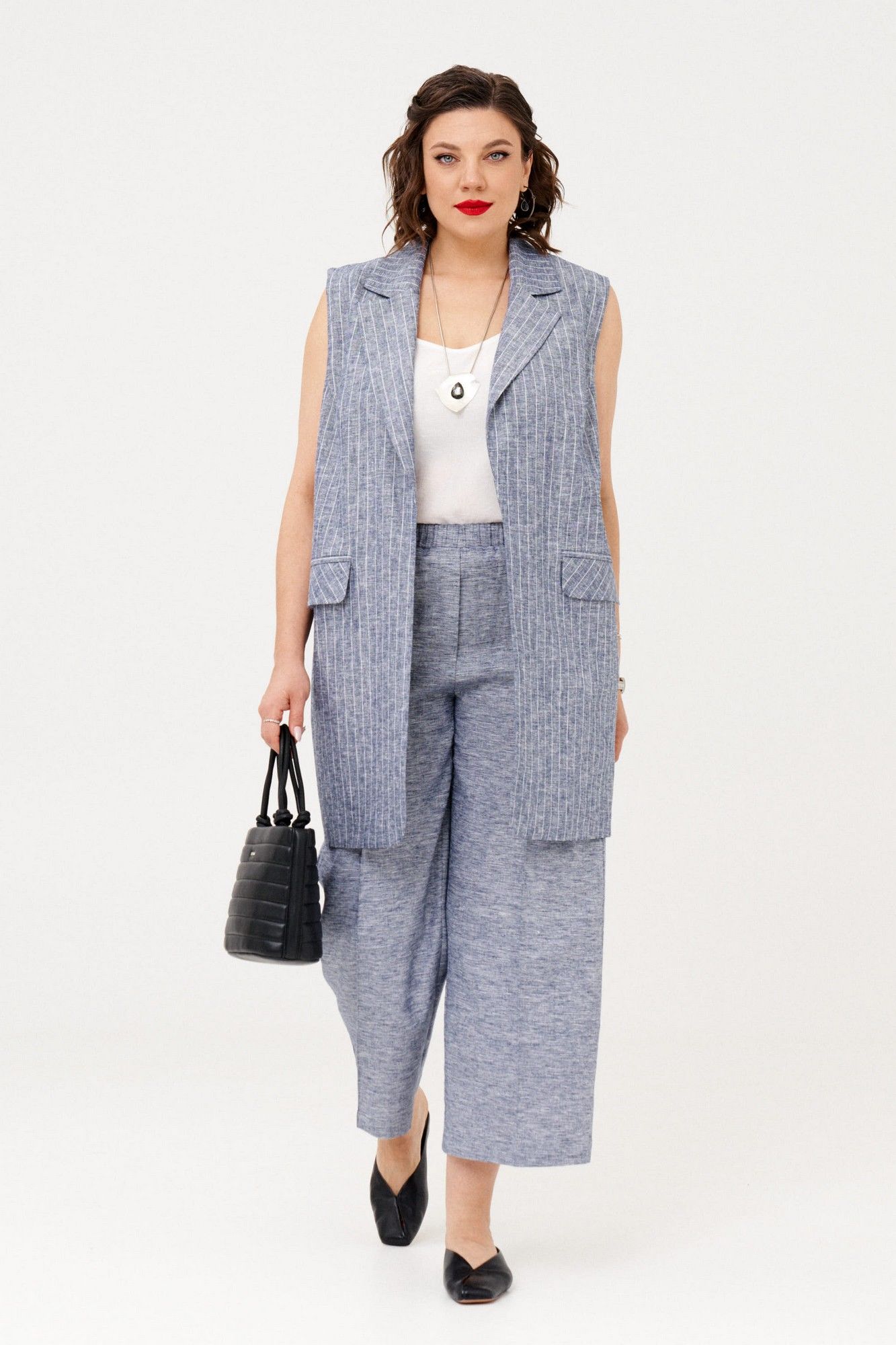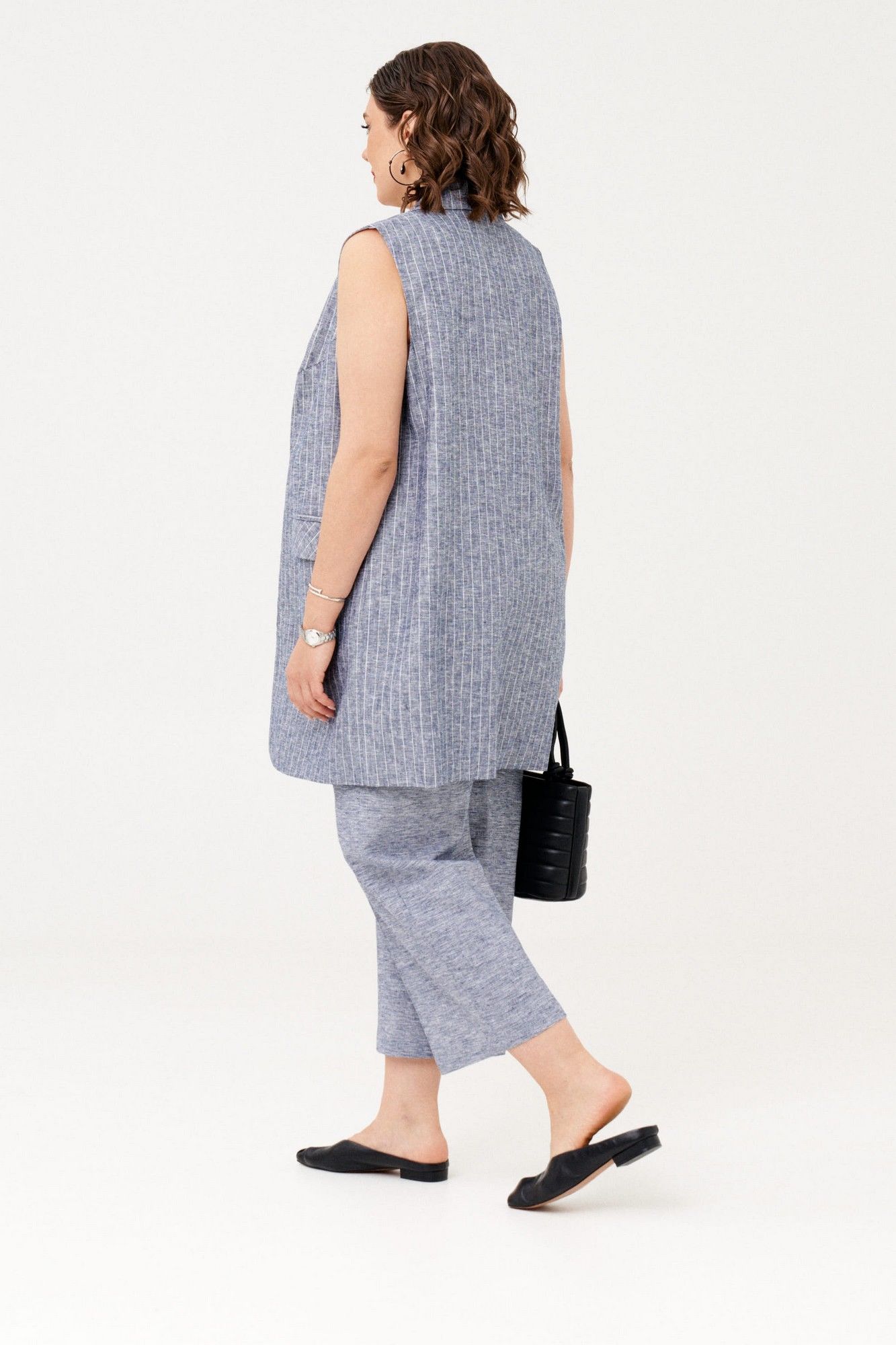 Стильный льняной комплект состоит из жилета и брюк. Жилет прямого силуэта, на подкладке, без застежки, удлиненный.По переду прорезные карманы, воротник пиджачного типа с лацканом. Брюки укороченные, широкие, без застежки, по переду защип. По линии талиипритачной пояс на резинке. В боковых швах внутренние карманы. В 50 размере: ОГ -116см, ОБ 120см, длина - 86 см; ОТ брюк -70 см, растягивается до 106см, ОБ 114 см, длина 91см; В 52 размере: ОГ -120см, ОБ 124см, длина - 86 см; ОТ брюк -74 см, растягивается до 110см, ОБ 118 см, длина 91см; В 54 размере: ОГ -124см, ОБ 128см, длина - 86 см; ОТ брюк -78 см, растягивается до 114см, ОБ 122см, длина 91см.