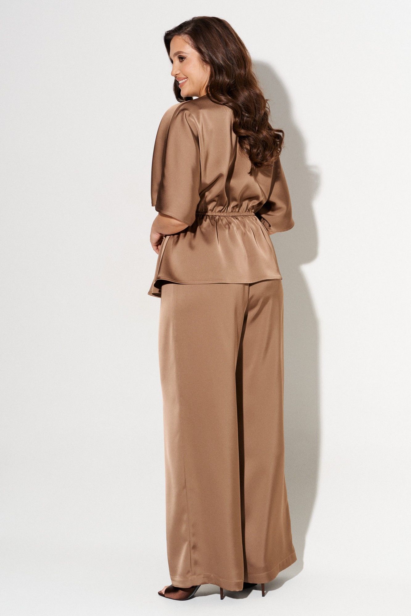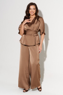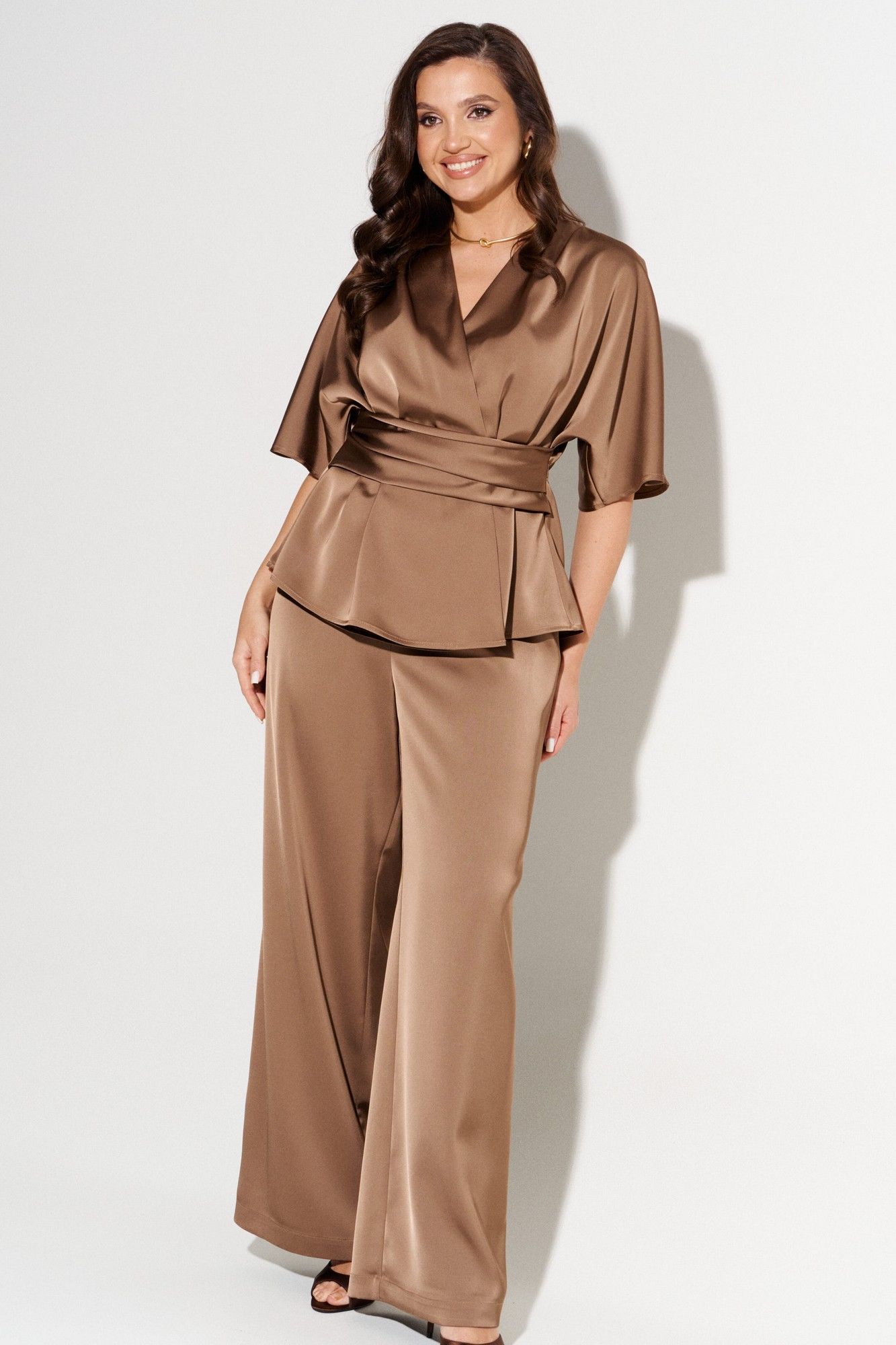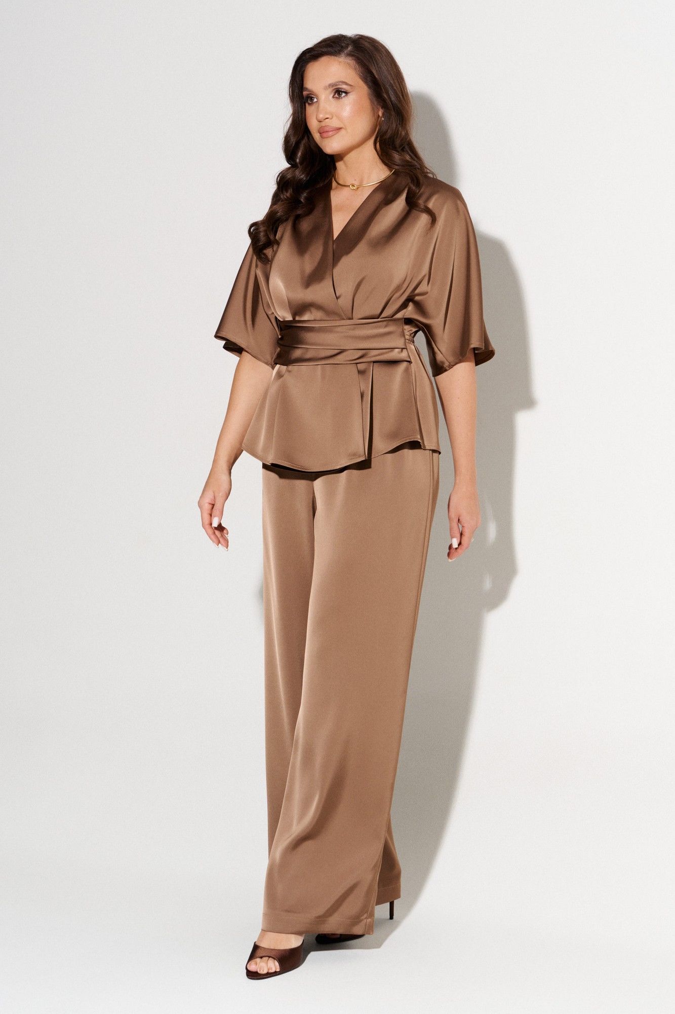 Костюм брючный, состоящий из блузки длиной 62см и брюк длиной по боковому шву 110см. Блузка на запах застегивается на потайные кнопки, талия на резинке по снипке, перед декорирован поясом. Рукав цельнокроенный длиной 44см. Брюки прямого кроя, на резинке.
