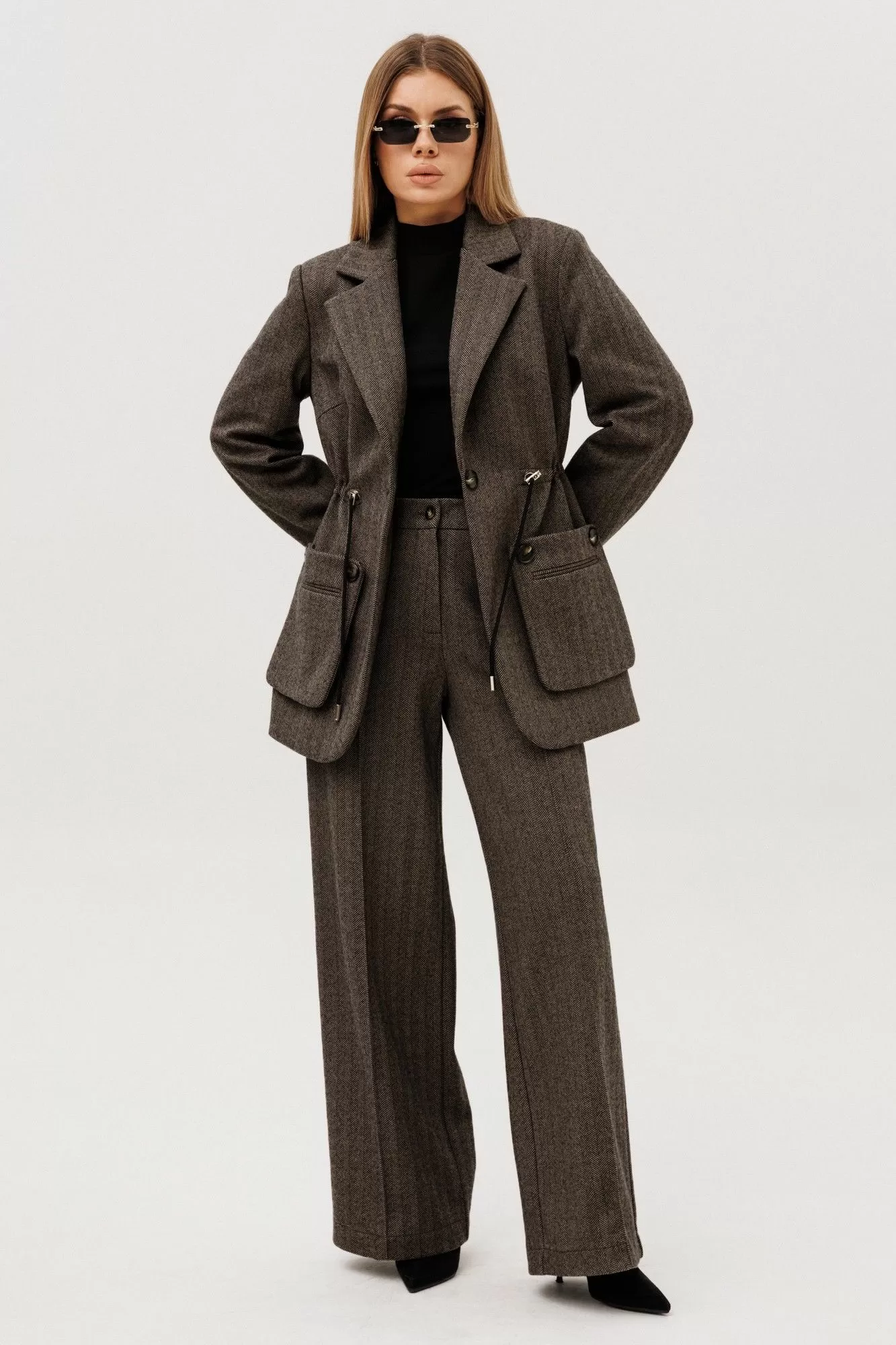 Жакет свободного силуэта с регулирующей кулисой по линии талии.Застежка на петлю пуговицу.По переду действующие накладные карманы.Изделие на подкладке.Изделие из утепленной ткани.