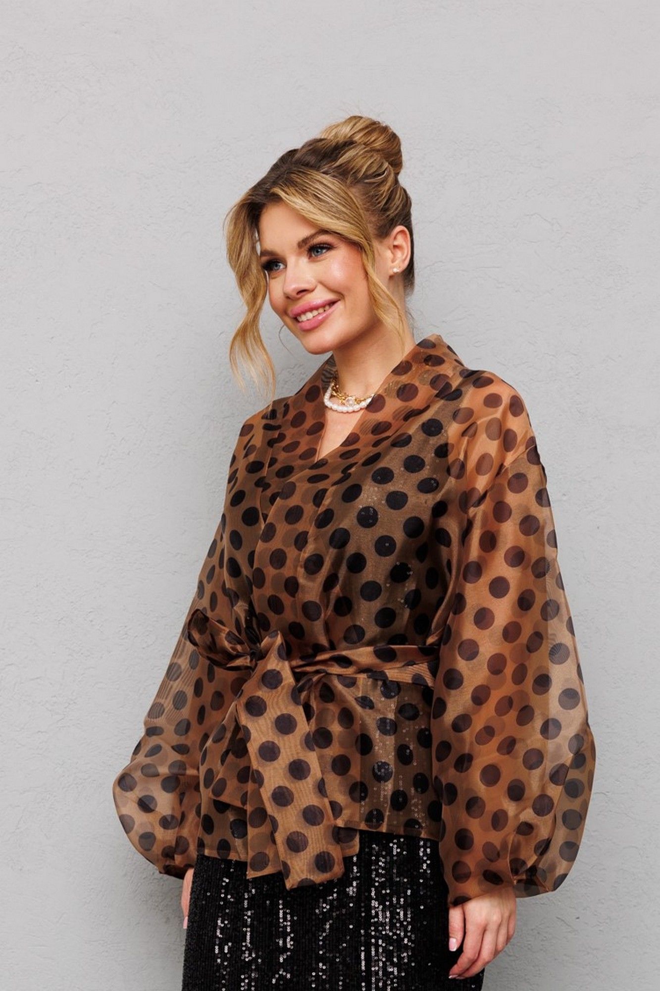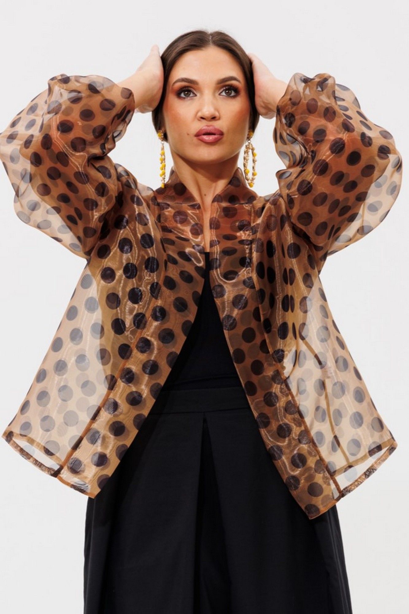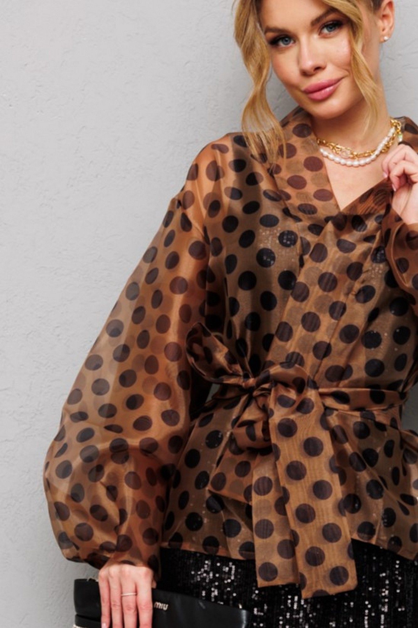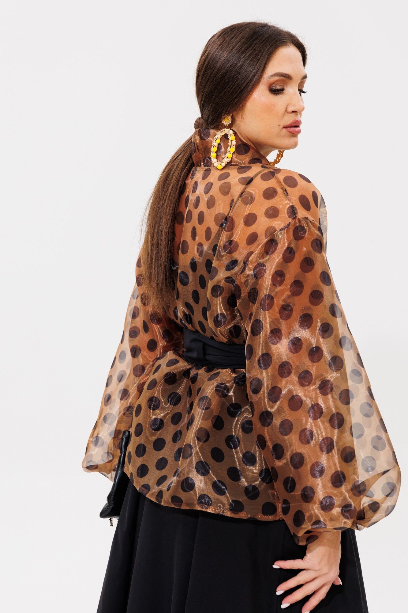 Туника женская прямого силуэта из органзы в горохи со спущенной линией плеча. С ее помощью легко можно трансформировать повседневный образ в праздничный. Идеально сочетается с брюками , юбкой , платьем. Рукав двойной, расширенный к низу со складками. По спинке и полочке идет планка. В комплекте с туникой идет съемный пояс. Длина спинки(48-56)-66 см. Длина рукава: (48-56)-53см.