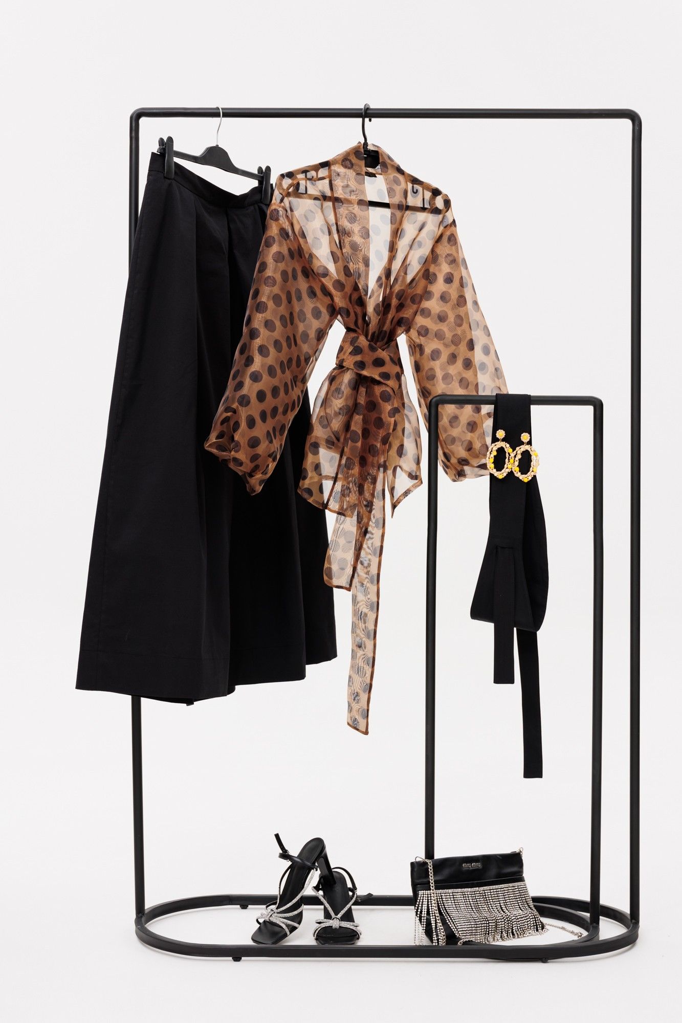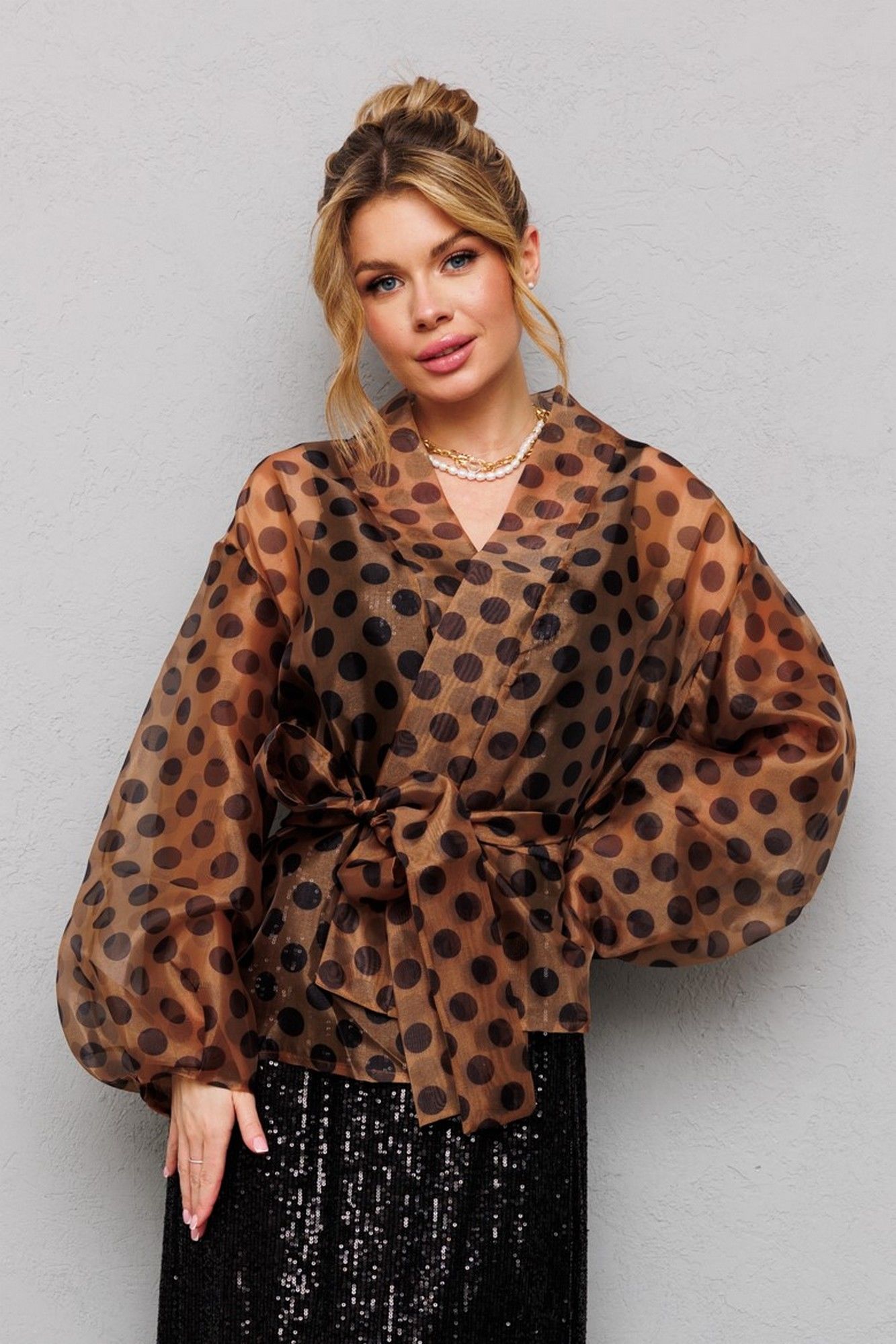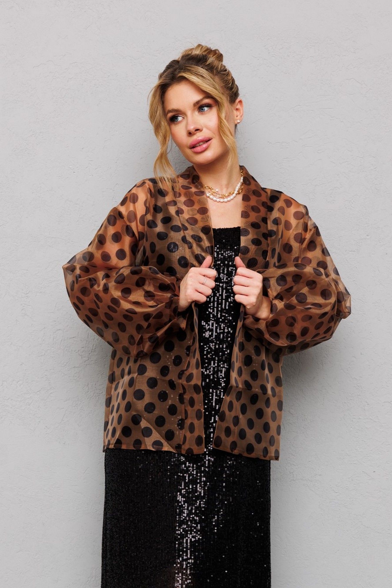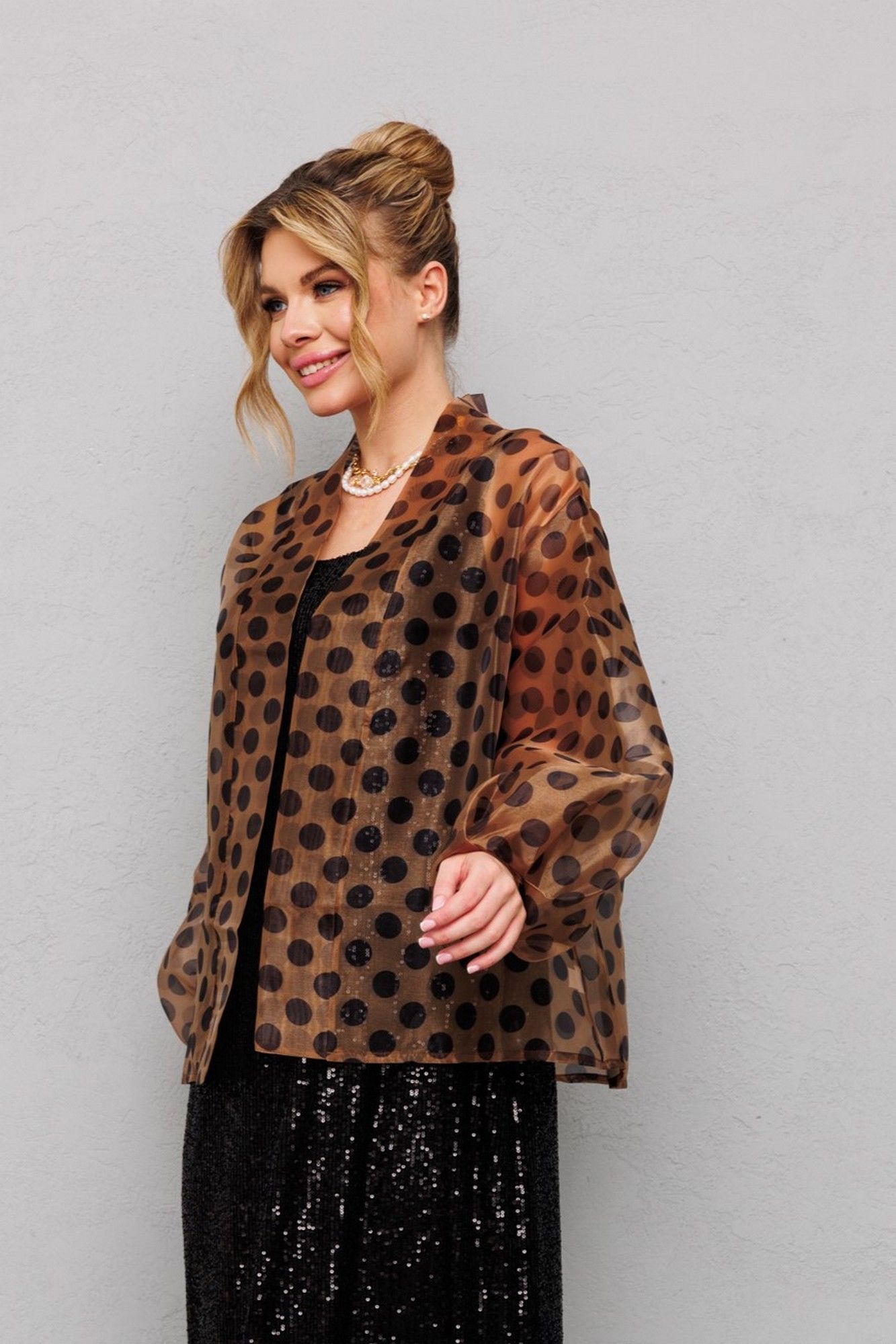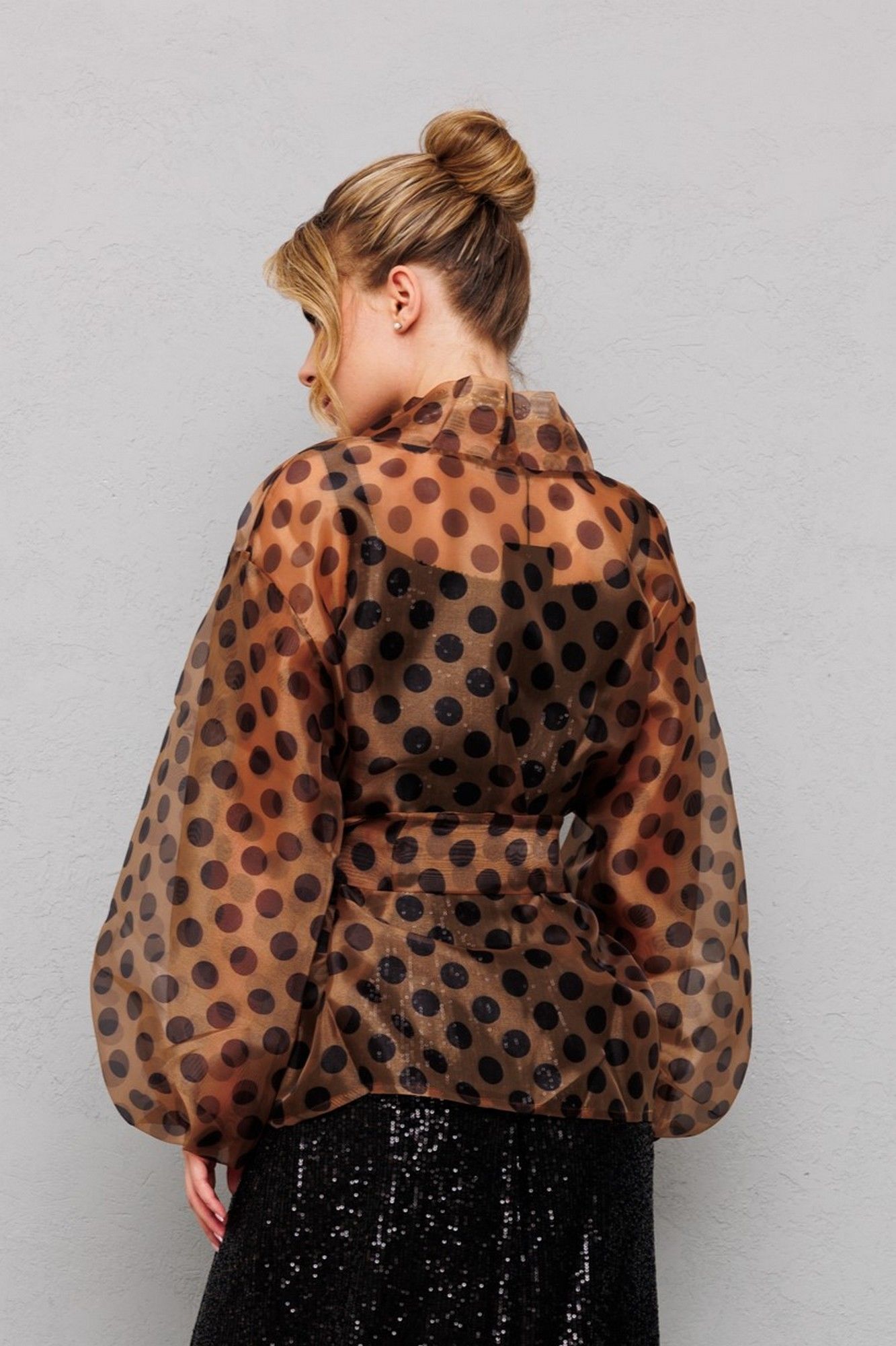 Туника женская прямого силуэта из органзы в горохи со спущенной линией плеча. С ее помощью легко можно трансформировать повседневный образ в праздничный. Идеально сочетается с брюками , юбкой , платьем. Рукав двойной, расширенный к низу со складками. По спинке и полочке идет планка. В комплекте с туникой идет съемный пояс. Длина спинки(48-56)-66 см. Длина рукава: (48-56)-53см.