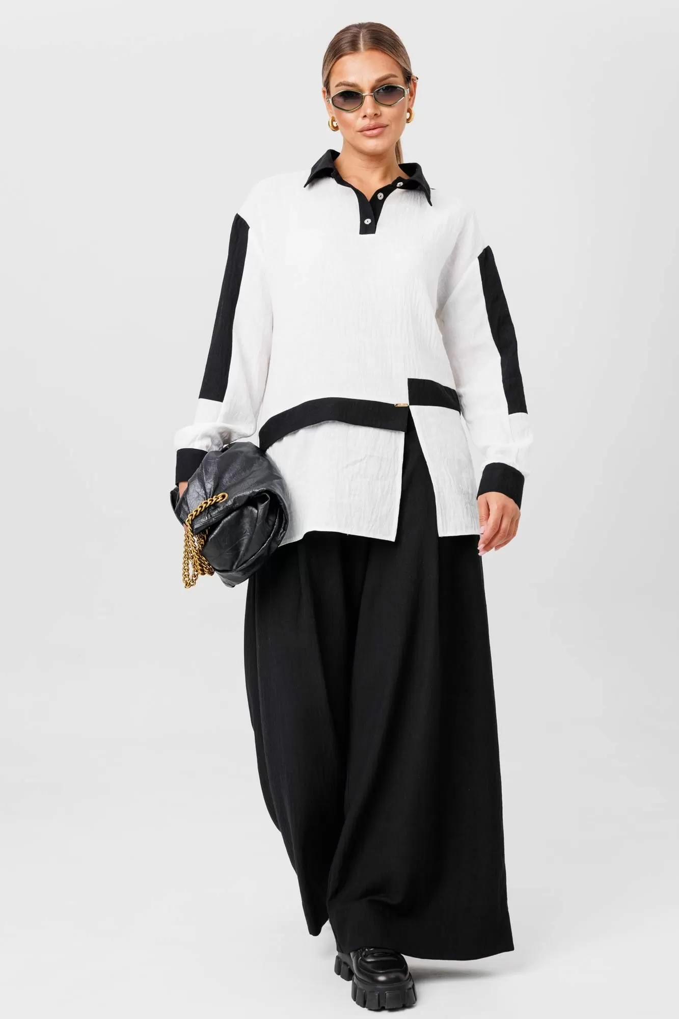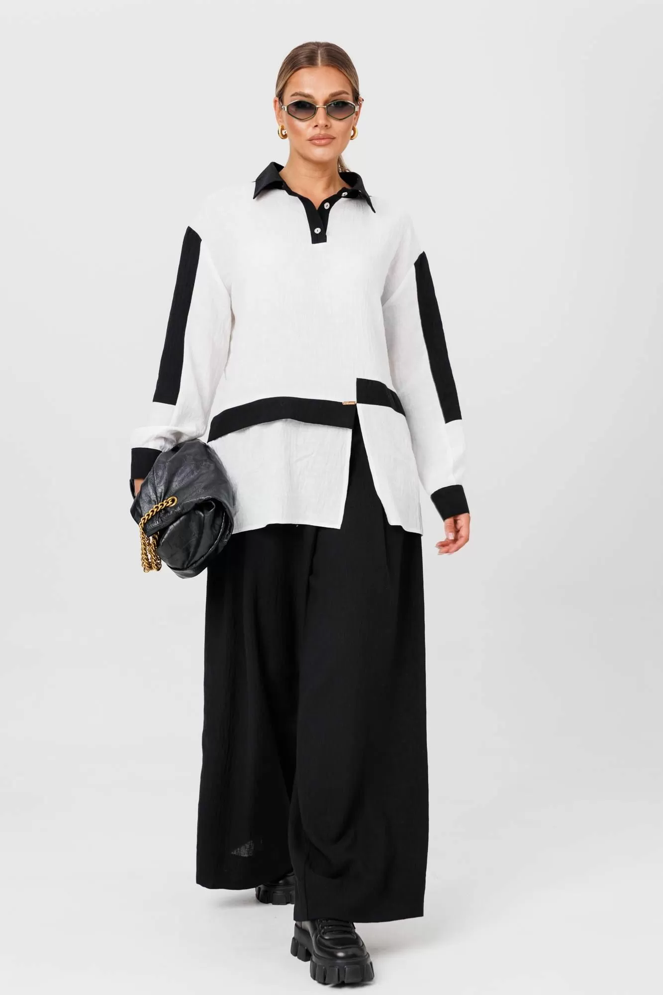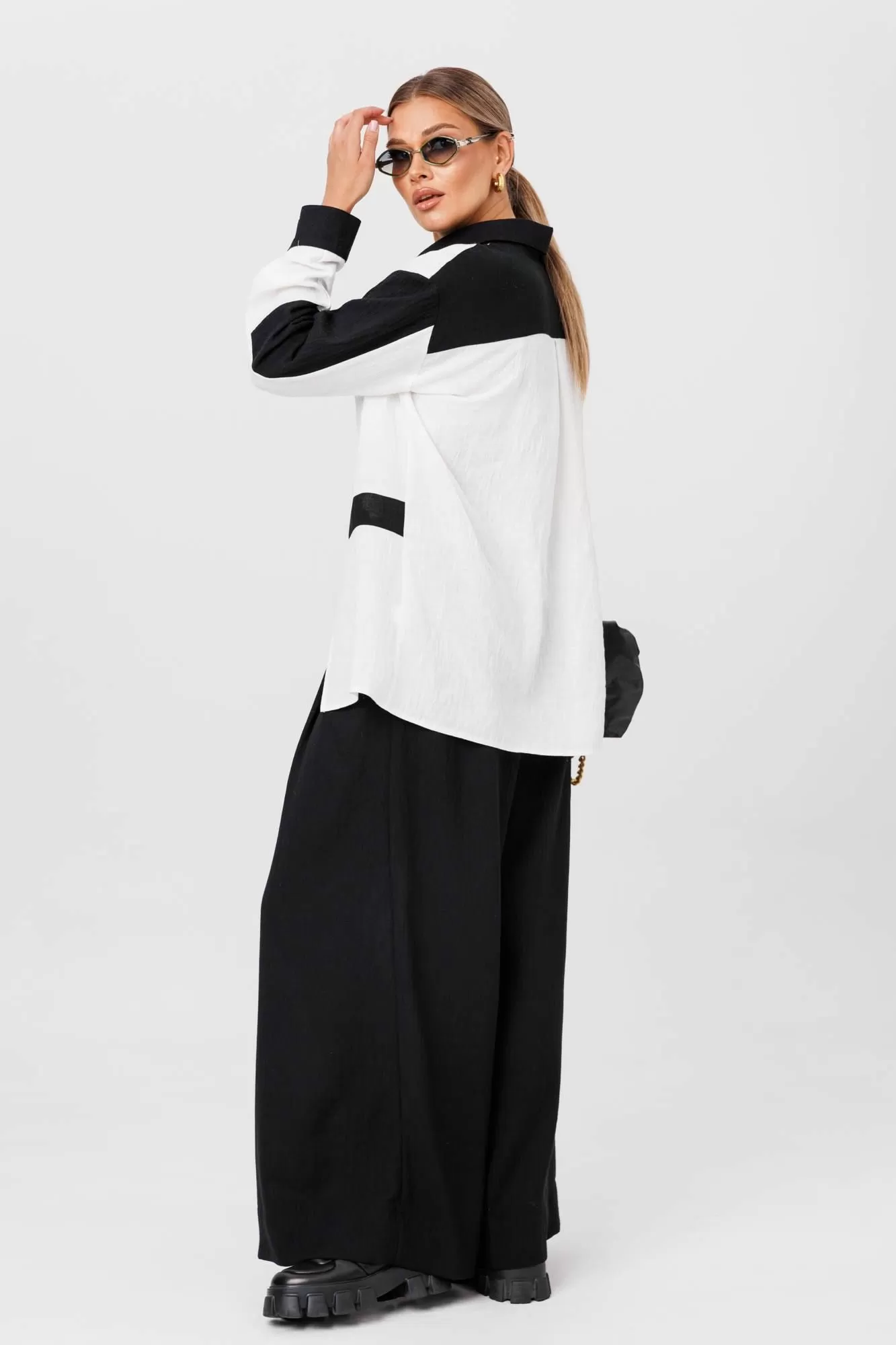 Комплект создан для тех, кто ценит комфорт и элегантность в каждой детали. В комплект входит блузка и штаны палаццо. Оверсайз крой придаёт костюму особый шарм, а легкая невесомая ткань дает свободу движений. Высокая посадка и резинка по поясу подчёркивает талию и делает силуэт более изящным. Смесь натуральных материалов позволяет пропускать воздух и отводить влагу, что особенно важно в жаркую погоду и прохладное утро. Ткань не мнется. Благодаря свободному крою костюм подойдёт для разных типов фигуры. Он подчеркнёт вашу индивидуальность и станет отличным дополнением к вашему летнему гардеробу. Этот брючный костюм — не просто одежда, это заявление о вашем стиле и вкусе. В нём вы будете чувствовать себя уверенно и комфортно, зная, что выглядите на все сто. Выбирая этот костюм, вы выбираете качество, комфорт и стиль. Выберите льняной костюм и наслаждайтесь летом в полной мере!Блузка прямого силуэта, застежка на планку и пуговицы. Воротник на отрезной стойке. По полочке идет ассиметричный подрез со вставками из 2-х видов однотона и разрезом. Плечо спущенное, рукав длинный со вставками из ткани в полоску, на манжете. По спинке идет кокетка из ткани в полоску и встречная складка. Брюки полаццо прямые с односторонней складкой и запахом по центру. По низу брюк широкая подгибка.Пояс на резинке . В качестве декора- брендированная металлическая нашивка по подрезу полочки. Длина по спинке (50-54) - 74 см, (56-60) - 76 см. Длина рукава (с манжетой): (50-54) - 57 см, (56-60)-59см. Длина брюк: (50-54) - 98 см, (56-60) - 99 см