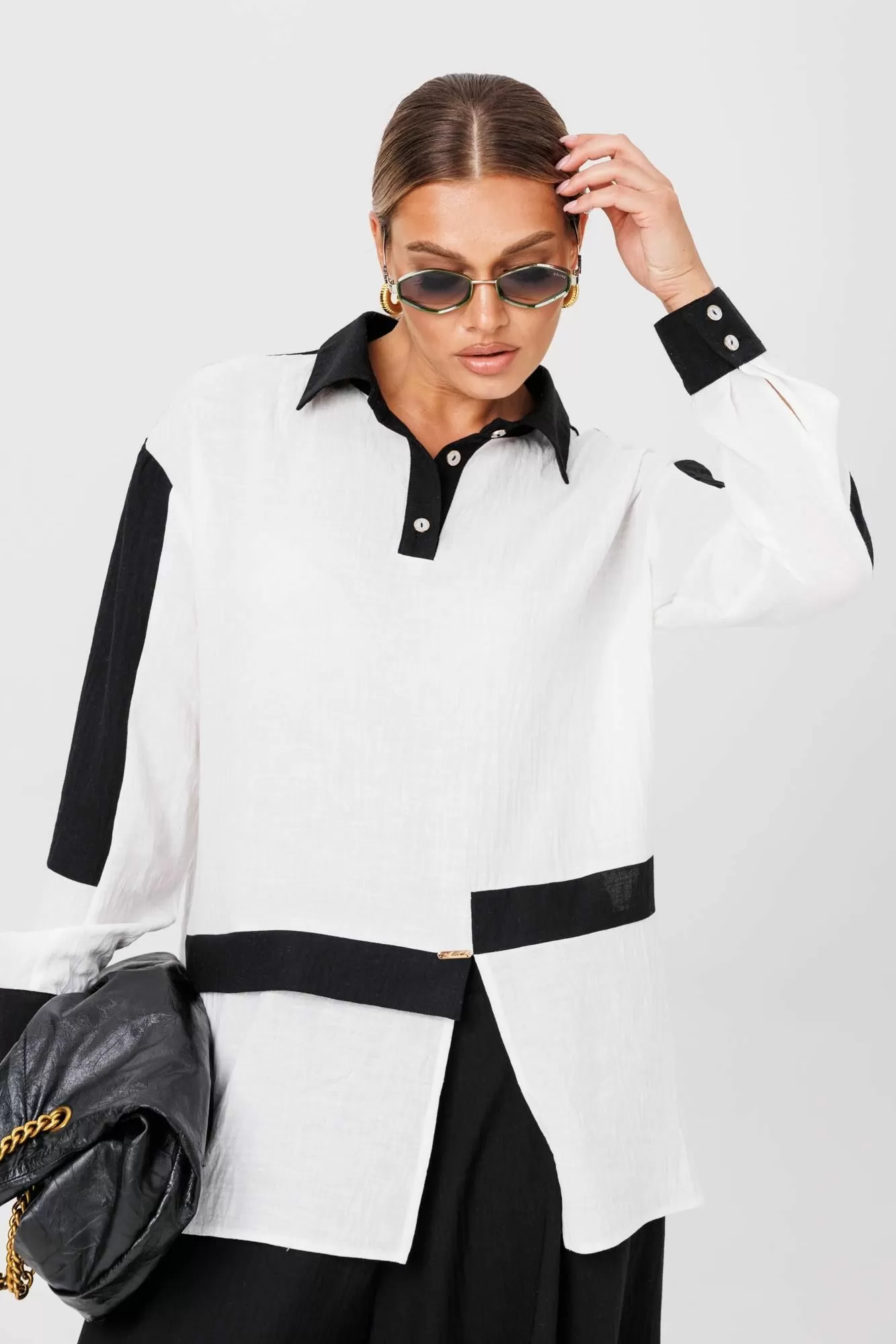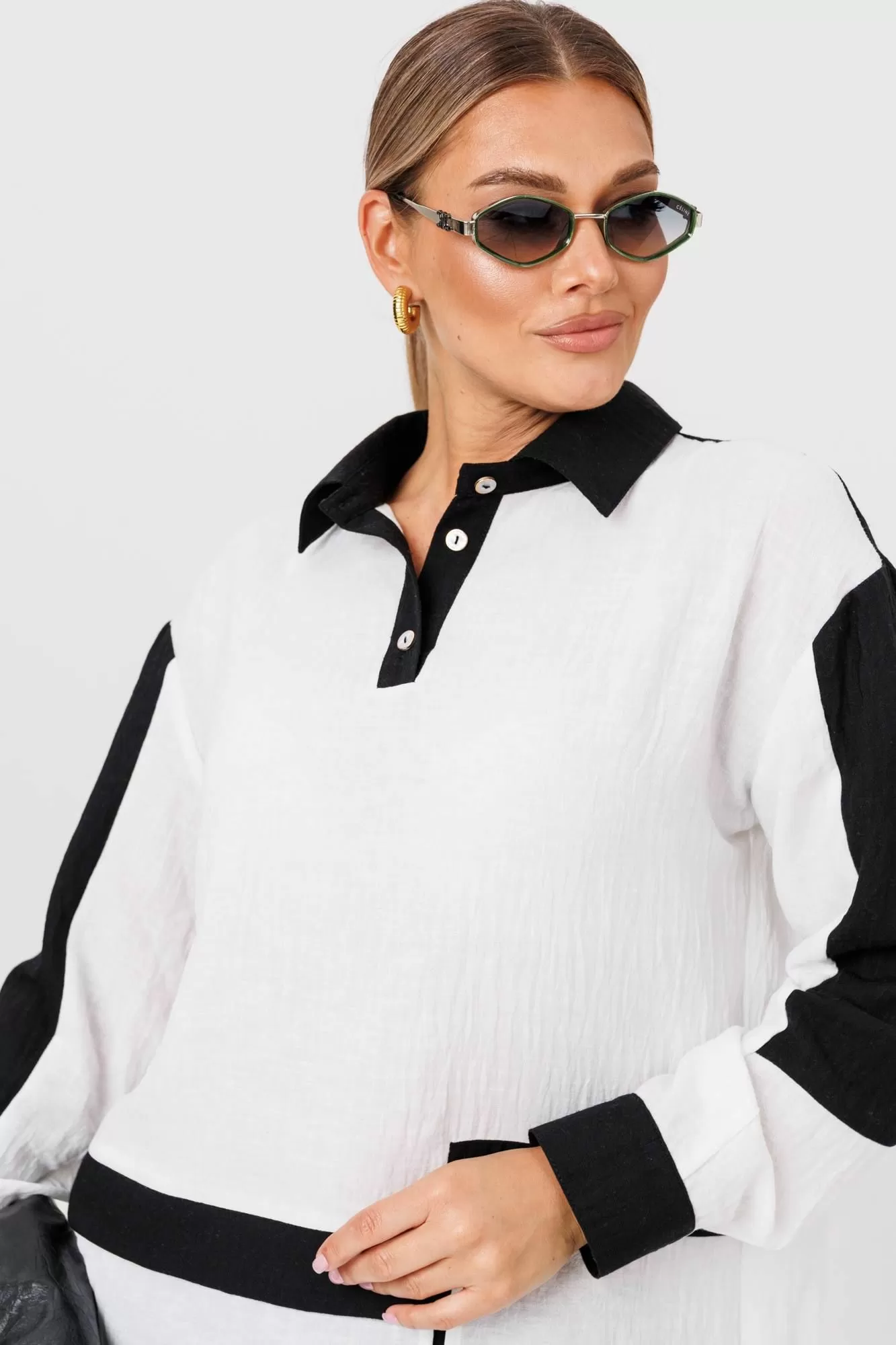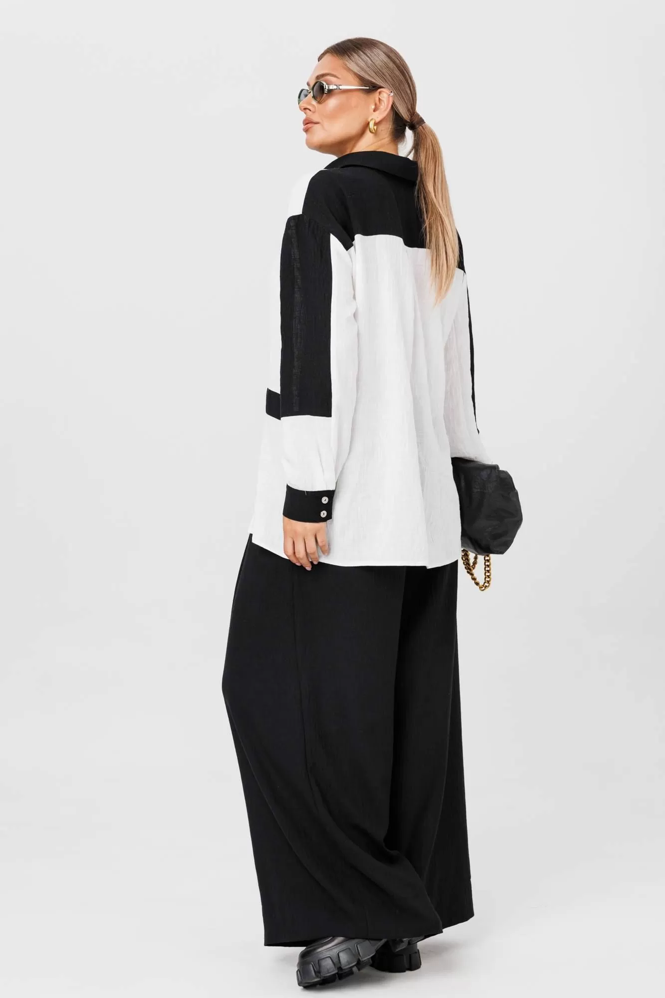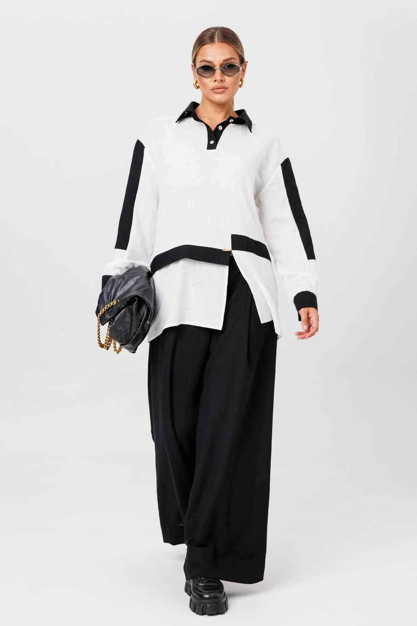 Комплект создан для тех, кто ценит комфорт и элегантность в каждой детали. В комплект входит блузка и штаны палаццо. Оверсайз крой придаёт костюму особый шарм, а легкая невесомая ткань дает свободу движений. Высокая посадка и резинка по поясу подчёркивает талию и делает силуэт более изящным. Смесь натуральных материалов позволяет пропускать воздух и отводить влагу, что особенно важно в жаркую погоду и прохладное утро. Ткань не мнется. Благодаря свободному крою костюм подойдёт для разных типов фигуры. Он подчеркнёт вашу индивидуальность и станет отличным дополнением к вашему летнему гардеробу. Этот брючный костюм — не просто одежда, это заявление о вашем стиле и вкусе. В нём вы будете чувствовать себя уверенно и комфортно, зная, что выглядите на все сто. Выбирая этот костюм, вы выбираете качество, комфорт и стиль. Выберите льняной костюм и наслаждайтесь летом в полной мере!Блузка прямого силуэта, застежка на планку и пуговицы. Воротник на отрезной стойке. По полочке идет ассиметричный подрез со вставками из 2-х видов однотона и разрезом. Плечо спущенное, рукав длинный со вставками из ткани в полоску, на манжете. По спинке идет кокетка из ткани в полоску и встречная складка. Брюки полаццо прямые с односторонней складкой и запахом по центру. По низу брюк широкая подгибка.Пояс на резинке . В качестве декора- брендированная металлическая нашивка по подрезу полочки. Длина по спинке (50-54) - 74 см, (56-60) - 76 см. Длина рукава (с манжетой): (50-54) - 57 см, (56-60)-59см. Длина брюк: (50-54) - 98 см, (56-60) - 99 см