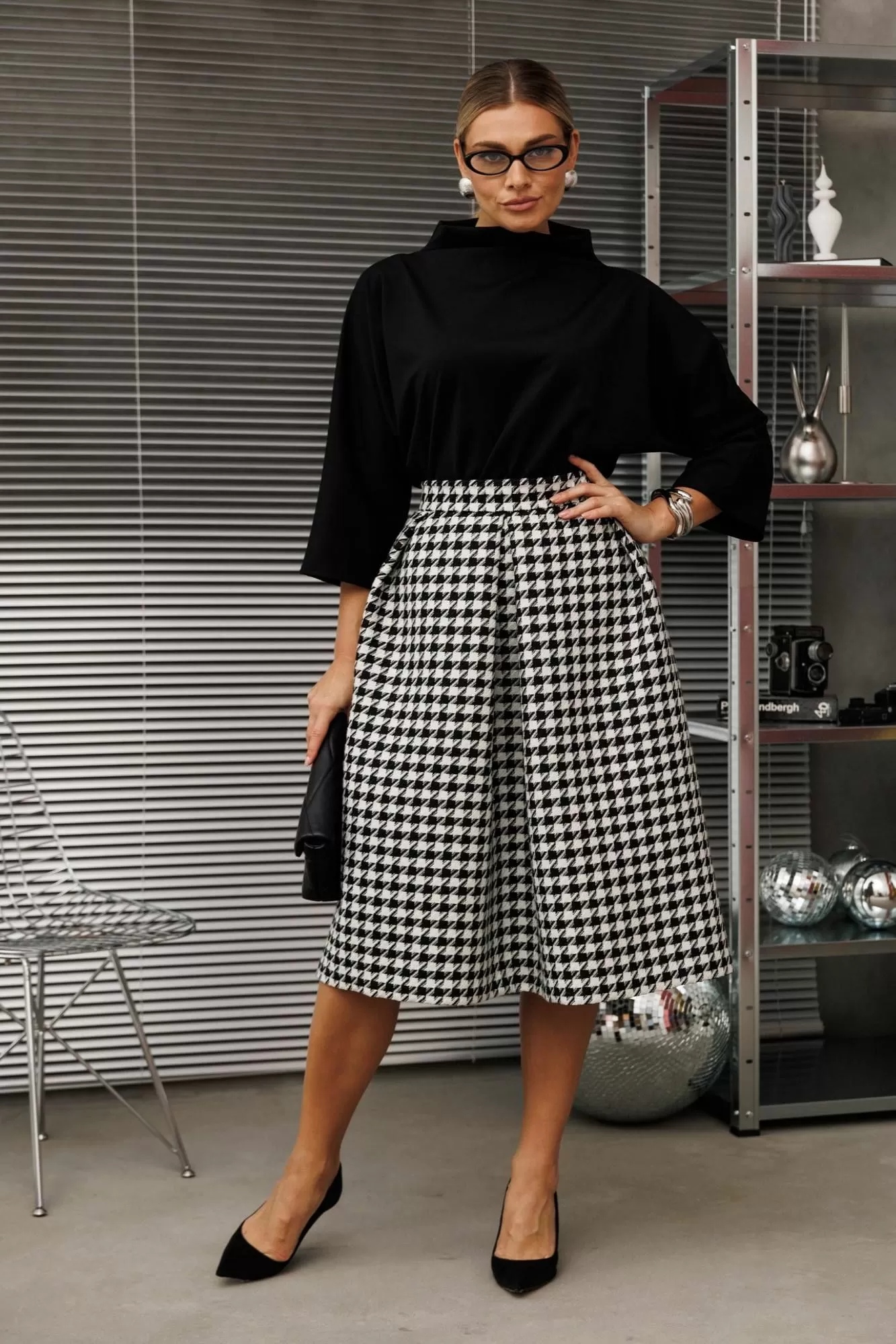 Представляем вашему вниманию стильный и уютный комплект, который станет настоящим маст-хэвом в вашем гардеробе. Классический дизайн в стиле олд мани создает атмосферу расслабленности и уюта, что особенно приятно в прохладные осенние и зимние дни. Этот комплект станет вашим верным спутником в любой ситуации, добавляя нотки элегантности и шарма в вашу повседневную жизнь. Отражает роскошь, придает элегантность и изысканность, будет великолепно смотреться на любой фигуре и привлечет к вам внимание окружающих. Комплект женский 2-х предметный (блузка, юбка).Блузка женская ,прямого силуэта, из трикотажного полотна , со спущенным плечом. Рукав "летучая мышь", 3/4 длины. Горловина цельнокроенная в виде стойки. Юбка из фактурной ткани в рубкик с принтом гусиная лапка - теплая, плотная и качественная, практически не мнется. В верхней части идут складки: по центру-встречная, по бокам - односторонние. Пояс отрезной, по бокам карманы. Застежка по спинке на потайную молнию и пуговицу. Юбка на подкладке. Отдельные части комлекта будут легко сочитаться с вещеми из вашего гардероба. Длина блузки(по спинке): (50-56)-65 см. Длина рукава от головины: (50-56) -56 см. Длина юбки - 72см.