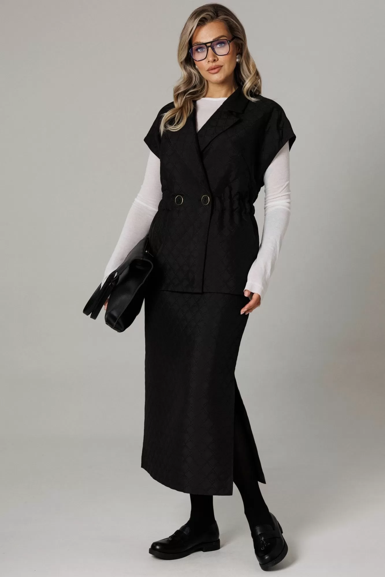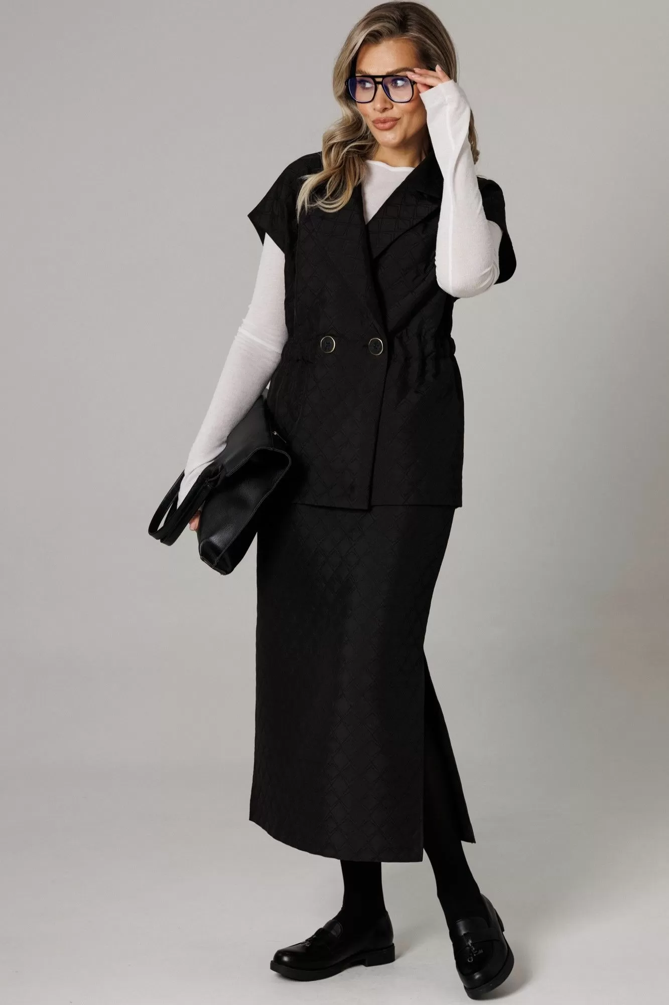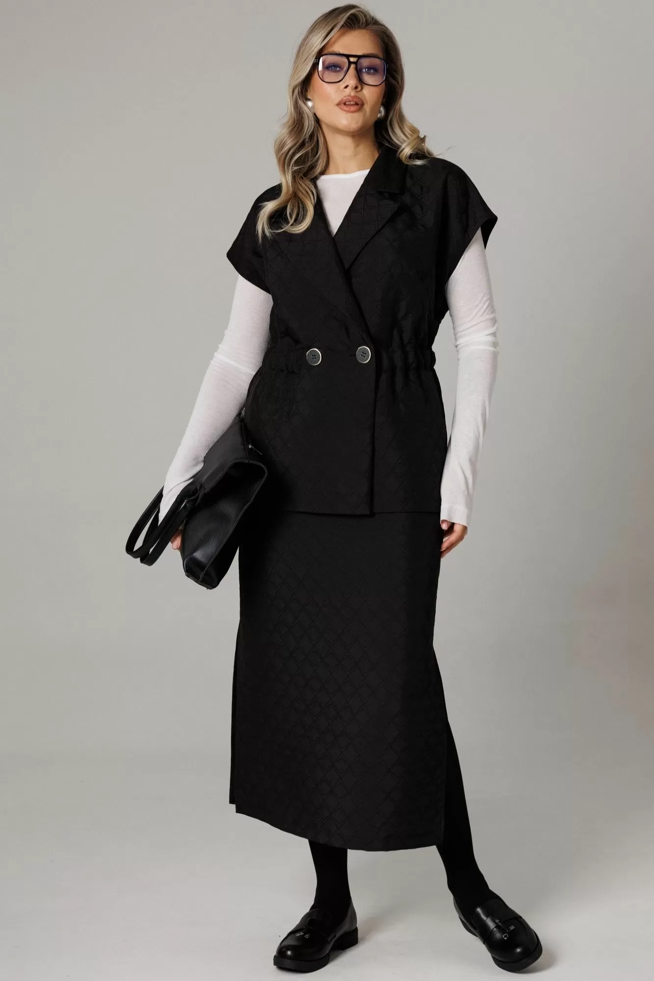Бренд белорусской женской одежды больших размеров Anastasia представляет костюм двойку. Костюм женский 2-х предметный (жилет, юбка) из стеганной ткани станет отличным дополнением к Вашему гардеробу. Подойдет для повседневной носки (работа, офис, прогулки). Достаточно дополнить его соответствующими предметами из вашего гардероба: блузка, майка, водолазка, гольф, свитер, лонгслив, свитшот. Жилет прямого силуэта, со спущенным плечом. Может быть самостоятельным элементом гордерба. Застежка двухбортная, воротник английского типа. По полочке идет грудовая выточка из бокового шва, по спинке средний шов, по талии кулиска-резинка, по бокам -карманы. Юбка-макси, зауженная к низу, по бокам разрезы. Пояс отрезной на резинке. Благодаря своему крою и фасону костюм подчеркивает женственные формы и скрывает то, что должно быть незаметным. Это повседневный вариант на каждый день для занятий в школе или для офиса, на работу или на прогулку. Наденьте его на деловую встречу, официальное мероприятие, школьное торжество. Модель подойдёт для образа в университет или колледж. Этот предмет одежды подчеркнет вашу элегантность и сделает образ более женственным. Одежда для женщин больших размеров и не только, по отличным ценам и высокого качества - это Anastasia! Добавляете нас в любимые бренды и вы всегда будете в курсе всех акций и новинок! Хороших покупок от «Анастасия»Длина по спинке (48-52)-70см, (54-58)-71 см. Длина юбки (48-58) - 88см.