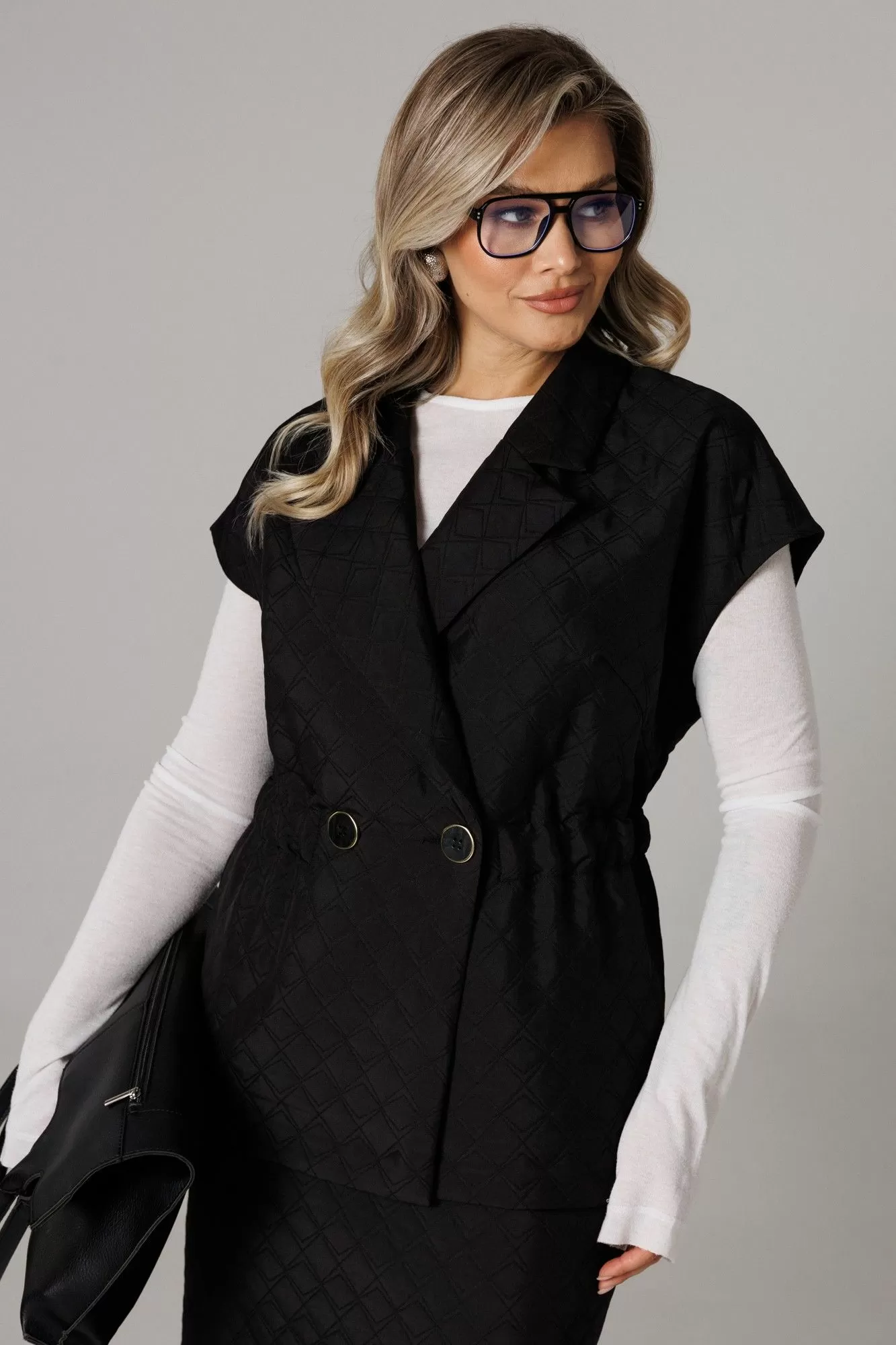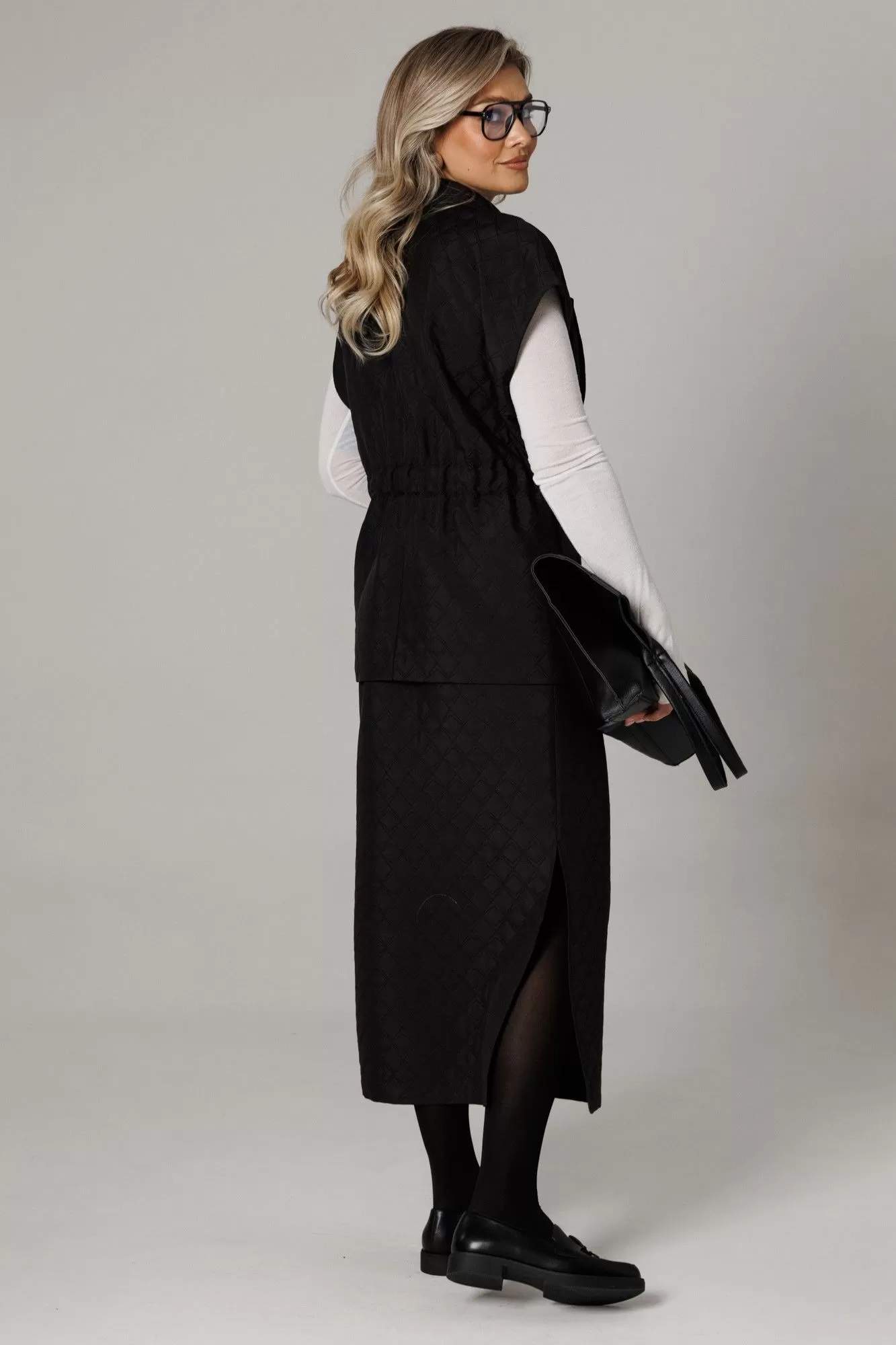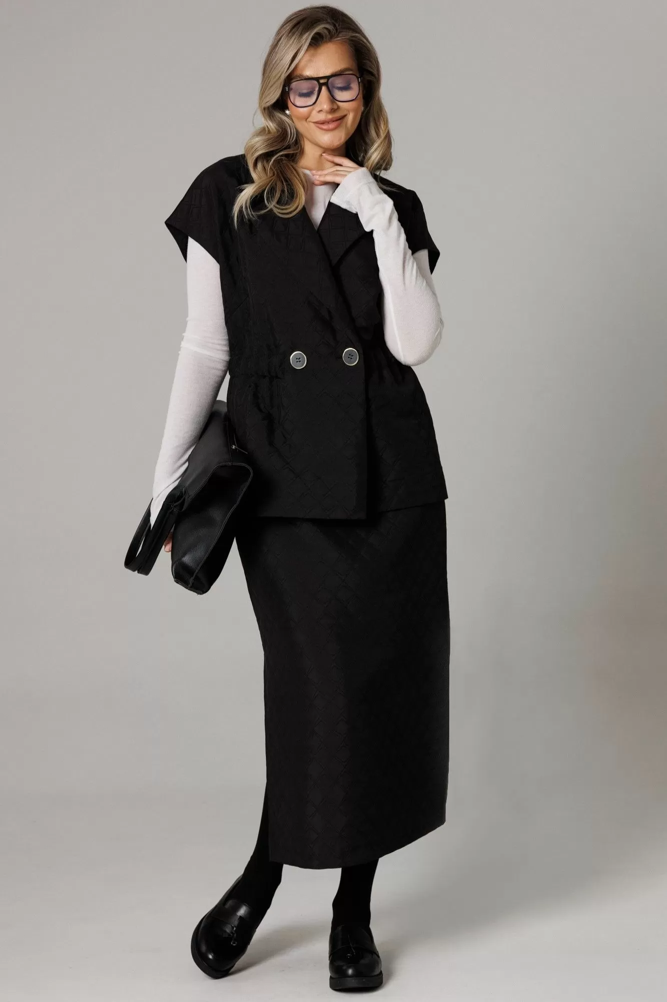 Бренд белорусской женской одежды больших размеров Anastasia представляет костюм двойку. Костюм женский 2-х предметный (жилет, юбка) из стеганной ткани станет отличным дополнением к Вашему гардеробу. Подойдет для повседневной носки (работа, офис, прогулки). Достаточно дополнить его соответствующими предметами из вашего гардероба: блузка, майка, водолазка, гольф, свитер, лонгслив, свитшот. Жилет прямого силуэта, со спущенным плечом. Может быть самостоятельным элементом гордерба. Застежка двухбортная, воротник английского типа. По полочке идет грудовая выточка из бокового шва, по спинке средний шов, по талии кулиска-резинка, по бокам -карманы. Юбка-макси, зауженная к низу, по бокам разрезы. Пояс отрезной на резинке. Благодаря своему крою и фасону костюм подчеркивает женственные формы и скрывает то, что должно быть незаметным. Это повседневный вариант на каждый день для занятий в школе или для офиса, на работу или на прогулку. Наденьте его на деловую встречу, официальное мероприятие, школьное торжество. Модель подойдёт для образа в университет или колледж. Этот предмет одежды подчеркнет вашу элегантность и сделает образ более женственным. Одежда для женщин больших размеров и не только, по отличным ценам и высокого качества - это Anastasia! Добавляете нас в любимые бренды и вы всегда будете в курсе всех акций и новинок! Хороших покупок от «Анастасия»Длина по спинке (48-52)-70см, (54-58)-71 см. Длина юбки (48-58) - 88см.