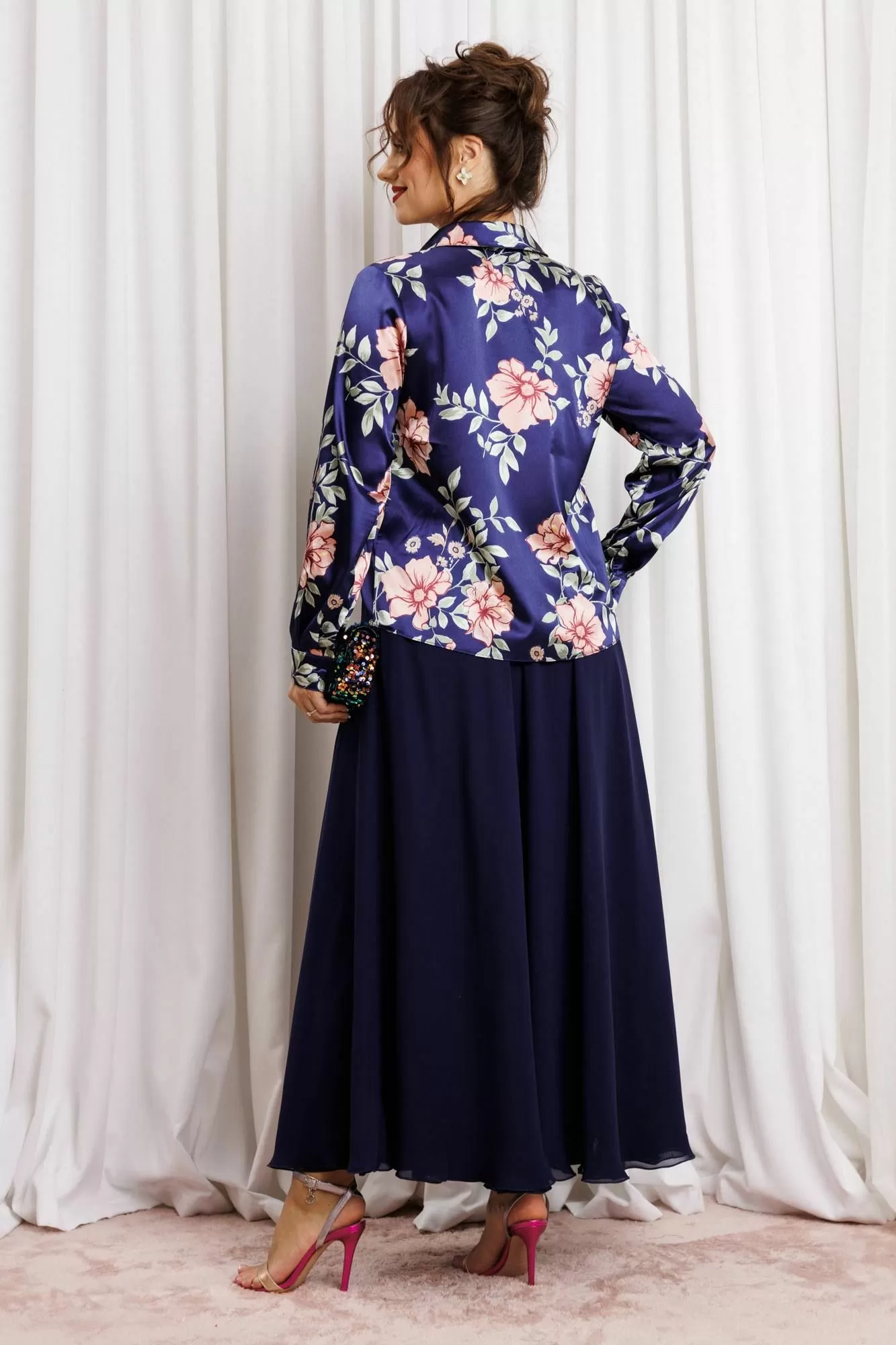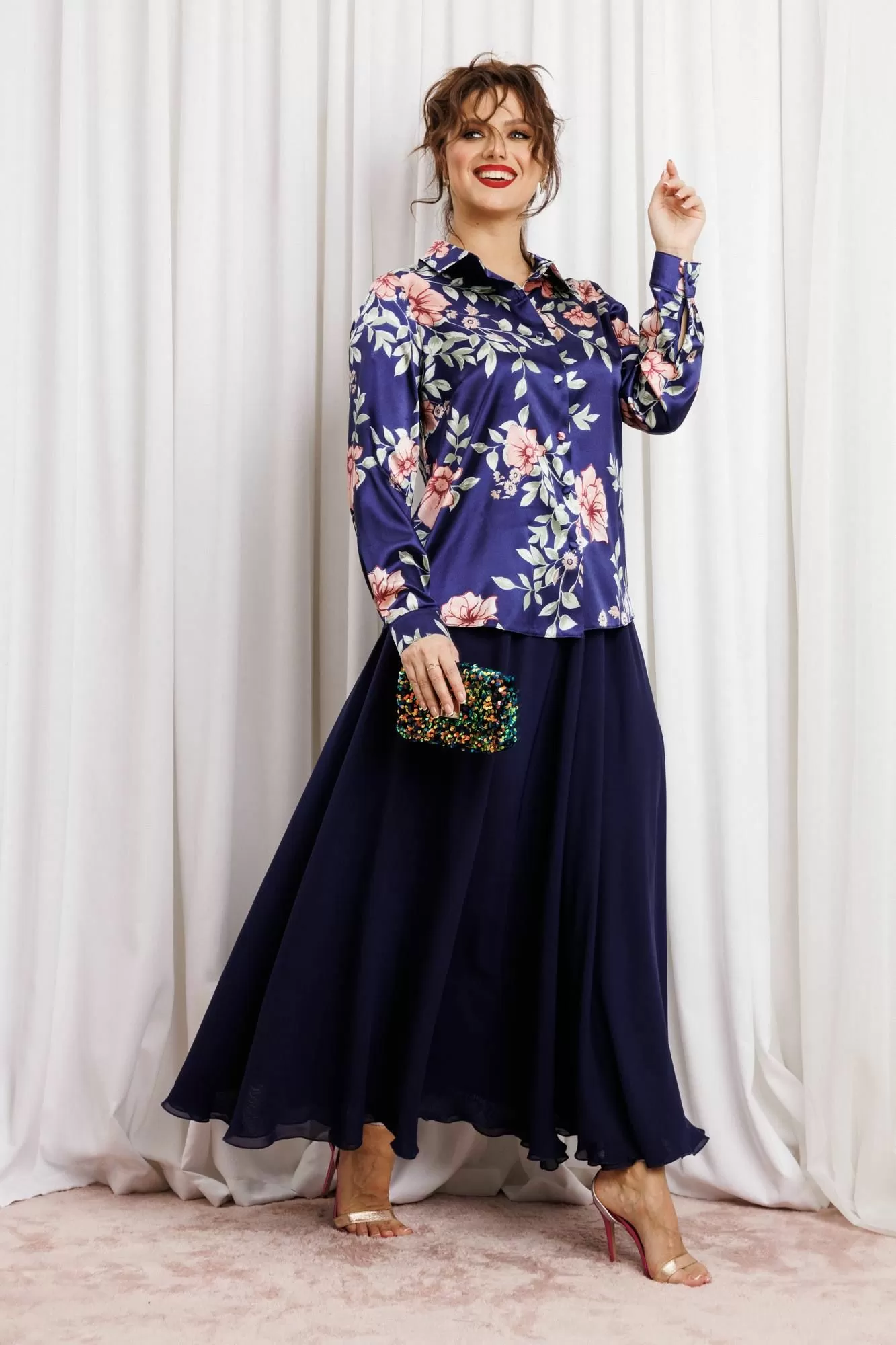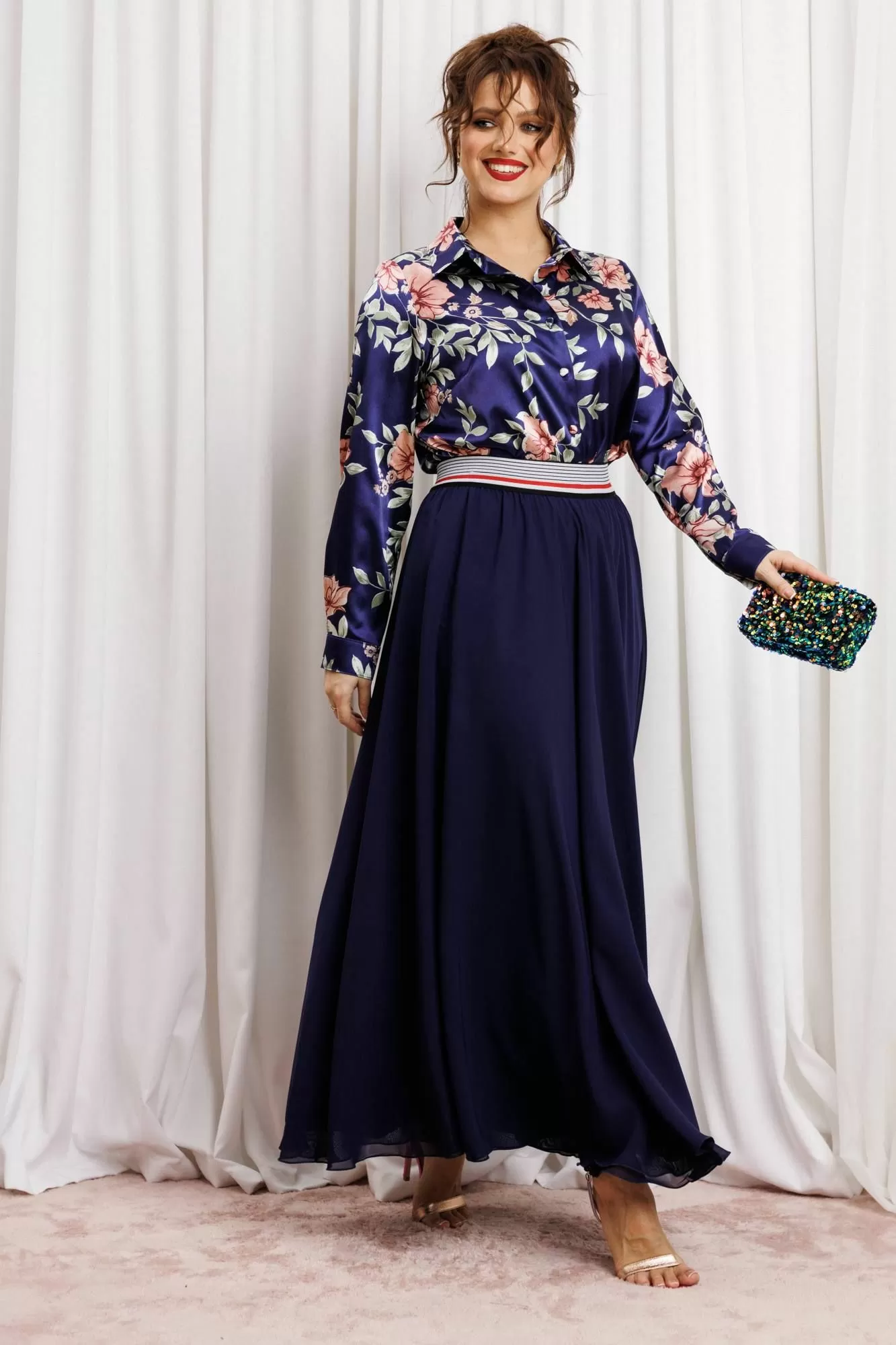 Женский комплект с юбкой макси от Anastasia- для стильных и уверенных в себе женщин. Изготовленный из премиум ткани, этот комплект включает атласную блузку и юбку из двойного шифона. Комплект двойка позволяет создавать как нарядные образы для вечерних выходов, так и строгие луки для офиса. Блузка полуприлегающего силуэта, застежка на планку и пуговицы, воротник на стойке. По полочке грудовая вытачка из бокового шва. Рукав втачной, на манжете. Наша классическая блузка сшита из высококачественной английской атласной ткани, которая очень приятна к телу, не линяет и не мнется. Наша красивая блузка подойдет для беременных. Модная и стильная блузка будет актуальна в любое время года. Изделие подходит также для девушек с размером plus size. Великолепный фасон-юбка солнце длиной макси и резинкой на поясе обеспечивает идеальную посадку по фигуре, подчеркивая ваши достоинства и создавая элегантный силуэт. Сочетание оригинального модного дизайна и классического стиля делает этот комплект настоящей находкой для вашего гардероба. Части комплекта вы можете легко носить как самостоятельные изделия. Юбку леко сочетать с различными верхами: топ, блузка, футболка, кружевной жакет, свитер или жакет из тексиля- все это позволит создавать различные образы на разные случаи. Благодаря своей длине блузкой можно дополнять различные комплдекты из вашего гардеоба. Почувствуйте себя уверенно и элегантно нашем комплекте! Длина (по спинке): (48-50)-61 см., (52-56)-62 см, (58)-63 см. Длина рукава с манжетой: (48-50)-61 см., (52-56)-62 см, (58)-63 см Длинна юбки 98см.