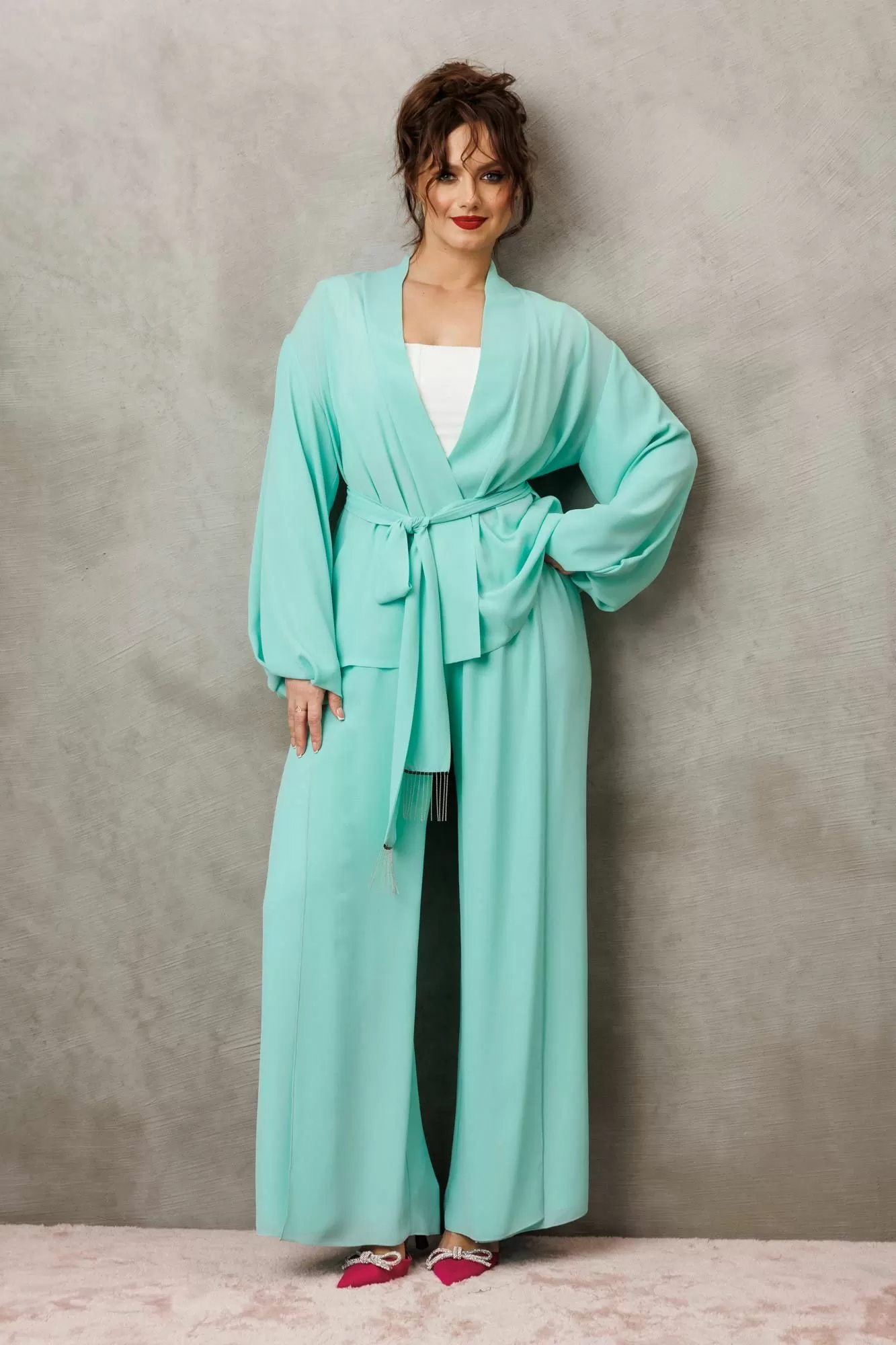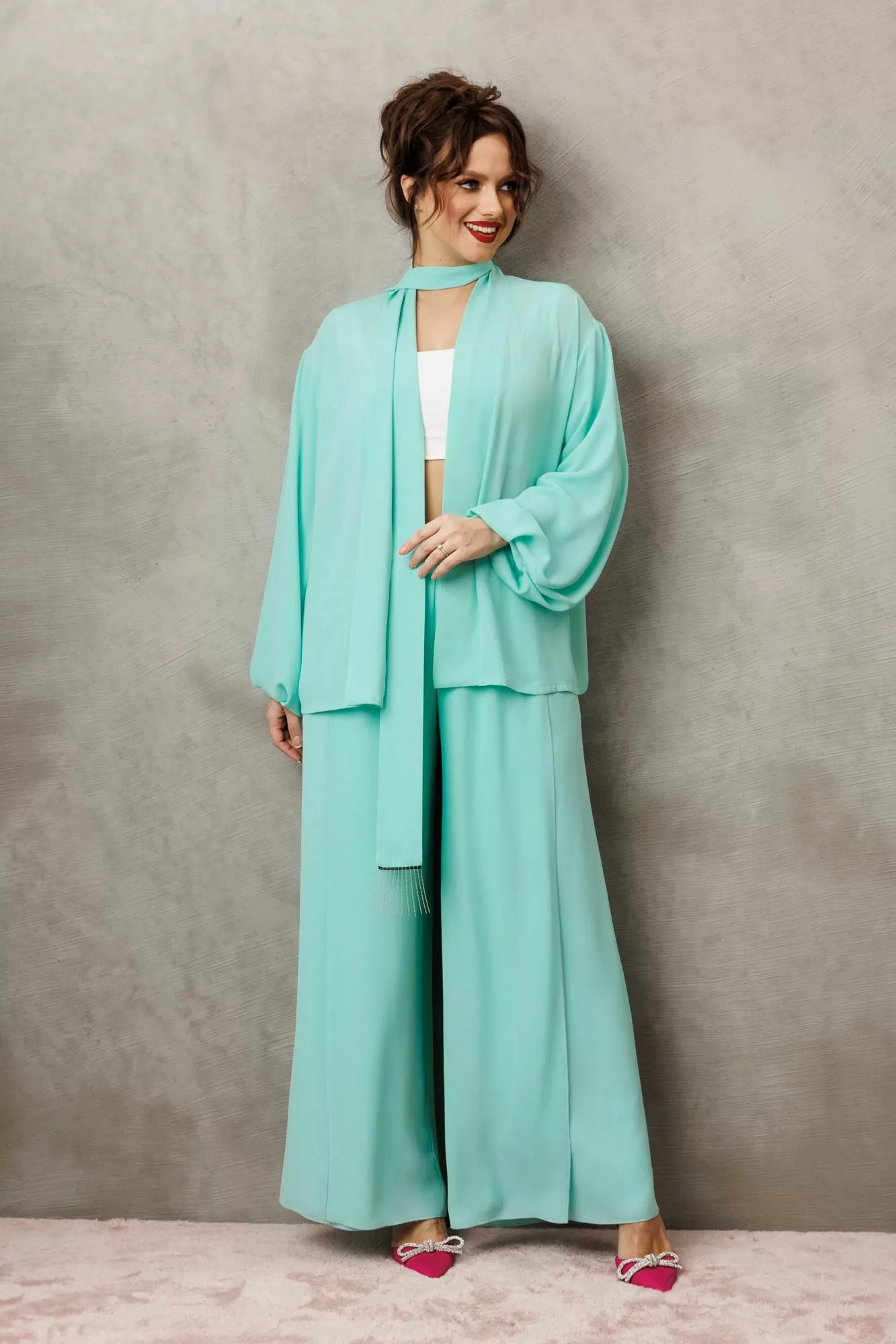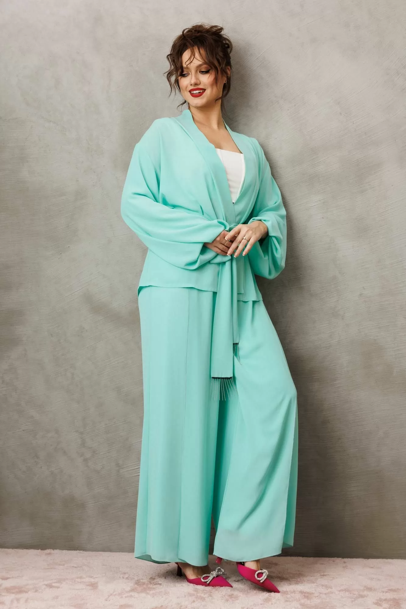 Элегантный вечерний костюм-двойка, состоящий из блузки свободного кроя и широких брюк. Красивый и эффектный брючный костюм - это идеальный образ для особых случаев, вечерних выходов, праздничных и торжественных мероприятий, будь то корпоратив, свадьба, юбилей, выпускной, день рождения, Новый год Блузка прямого силуэта со пущенной линией плеча. Рукав двойной, расширенный к низу со складками. По спинке и полочке идет планка. В комплекте с блузкой идет съемный пояс. На концах пояса металлизированная бахрома. Брюки прямые с запахом по переду, пояс на резинке.Благодаря фасону и крою, костюм визуально вытянет силуэт, сделает фигуру стройнее, подчеркнет ее достоинства, скроет недостатки. Элегантный брючный костюм от Anastasia- комфорт и уверенность в себе на любом мероприятии Длина блузки: (48-56)-61см. Длина рукава-52см. Длина брюк:(48-54)-105см., (56)-108см.