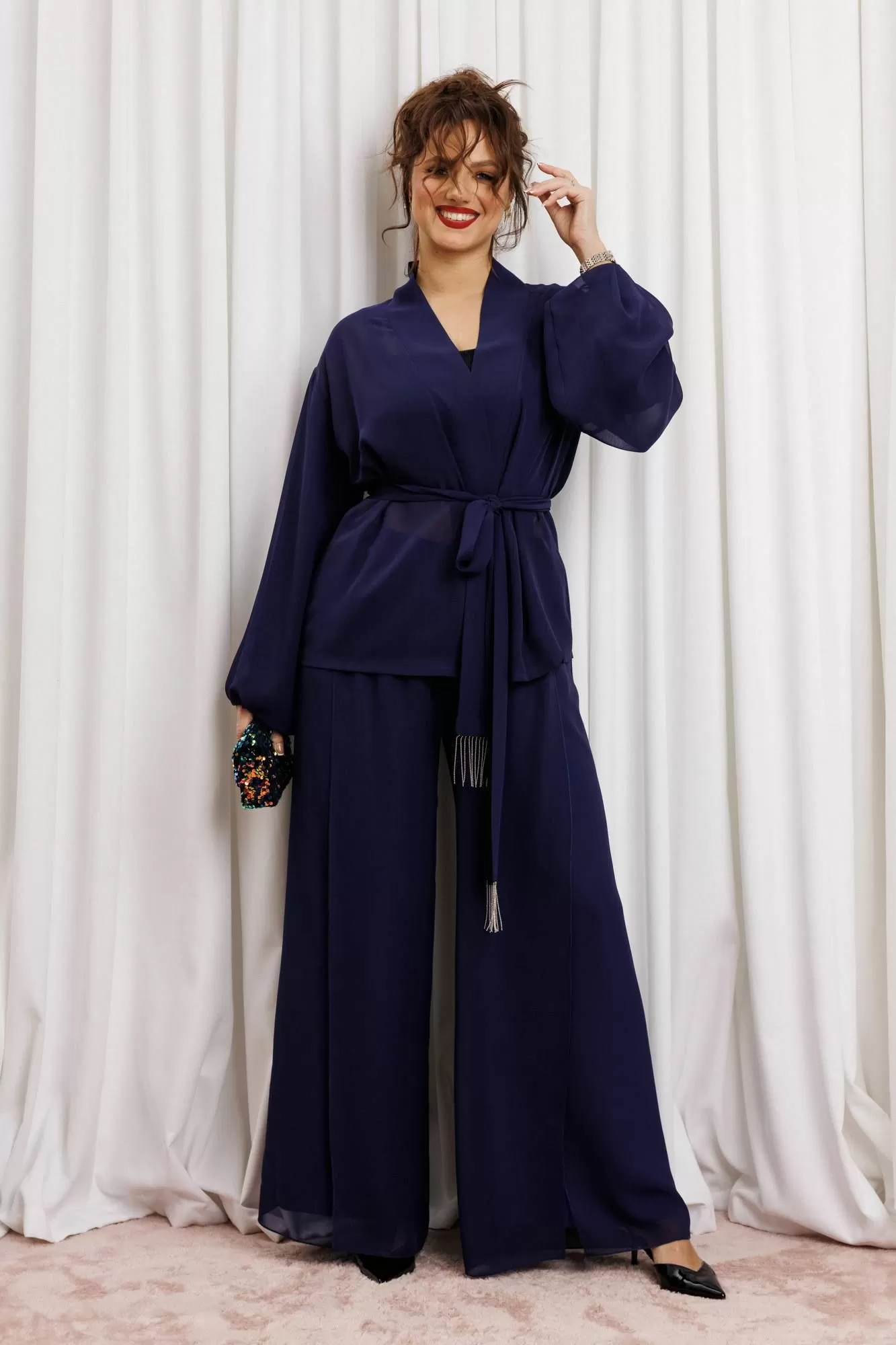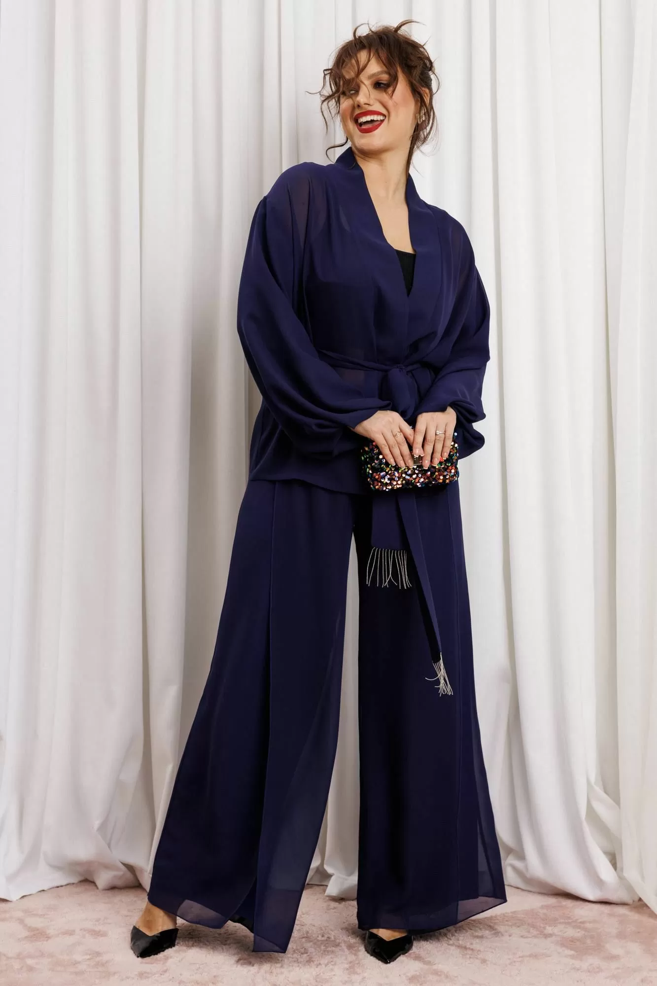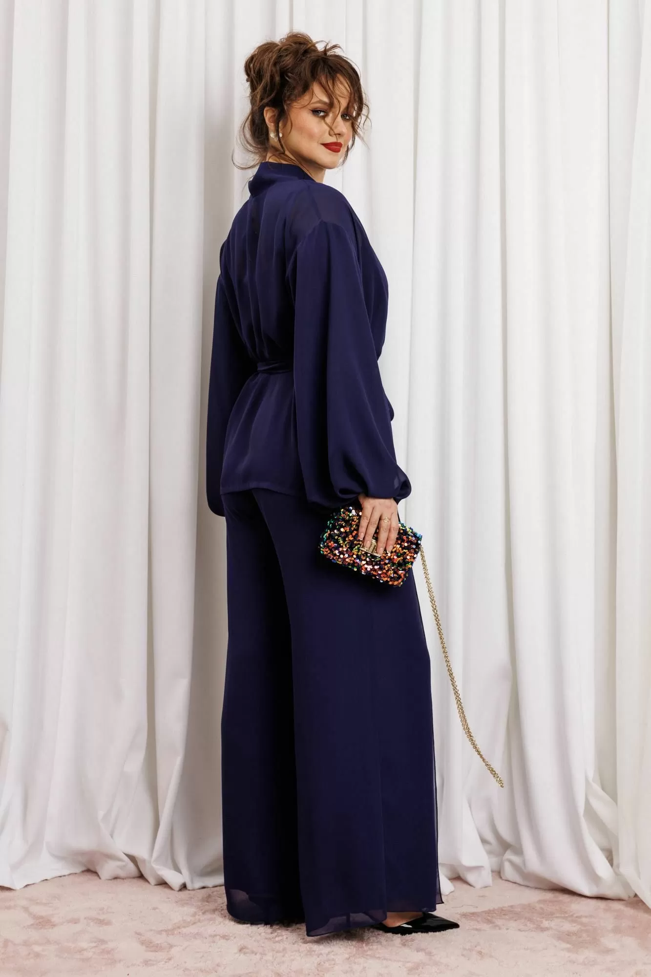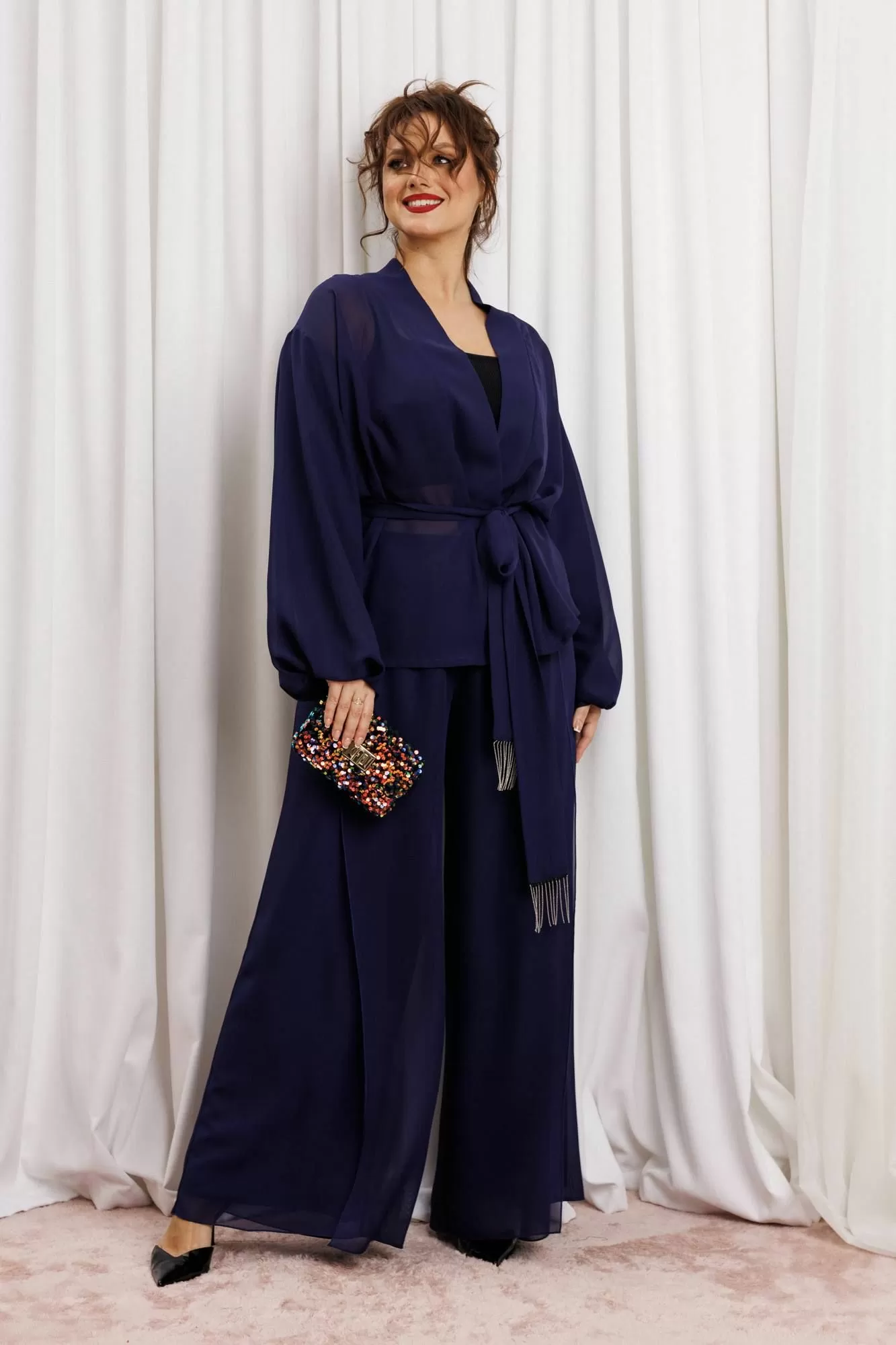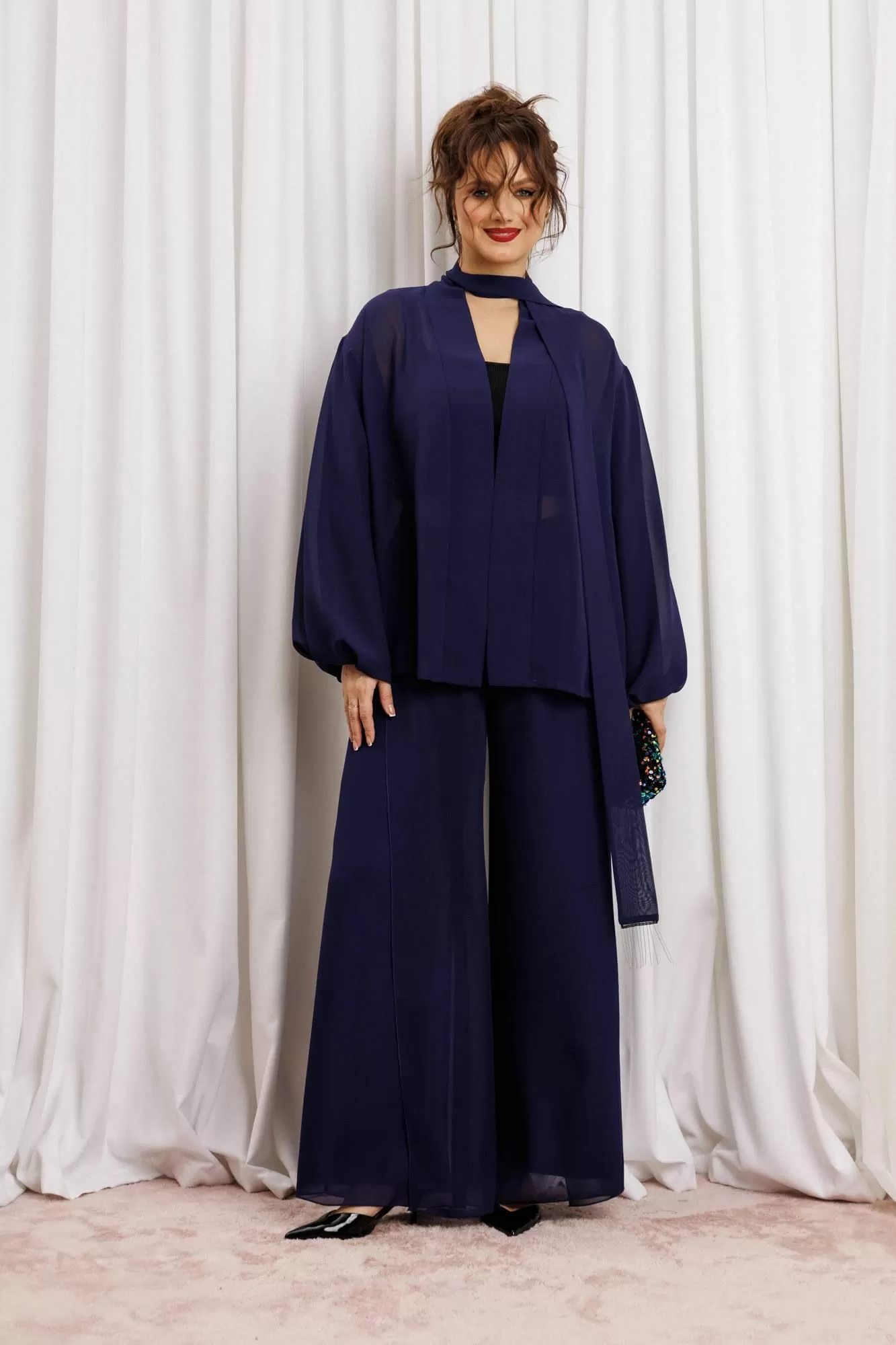 Элегантный вечерний костюм-двойка из шифона, состоящий из блузки свободного кроя и широких брюк. Красивый и эффектный брючный костюм - это идеальный образ для особых случаев, вечерних выходов, праздничных и торжественных мероприятий, будь то корпоратив, свадьба, юбилей, выпускной, день рождения, Новый год Блузка прямого силуэта из шифона со пущенной линией плеча. Рукав двойной, расширенный к низу со складками. По спинке и полочке идет планка. В комплекте с блузкой идет съемный пояс. На концах пояса металлизированная бахрома. Брюки прямые на трикотажной подкладке масло, с запахом по переду, пояс на резинке.Благодаря фасону и крою, костюм визуально вытянет силуэт, сделает фигуру стройнее, подчеркнет ее достоинства, скроет недостатки. Элегантный брючный костюм от Anastasia- комфорт и уверенность в себе на любом мероприятии Длина блузки: (48-56)-61см. Длина рукава-52см. Длина брюк:(48-54)-105см., (56)-108см.