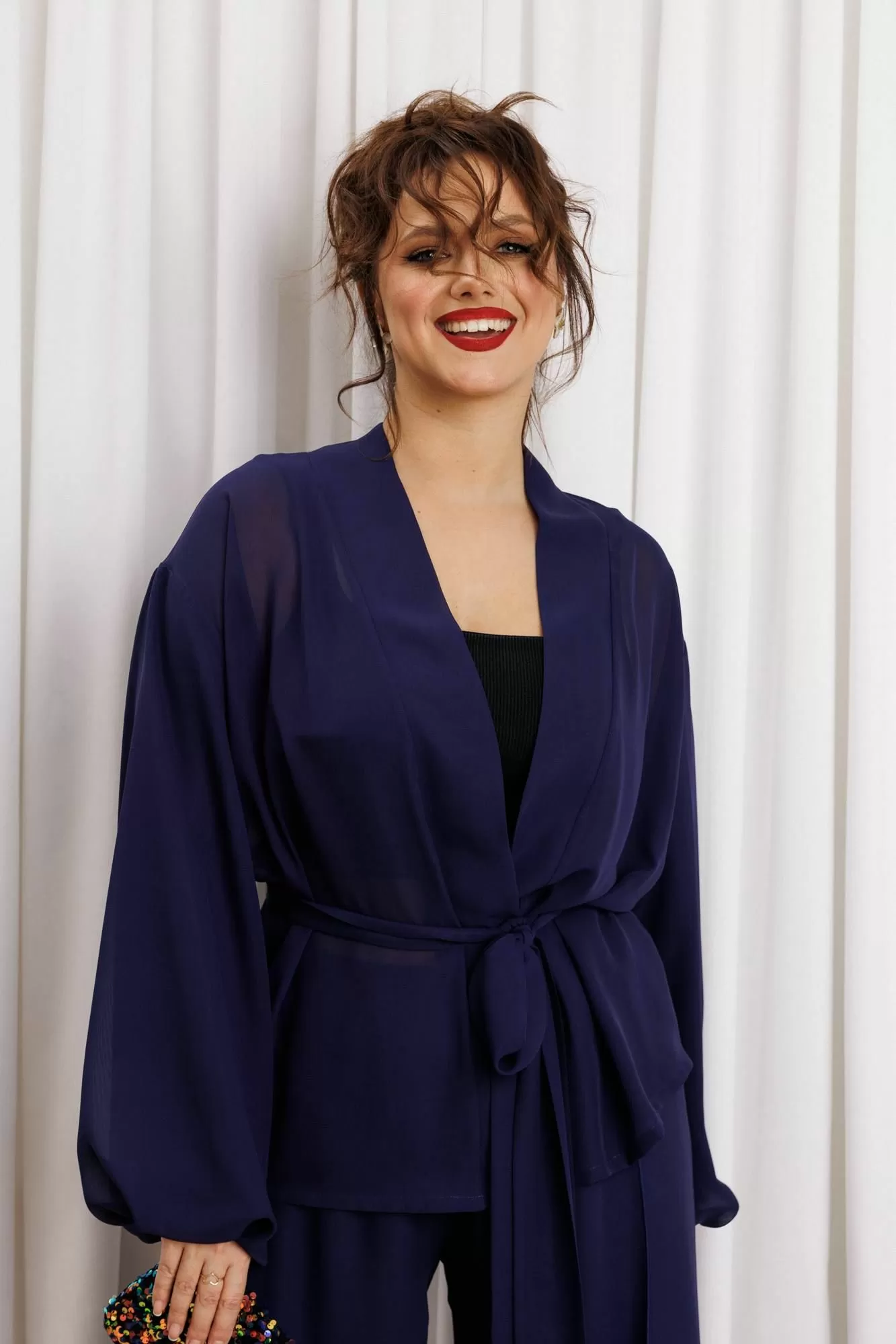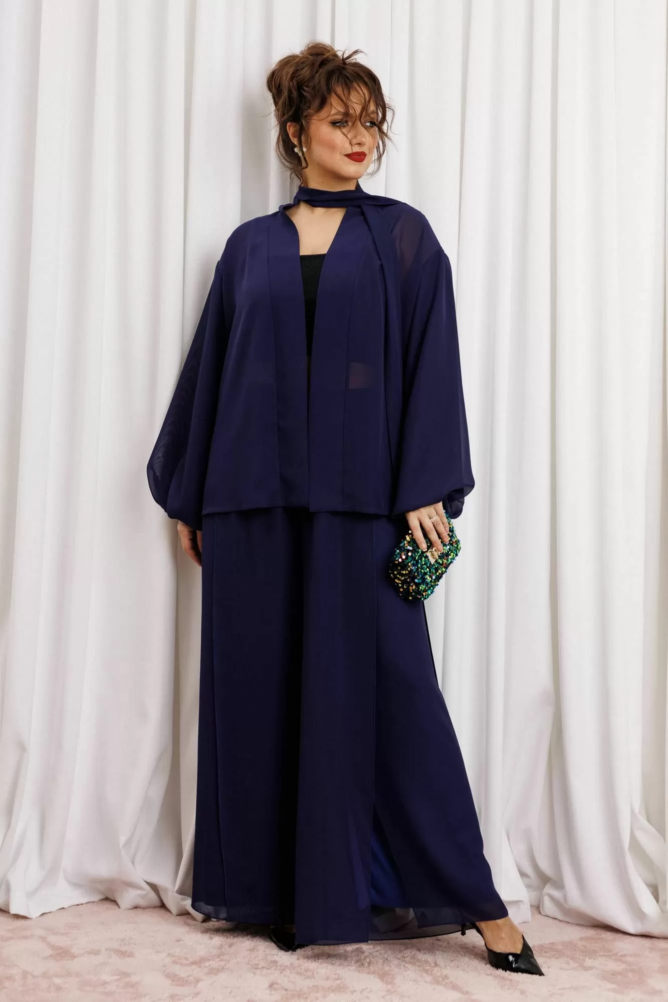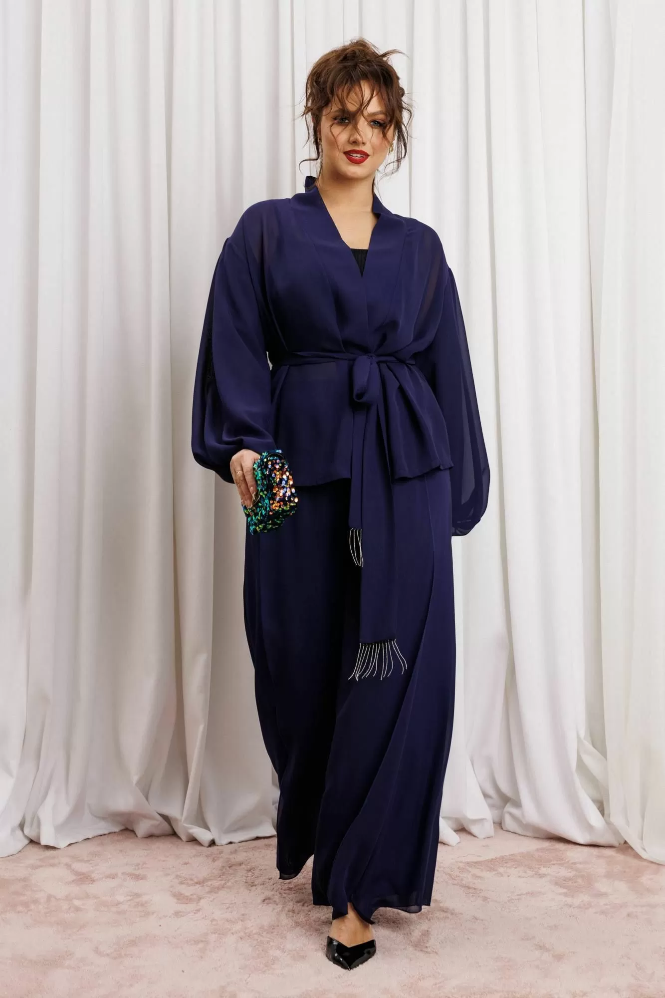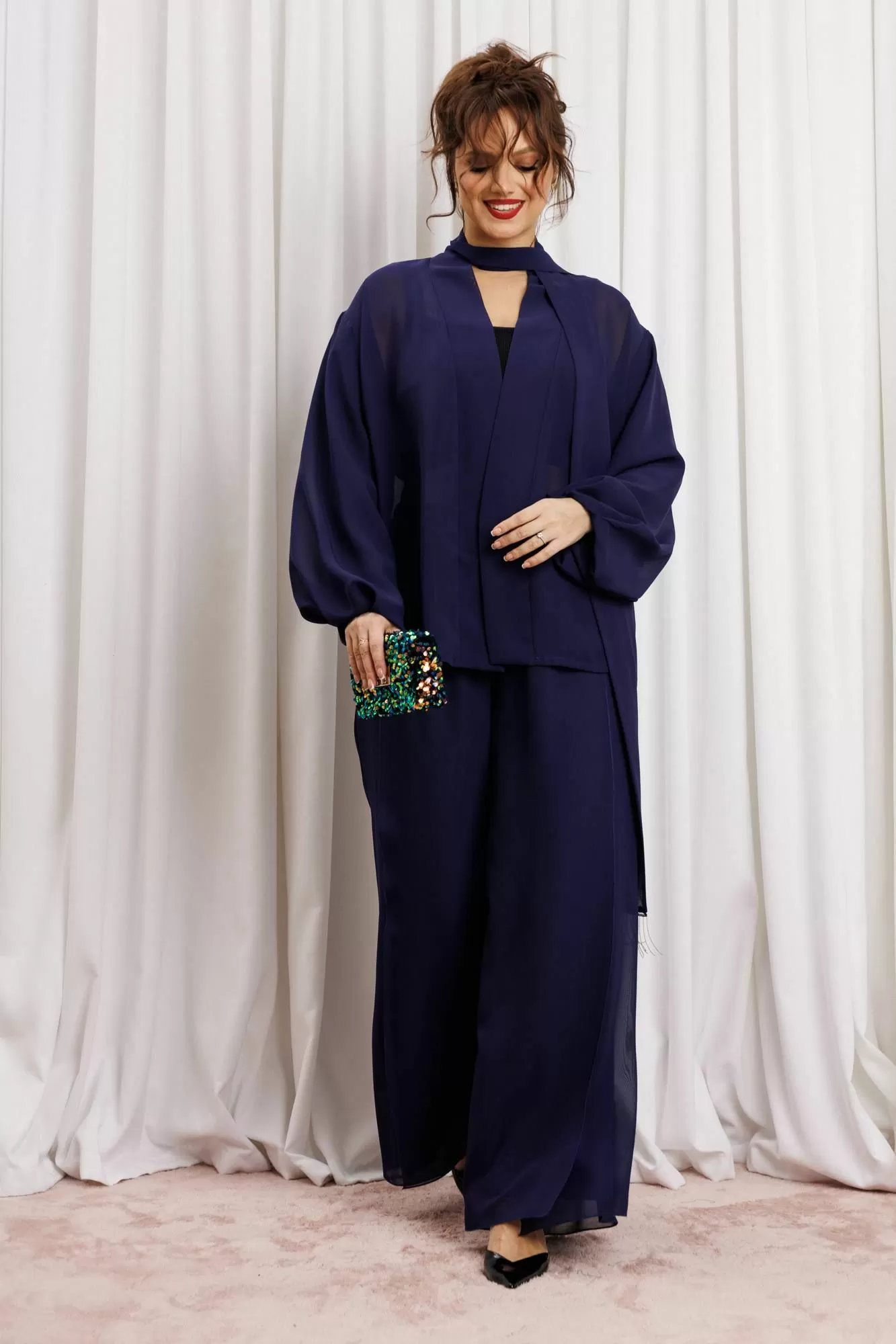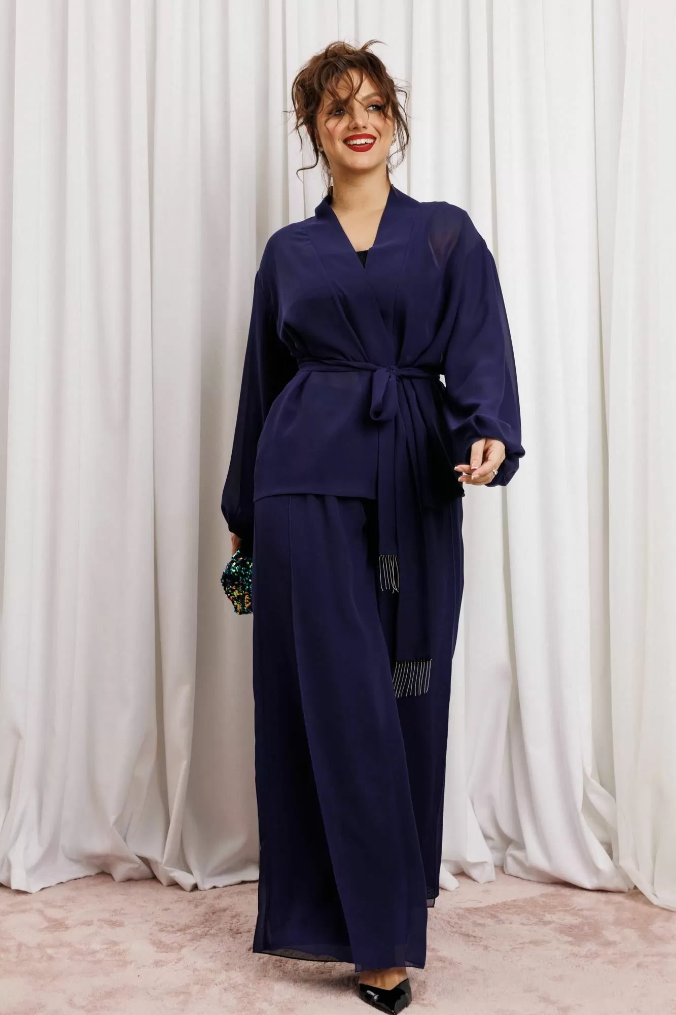 Элегантный вечерний костюм-двойка из шифона, состоящий из блузки свободного кроя и широких брюк. Красивый и эффектный брючный костюм - это идеальный образ для особых случаев, вечерних выходов, праздничных и торжественных мероприятий, будь то корпоратив, свадьба, юбилей, выпускной, день рождения, Новый год Блузка прямого силуэта из шифона со пущенной линией плеча. Рукав двойной, расширенный к низу со складками. По спинке и полочке идет планка. В комплекте с блузкой идет съемный пояс. На концах пояса металлизированная бахрома. Брюки прямые на трикотажной подкладке масло, с запахом по переду, пояс на резинке.Благодаря фасону и крою, костюм визуально вытянет силуэт, сделает фигуру стройнее, подчеркнет ее достоинства, скроет недостатки. Элегантный брючный костюм от Anastasia- комфорт и уверенность в себе на любом мероприятии Длина блузки: (48-56)-61см. Длина рукава-52см. Длина брюк:(48-54)-105см., (56)-108см.