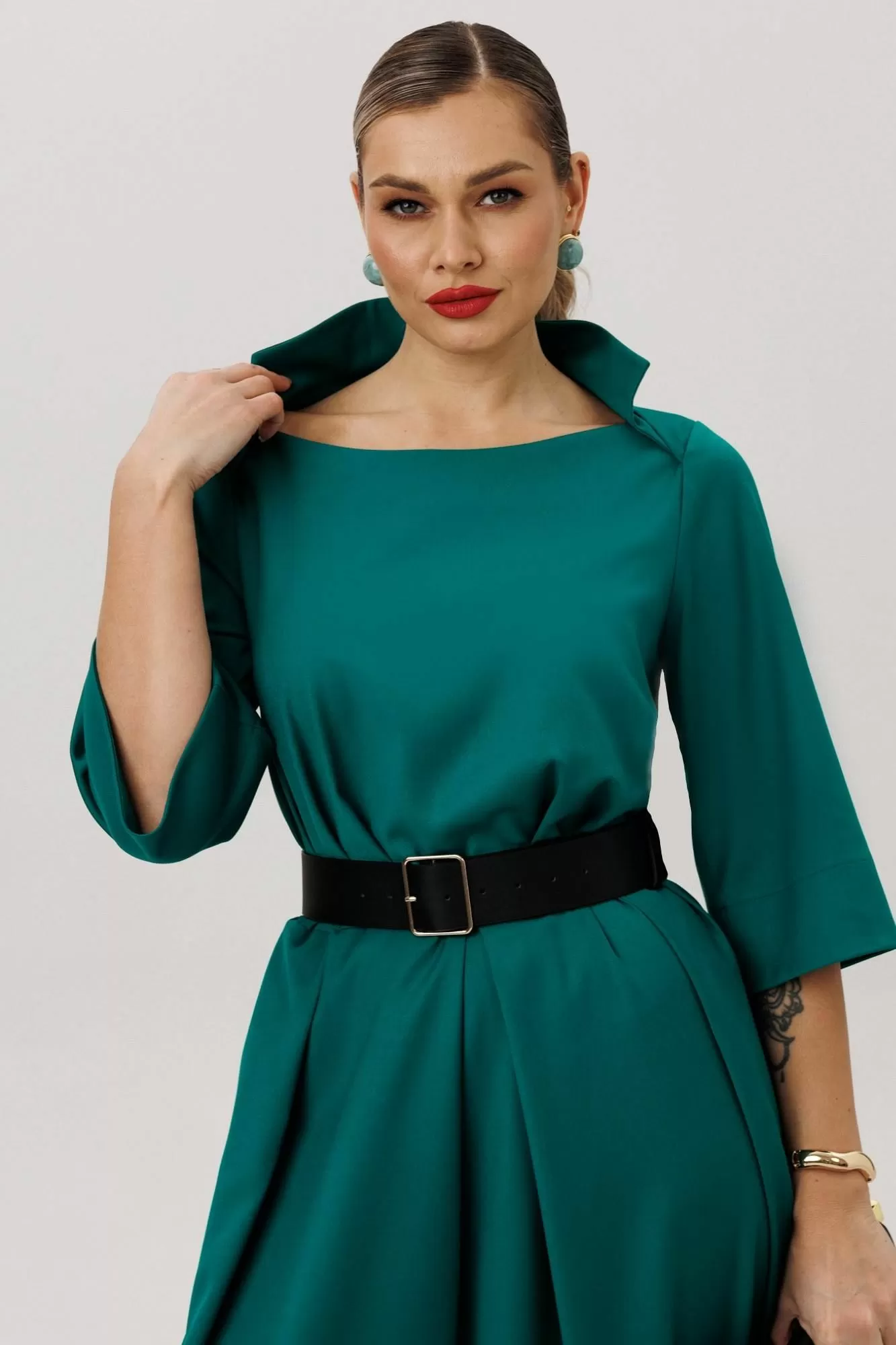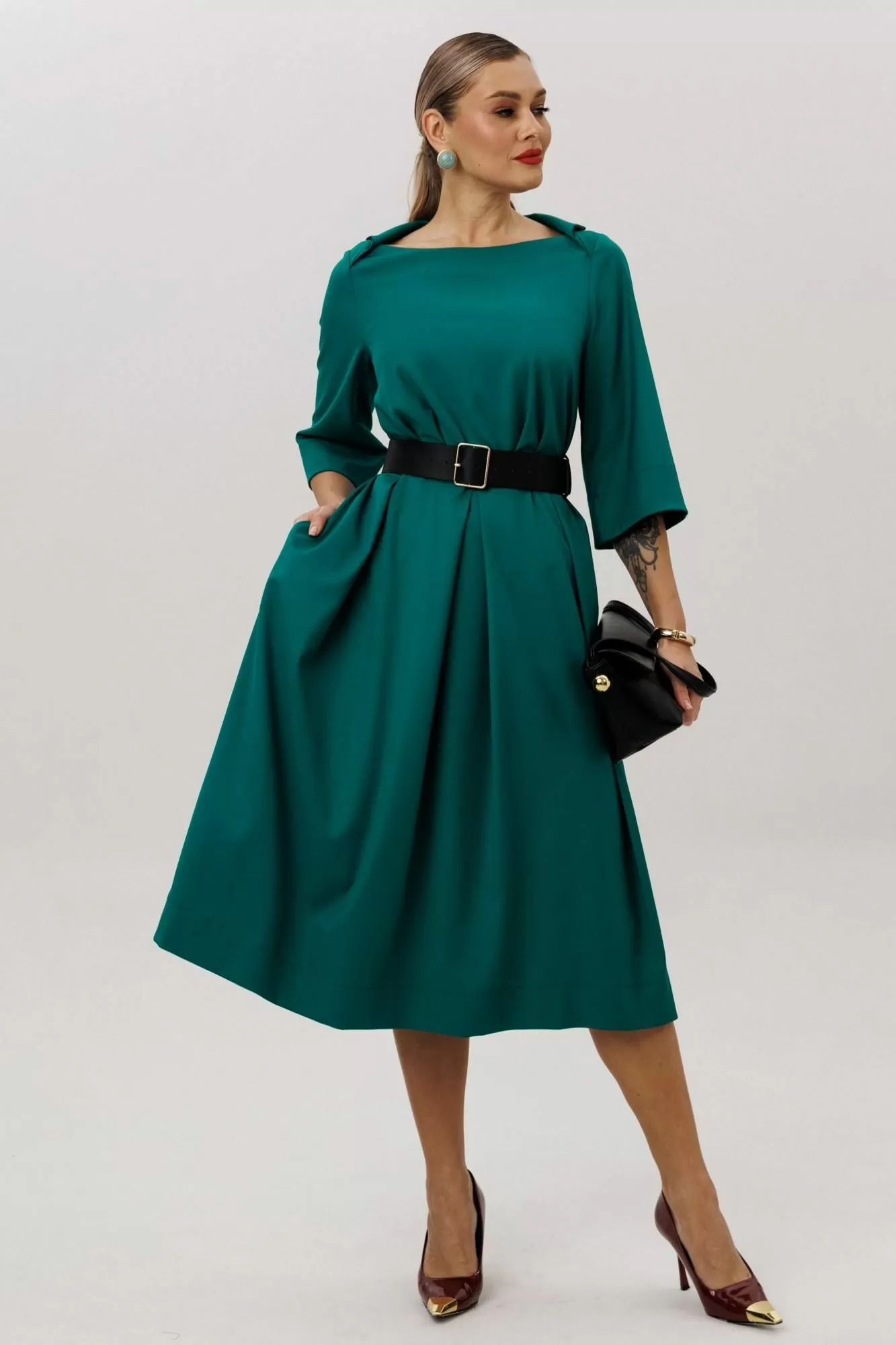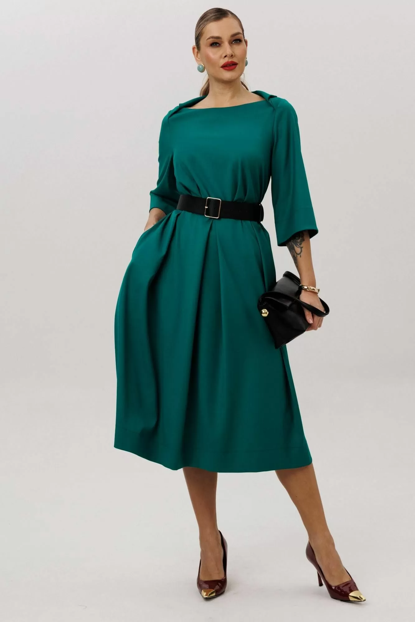 Шикарное платье с поясом ремнем. Отличный вариант универсального изделия: подойдет как для повседневного и офисного гардероба, так и для праздничного выхода. Отрезное по линии талии. По полочке объем груди создается за счет направленных складок из подреза. Объем юбки создается за счет центральной встречной и 2-х односторонних складок. По бокам в юбке- карманы. Рукав втачной, 3/4 длинны с отворотом. Вырез горловины лодочка с отложным воротником. В комплекте съемный пояс. Длина спинки до подреза -45 см., длина юбки -77см. Длина рукава-44 см.