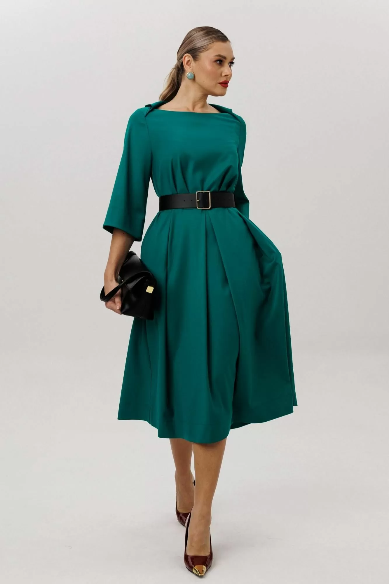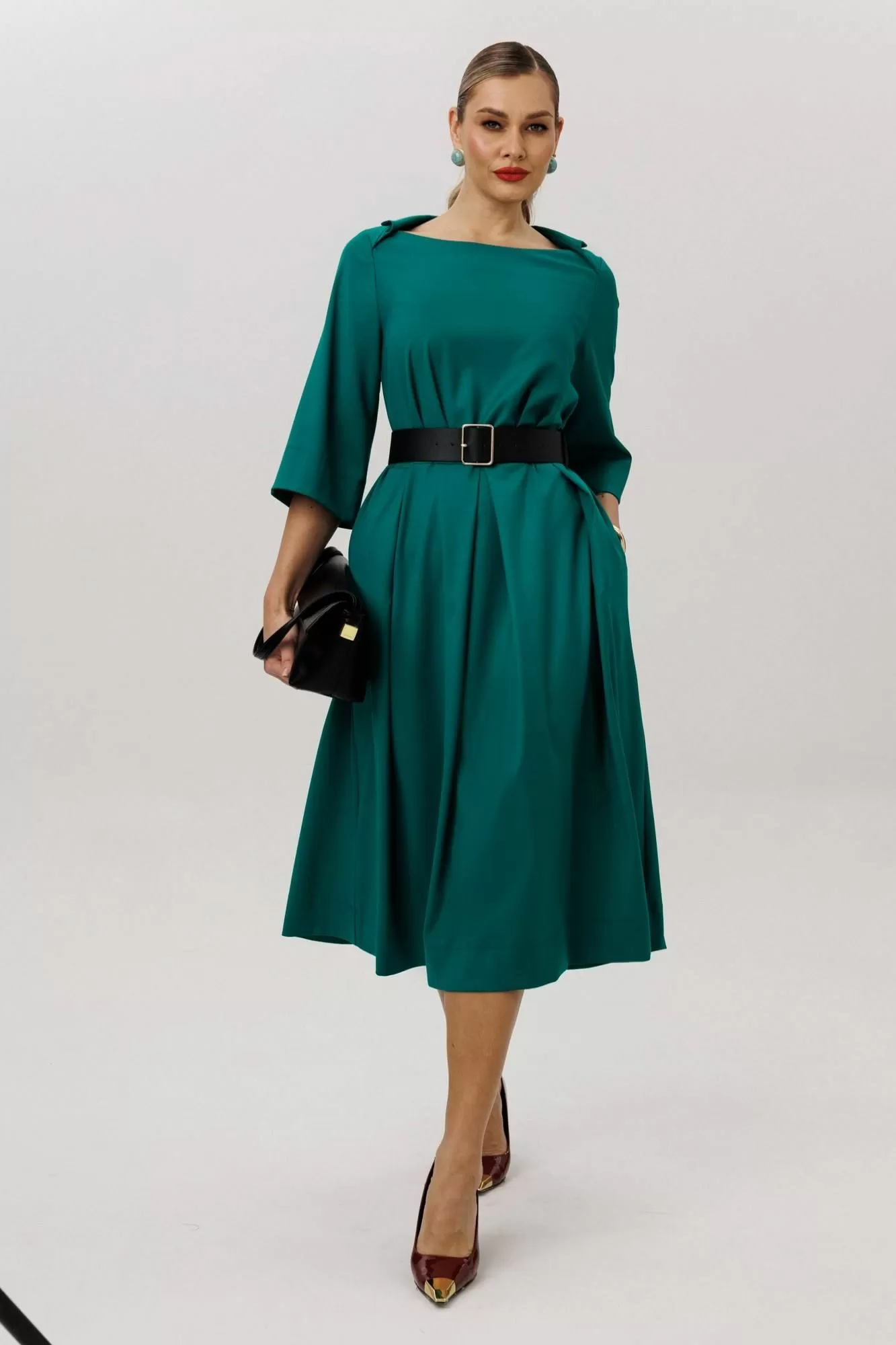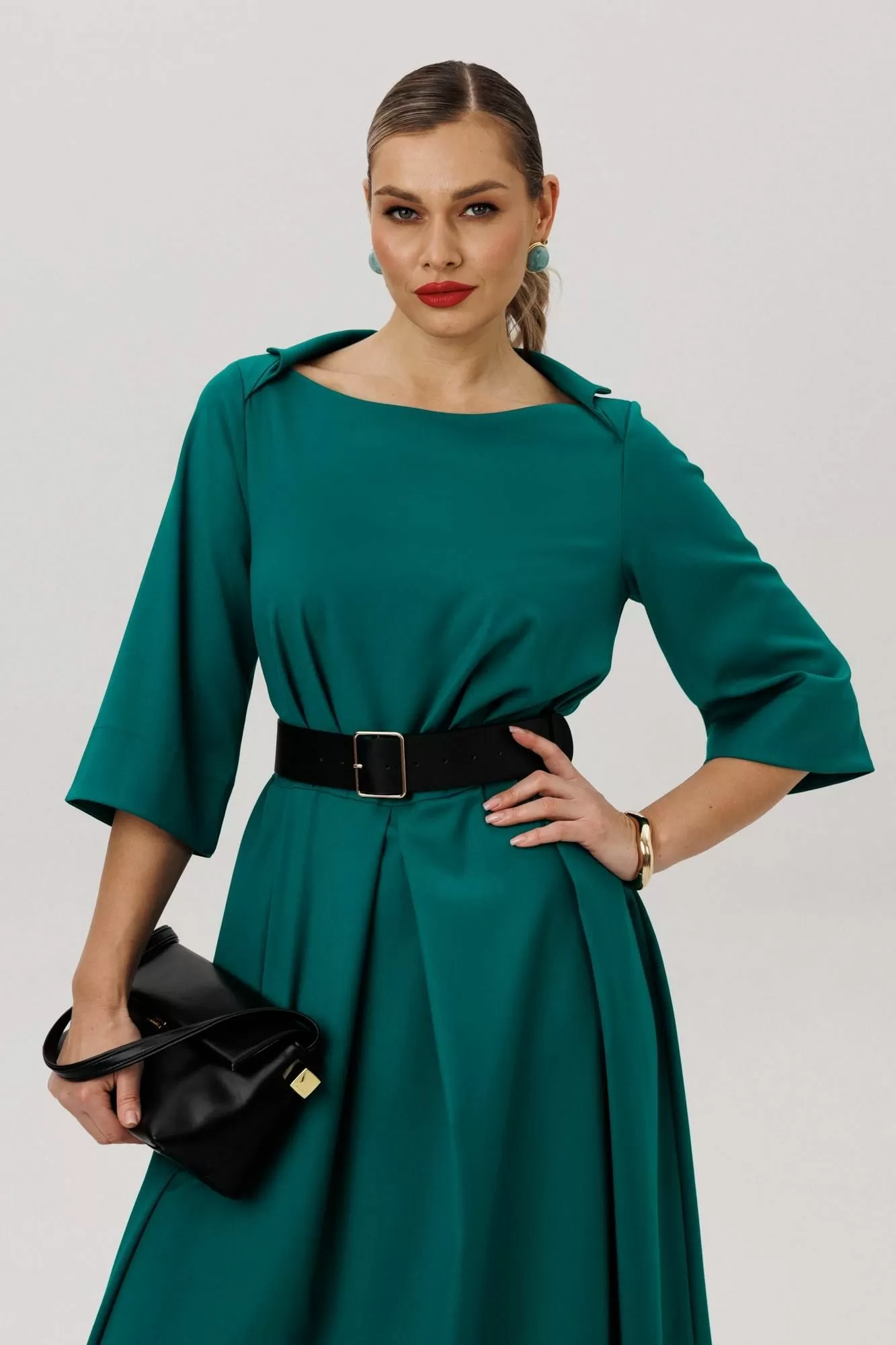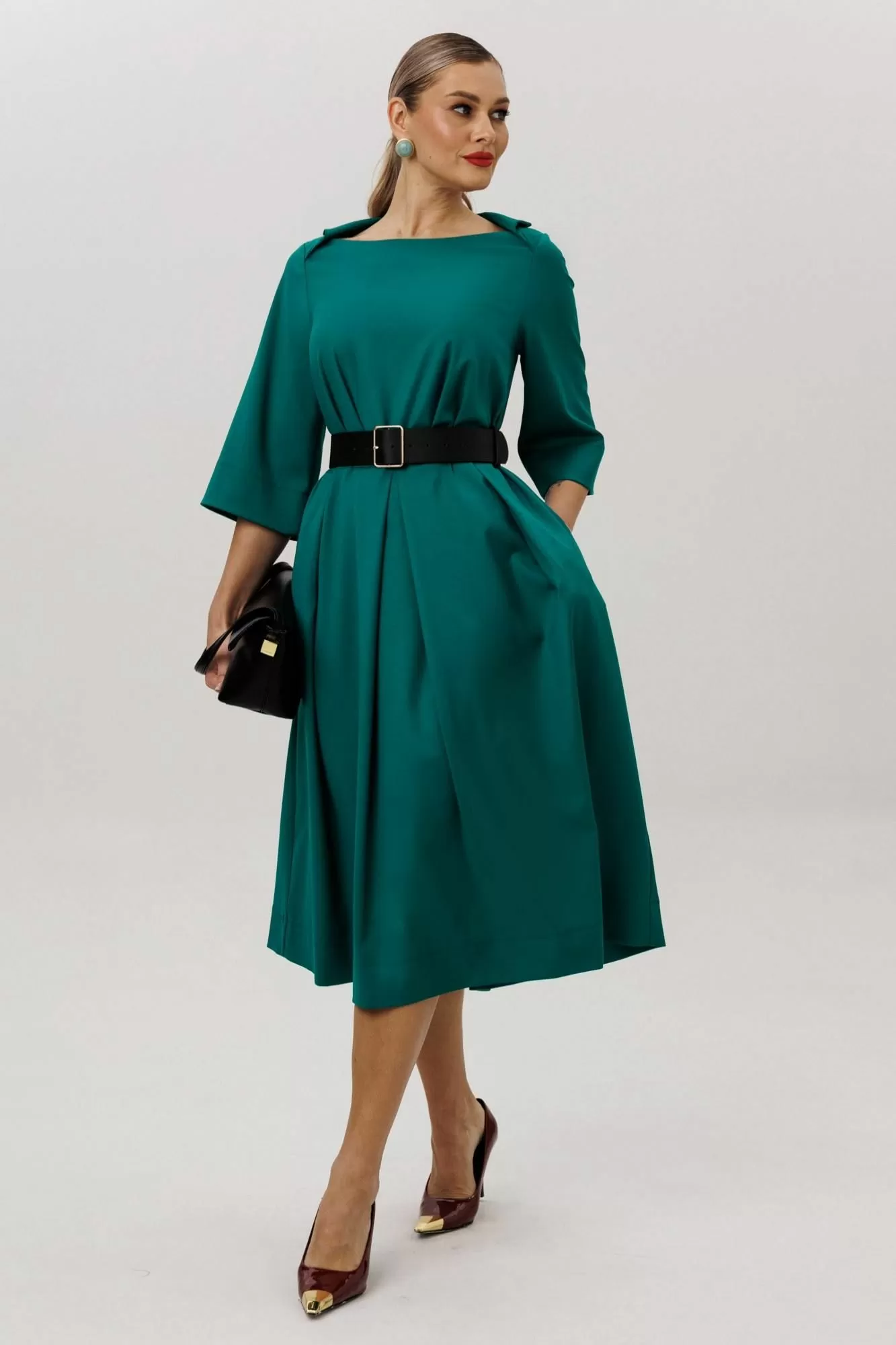 Шикарное платье с поясом ремнем. Отличный вариант универсального изделия: подойдет как для повседневного и офисного гардероба, так и для праздничного выхода. Отрезное по линии талии. По полочке объем груди создается за счет направленных складок из подреза. Объем юбки создается за счет центральной встречной и 2-х односторонних складок. По бокам в юбке- карманы. Рукав втачной, 3/4 длинны с отворотом. Вырез горловины лодочка с отложным воротником. В комплекте съемный пояс. Длина спинки до подреза -45 см., длина юбки -77см. Длина рукава-44 см.