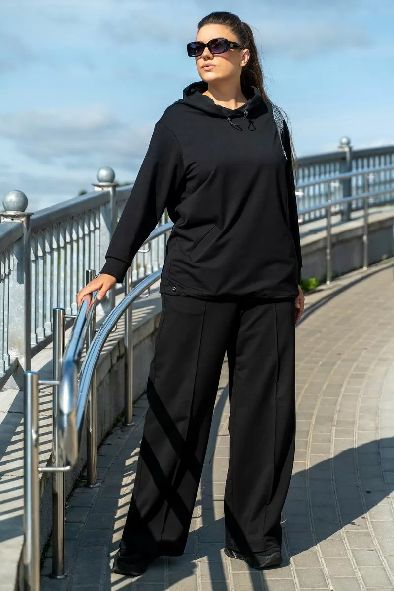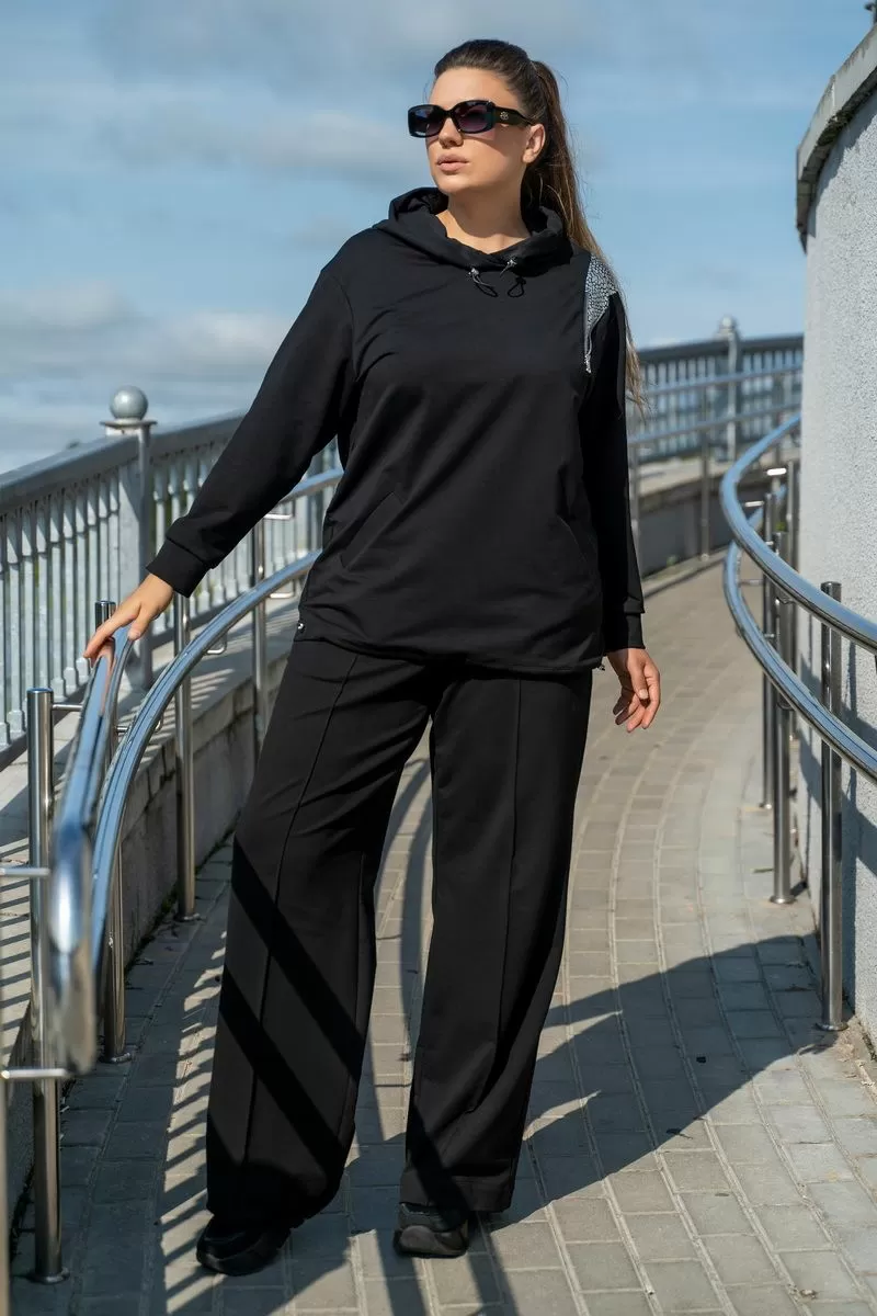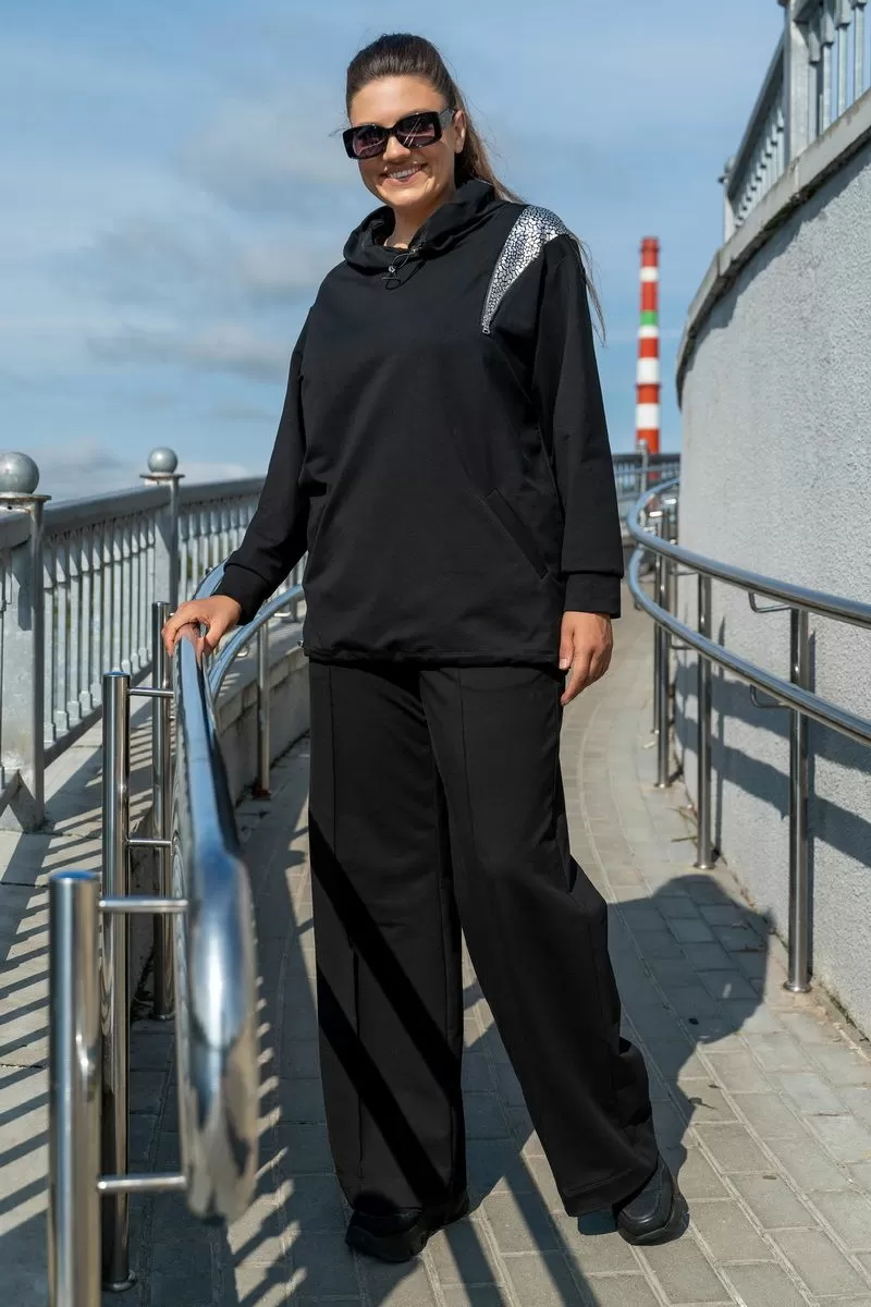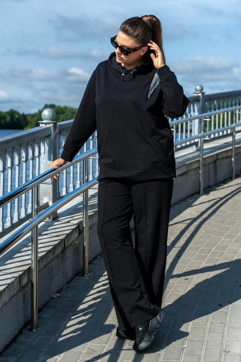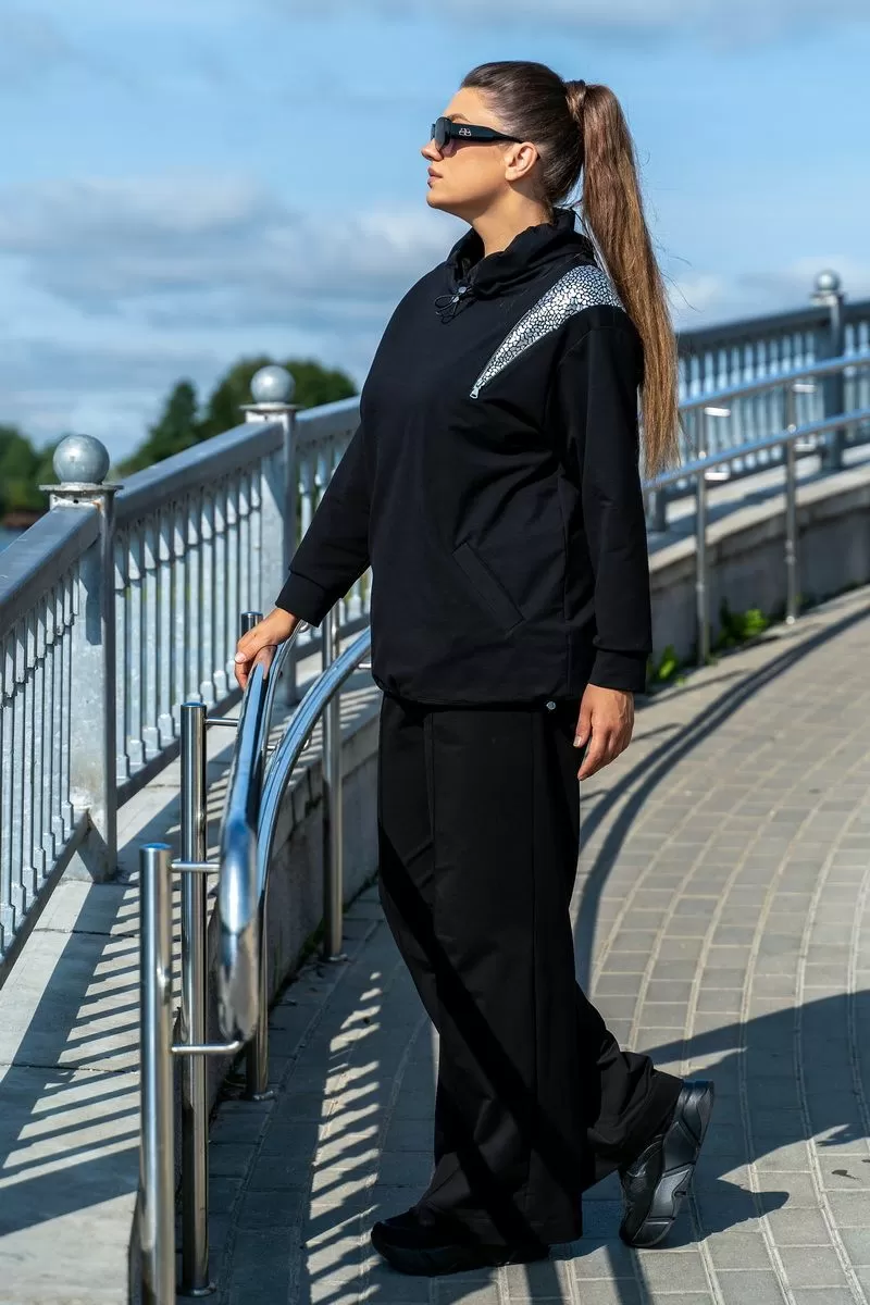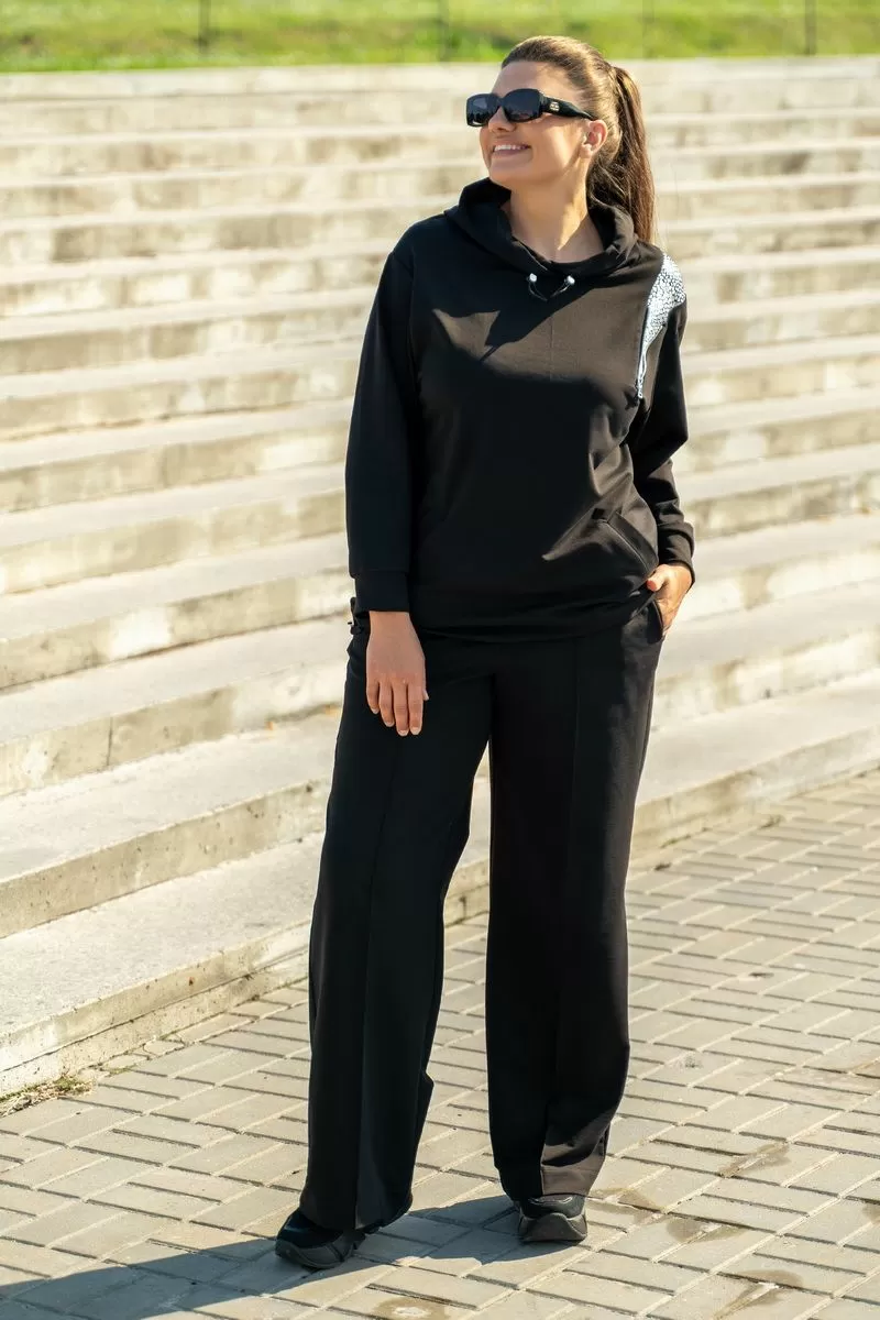 Костюм женский спортивный современный в стиле спорт-шик, джемпер со вставками " под змею серебро". Джемпер с с большим капюшоном с протяжками и металлическими наконечниками, с прорезными карманами с листочками, с втачными рукавами с притачными манжетами, по низу джемпера сс протяжками и металлическими наконечниками. джемпер со вставкой с молнией по полочке и переходящяя на спинку. Брюки на поясе с резинкой , в швах боковые карманы, передние половинками с защипами.