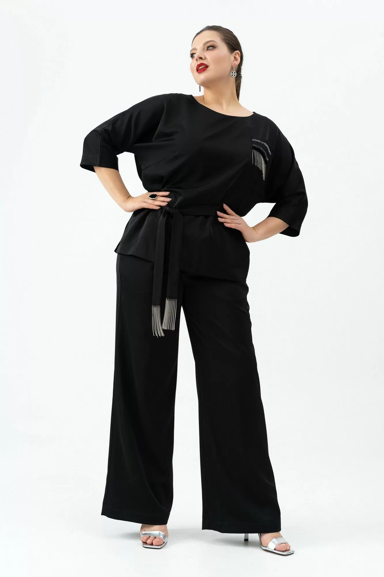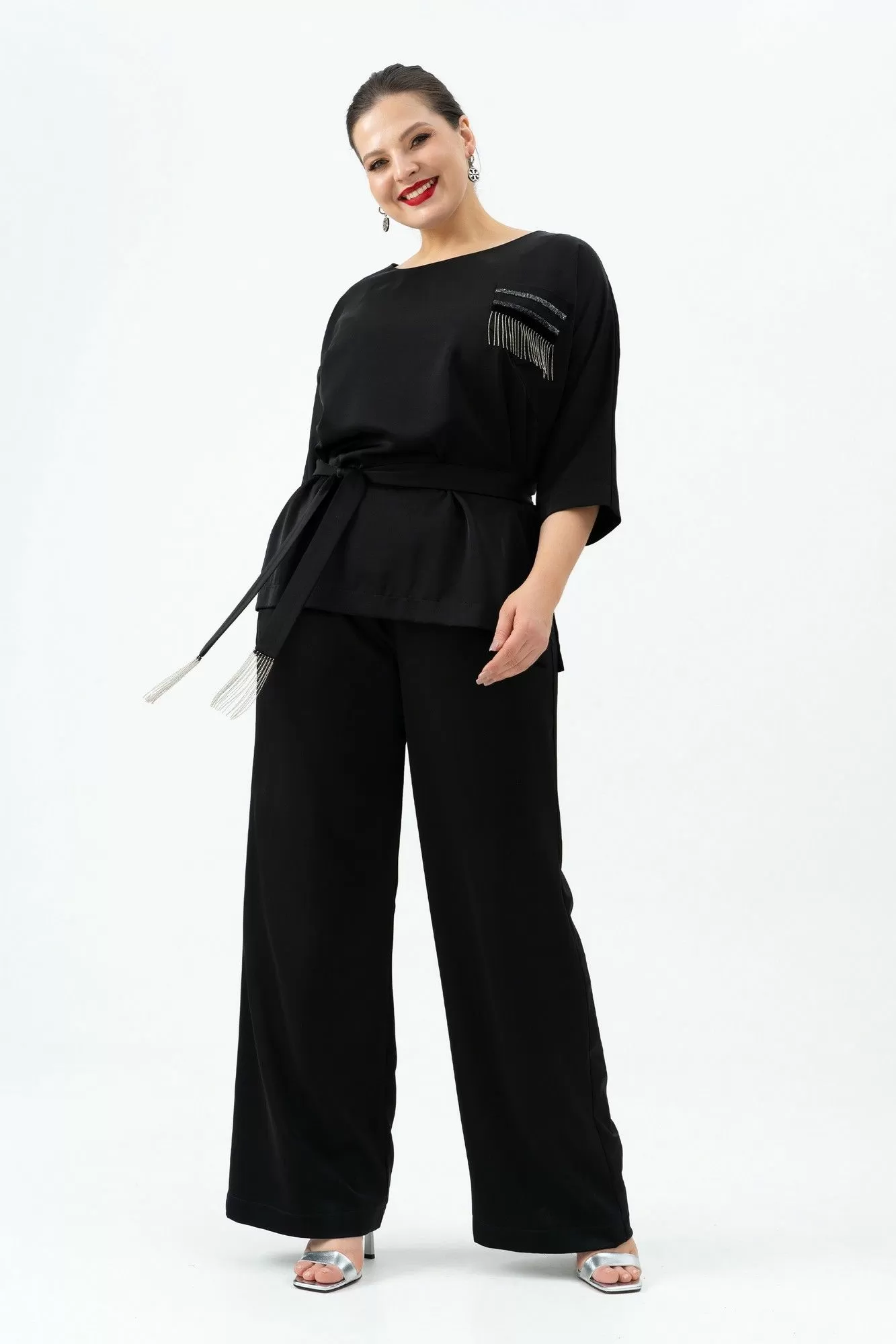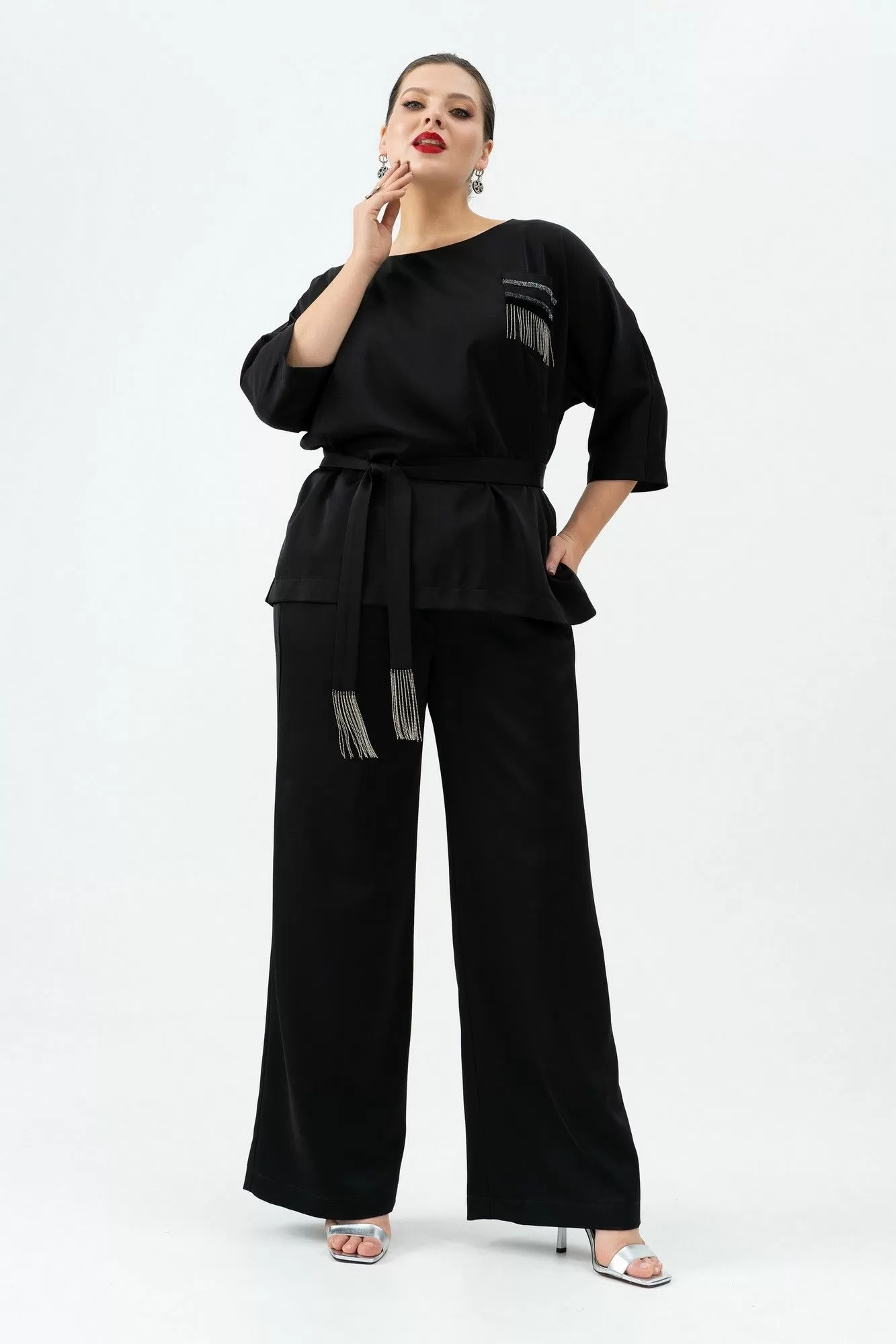 Костюм женский брючный классика для любого мероприятия. Туника прямого силуэта, с нагрудными вытачками, с декоративным карманом, с боковыми разрезами. Брюки женские прямого кроя, на притачном поясе по переду и с пояс с резинкой по спинке. Передние половинки с карманами в швах.