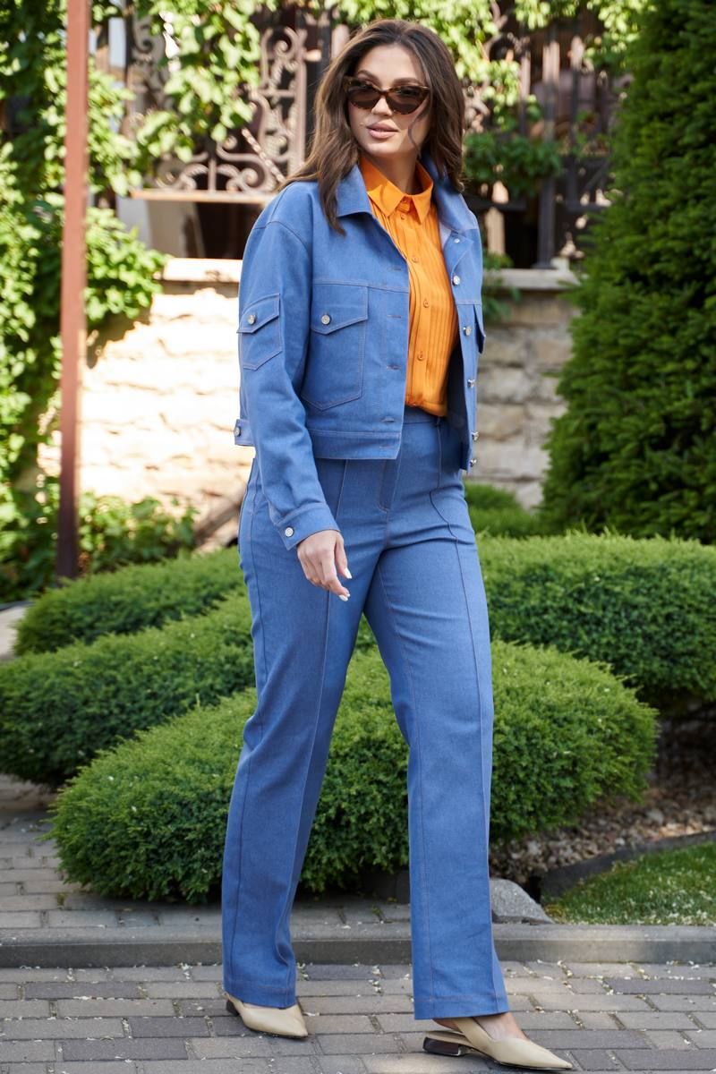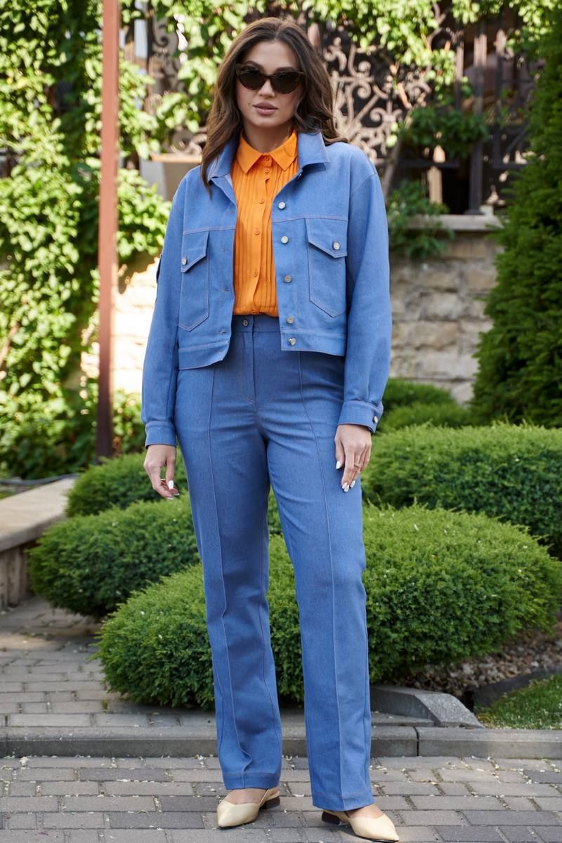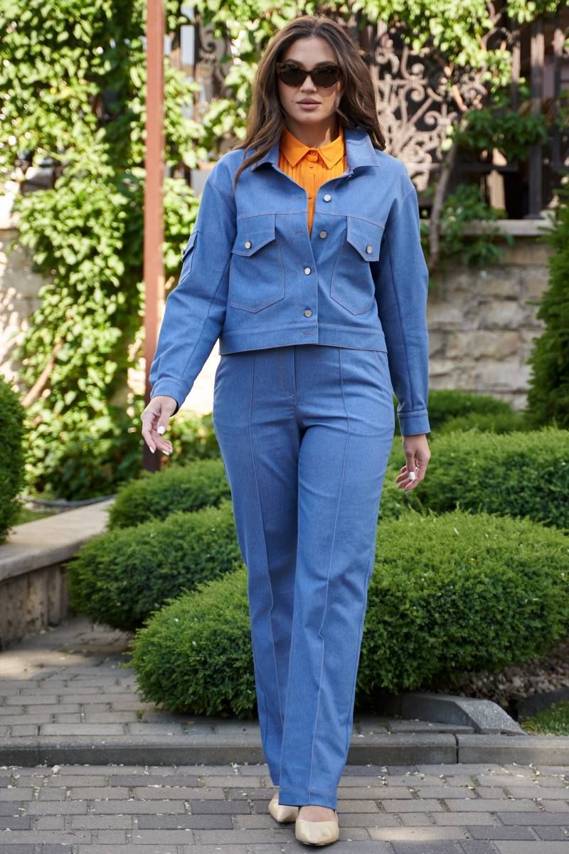 Жакет женский из джинсовой ткани. Джинсовка прямого силуэта с воротником, центральной застежкой на петли и джинсовые пуговицы, с поясом по низу. Перед с кокеткой и накладными карманами с клапаном, левый карман с декоративной нашивкой. Спинка с кокеткой, с патами по поясу. Рукава втачные с манжетом по низу, на правом рукаве карман с клапаном.