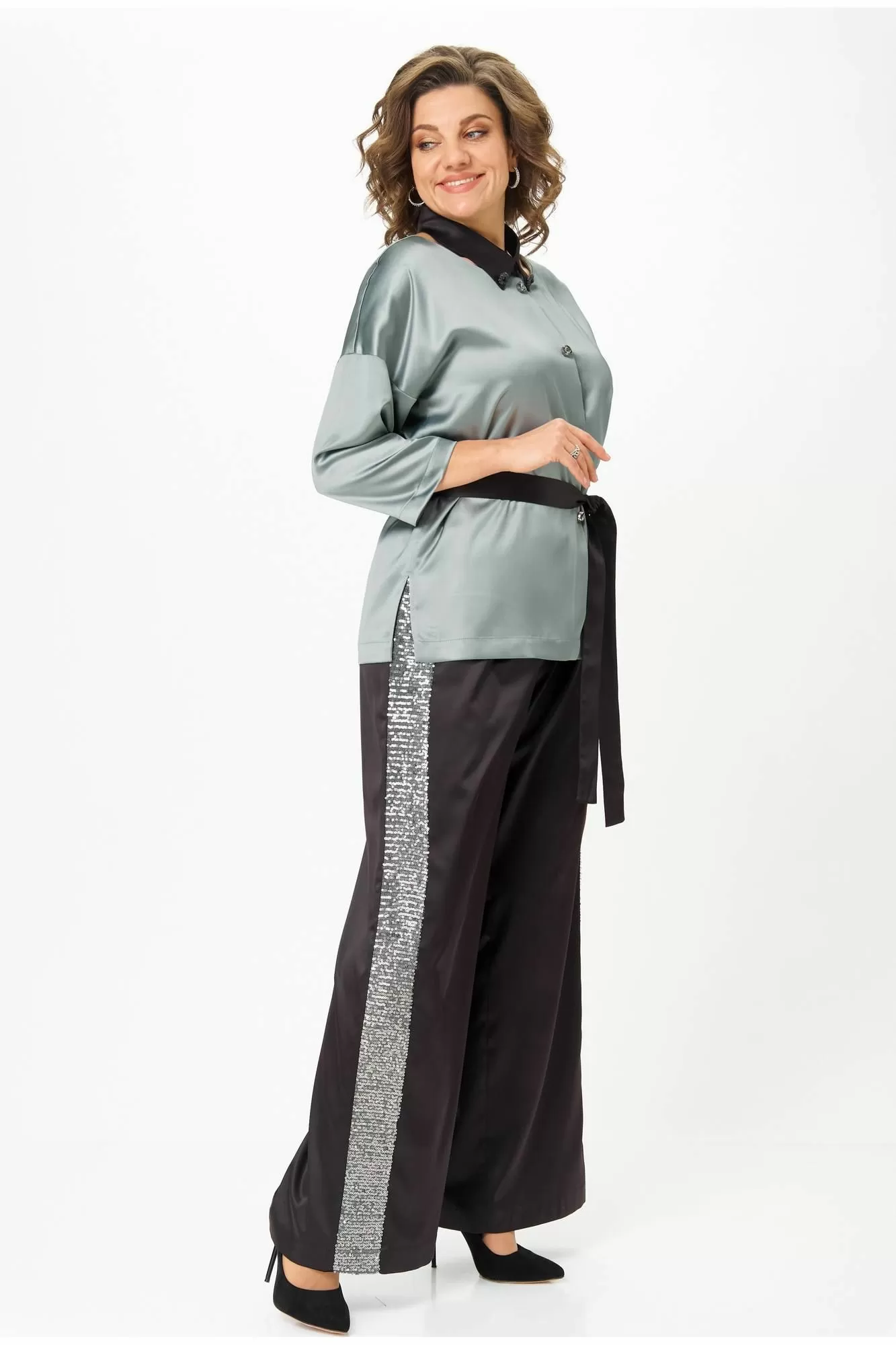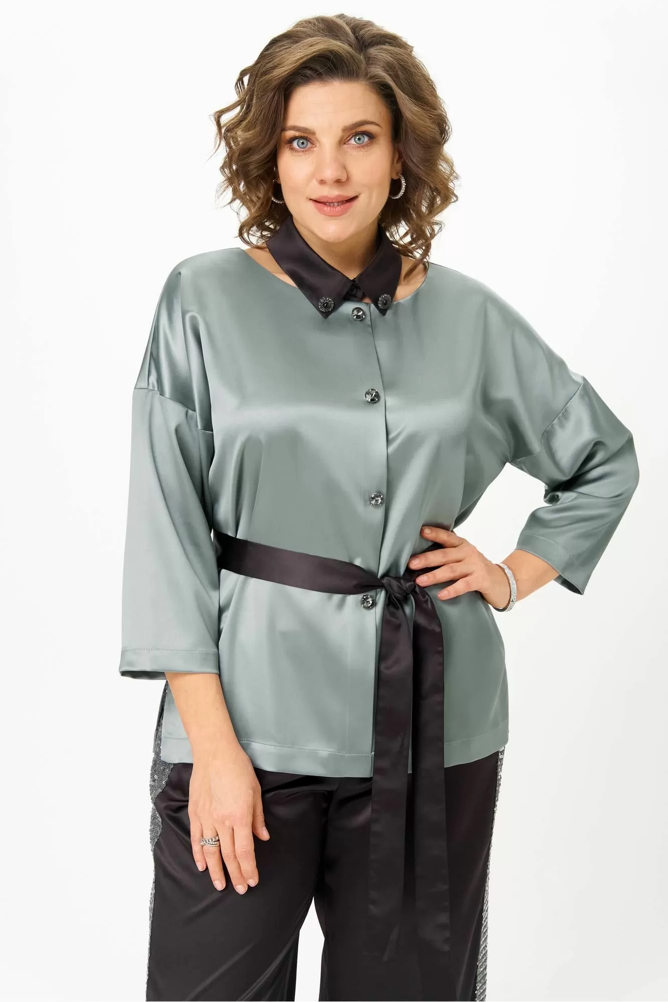 Стильная атласная блузка со съёмным воротником и дизайнерскими пуговицами, способна сделать ваш гардероб еще более модным и уникальным. Модель с рукавом ¾, свободным прямым кроем и съёмным поясом подойдет для любой фигуры, подчеркнёт её достоинства и скроет недостатки.