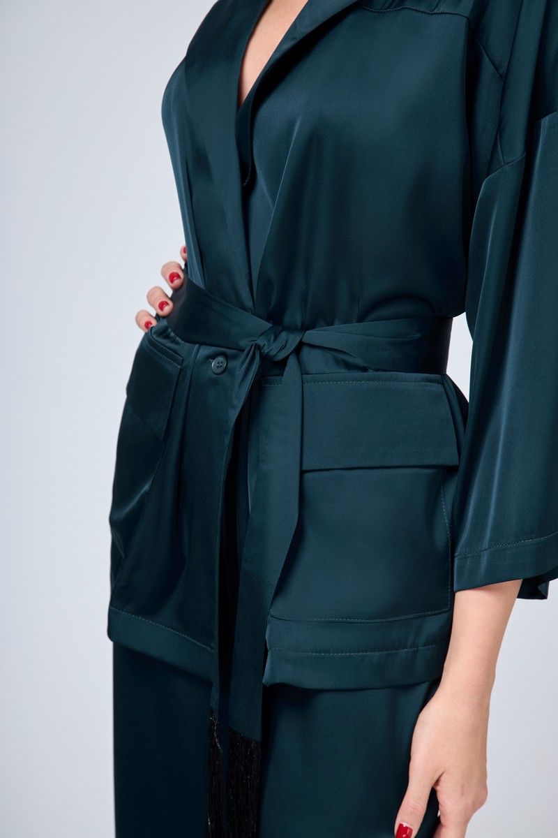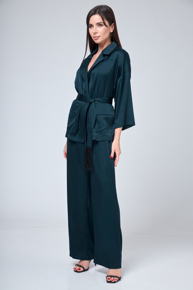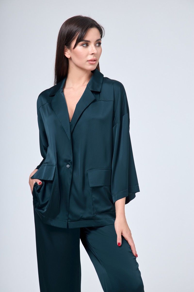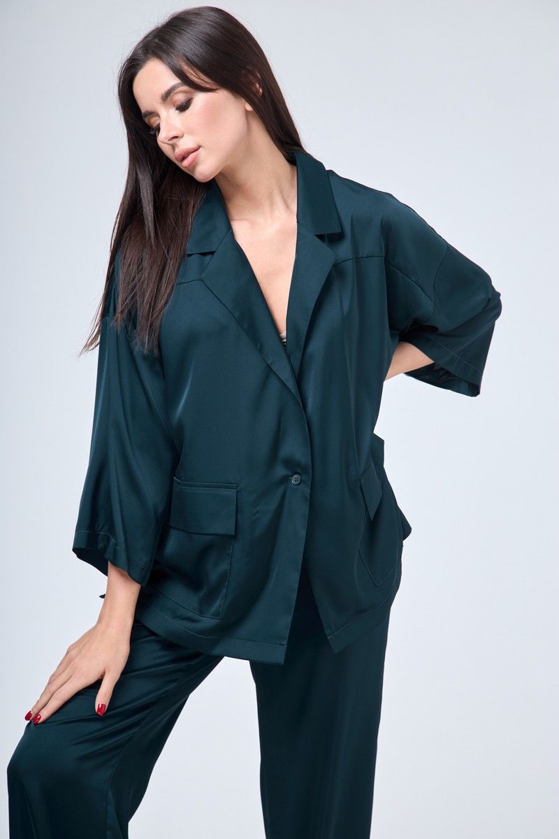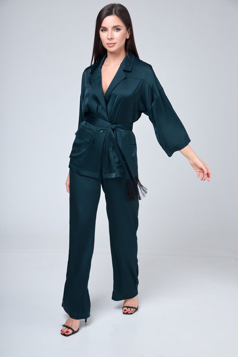 Пижамный комплект для уверенных в себе женщин, которые смело могут пойти в нем, как на работу, так и на свидание или прогулку. Жакет прямого силуэта, со спущенной линией плеча, рукав расширен по низу и укорочен, для вашего удобства. По переду накладные карманы, классический воротник с лацканом. Застежка на петлю пуговицу. Съёмный пояс декорирован. Брюки прямые расширенные к низу. Пояс на резинке, поэтому брюки будут на вас сидеть хорошо, вне зависимости от того, похудели ли вы или немного выросли в объемах. Замеры: Рост фотомодели – 171 см. Размер фотомодели – 44 ОГ- обхват груди; ОТ- обхват талии (В брюках на резинке тянется); ОБ- обхват бедер; ДИ- длина изделия; ДР- Длина рукава. Размер 46 ОГ-116; ОТ-114; ДИ- 65; ДР- 34. ОТ-66; ОБ- 98; ДИ- 110. Размер 48 ОГ-120; ОТ-118;ДИ-65 ; ДР-34 . ОТ-70; ОБ- 102; ДИ- 110; Размер 50 ОГ-124; ОТ-122; ДИ-65 ; ДР-34 . ОТ-74; ОБ- 106; ДИ- 110; Размер 52 ОГ-128; ОТ-126; ДИ-65 ; ДР-34 . ОТ-78; ОБ- 110; ДИ- 110; Размер 54 ОГ-132; ОТ-130; ДИ- 65; ДР-34 . ОТ-82; ОБ-114; ДИ- 110;