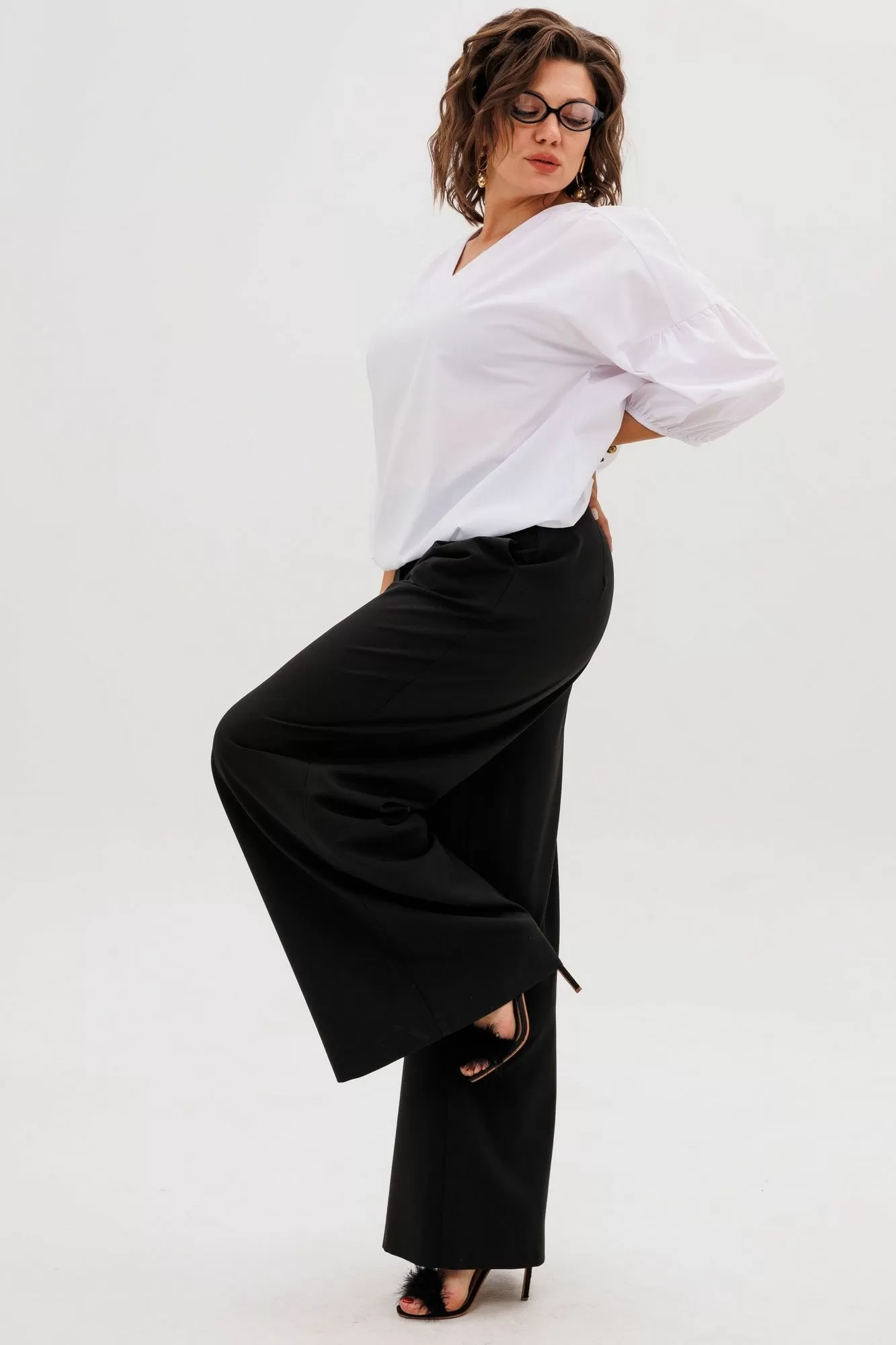 Элегантные брюки-палаццо с современным силуэтом. Модель отличается безупречным кроем с высокой посадкой, который подчеркивает талию и создает выразительный удлиненный контур. Широкие, ниспадающие мягкими складками штанины дарят образу воздушность и непринужденную пластику.