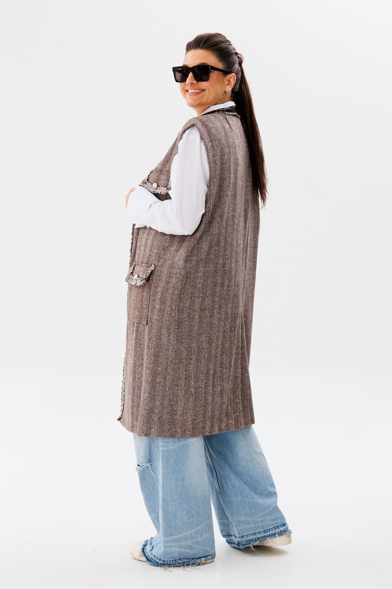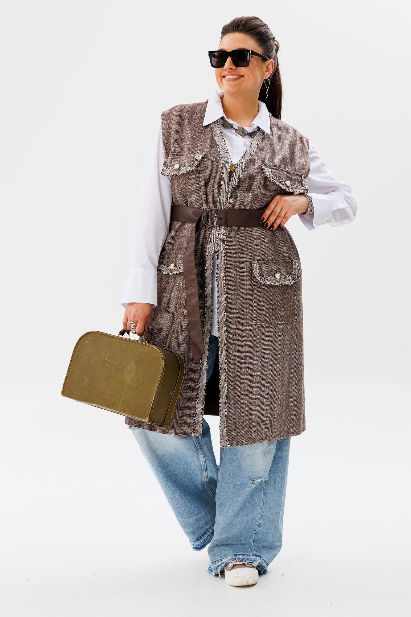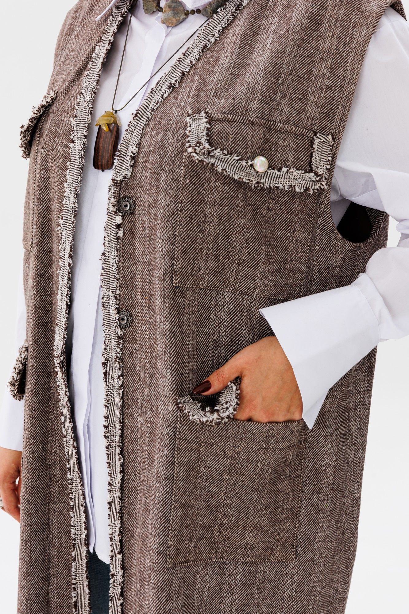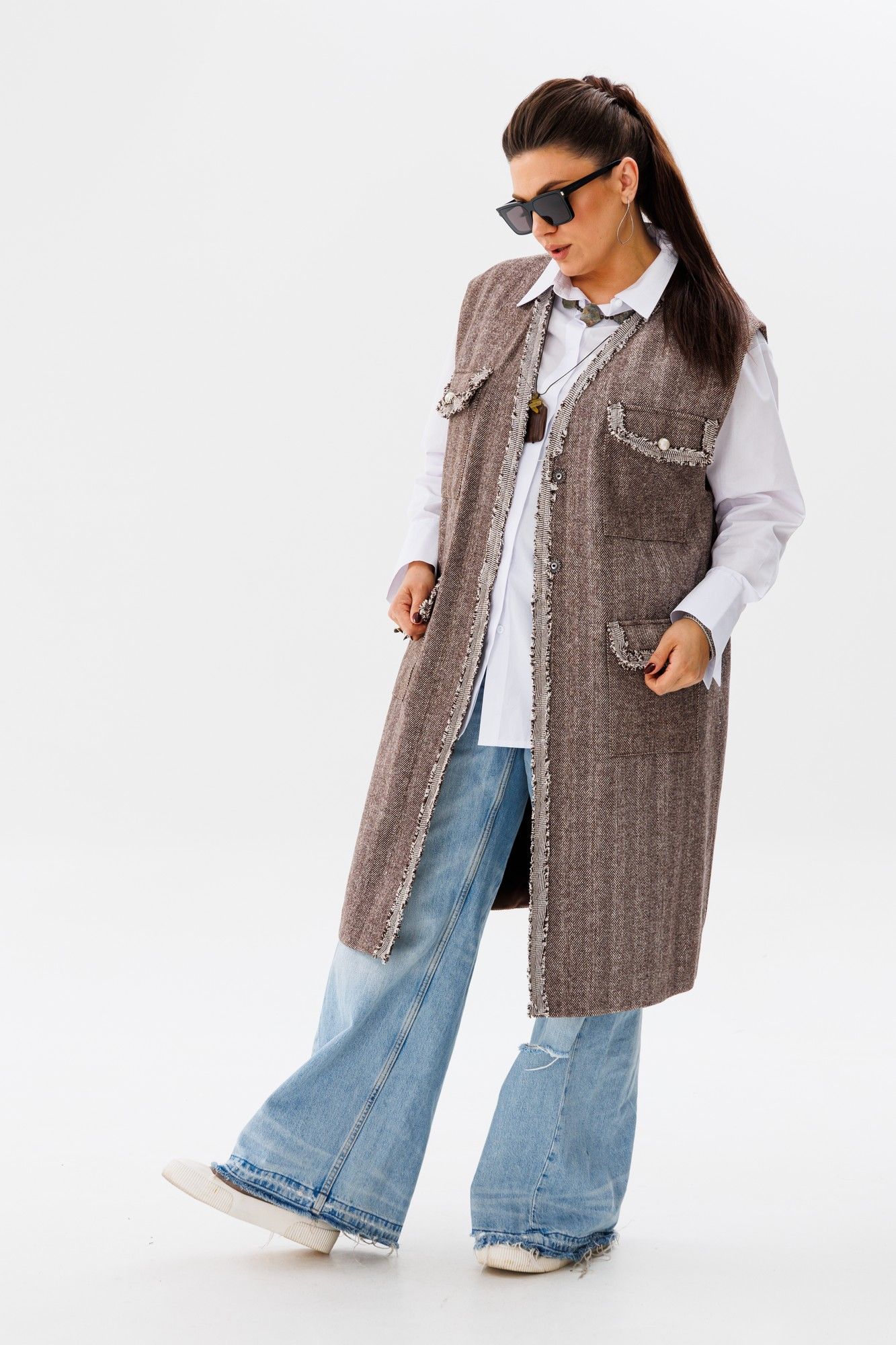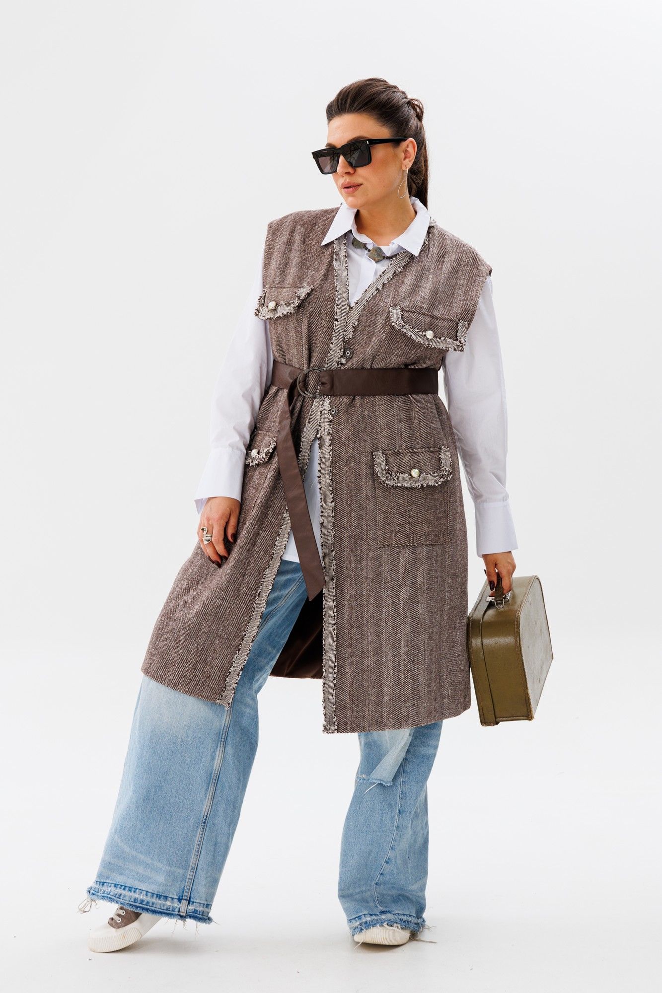 Жилет свободного кроя, который станет незаменимым элементом вашего гардероба. Этот жилет от Анелли, выполненный из плотной ткани, создаёт ощущение свободы и непринуждённости, даря комфорт и стиль одновременно. Его подчёркнуто свободный силуэт идеально подходит для любых типов фигур, обеспечивая безупречную посадку и комфорт. Великолепные классические цвета делают его универсальным выбором, который гармонично впишется в любой образ. Стилизованные накладные карманы с клапанами и отделка тесьмой ручной работы придают жилету особый шарм и утончённость. Перламутровые пуговицы добавляют элегантности и утончённого блеска. В комплекте идёт пояс, который поможет подчеркнуть талию и создать ещё более изысканный образ. Благодаря своей актуальной длине и универсальному дизайну, этот жилет позволяет создавать множество интересных и разнообразных образов, подходящих как для деловых встреч, так и для повседневных прогулок. Добавьте в свой гардероб эту изысканную деталь, и вы не пожалеете! Замеры: Размер 50: ОГ-116; ОТ-118; ОБ-120; ДИ-105; ШП-15,5; Размер 52: ОГ-120; ОТ-122; ОБ-124; ДИ-104; ШП-16; Размер 54: ОГ-124; ОТ-126; ОБ-128; ДИ-105; ШП-16,5; Размер 56: ОГ-128; ОТ-130; ОБ-132; ДИ-104; ШП-16,5; Размер 58: ОГ-132; ОТ-134; ОБ-136; ДИ-104; ШП-16,5.