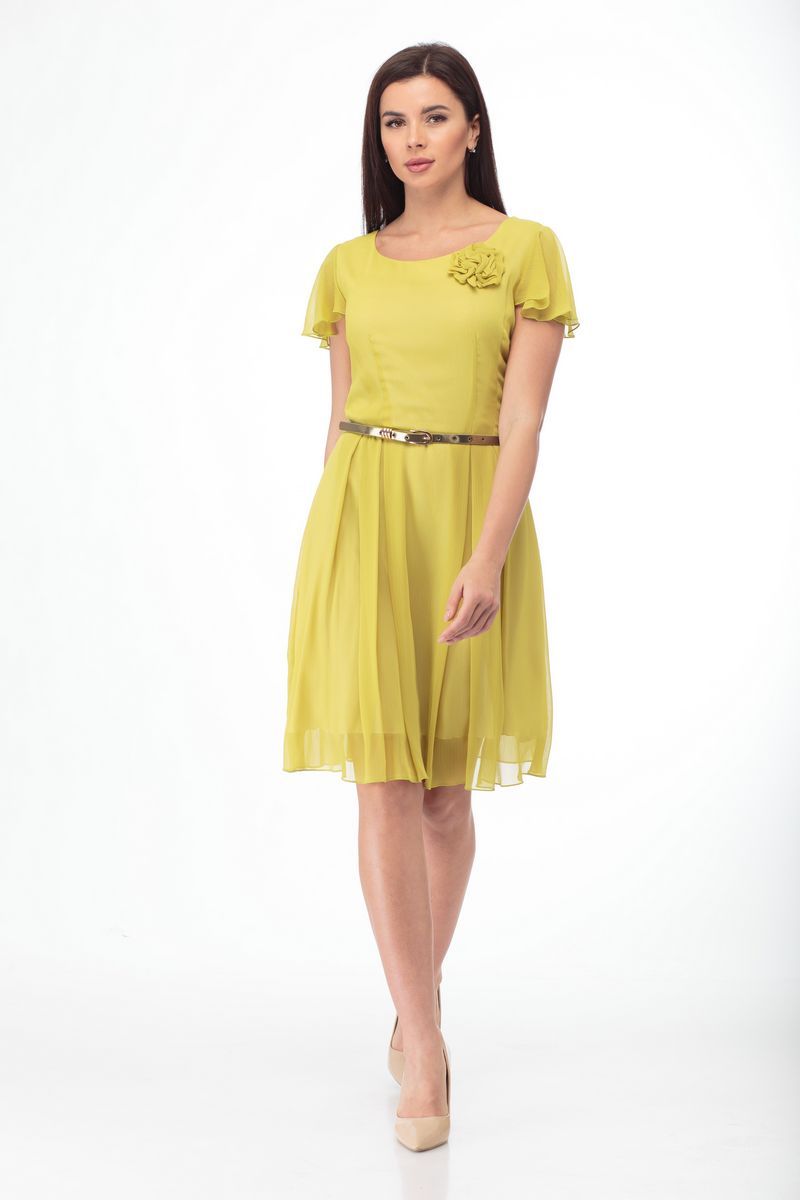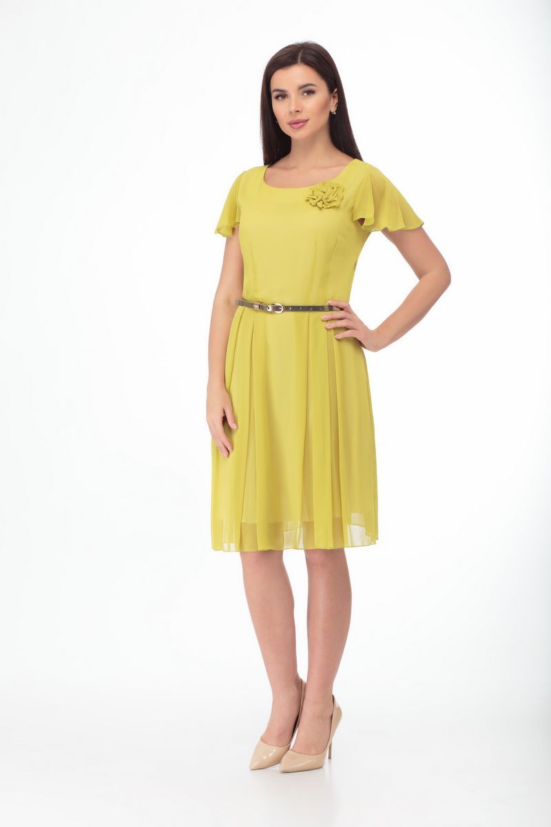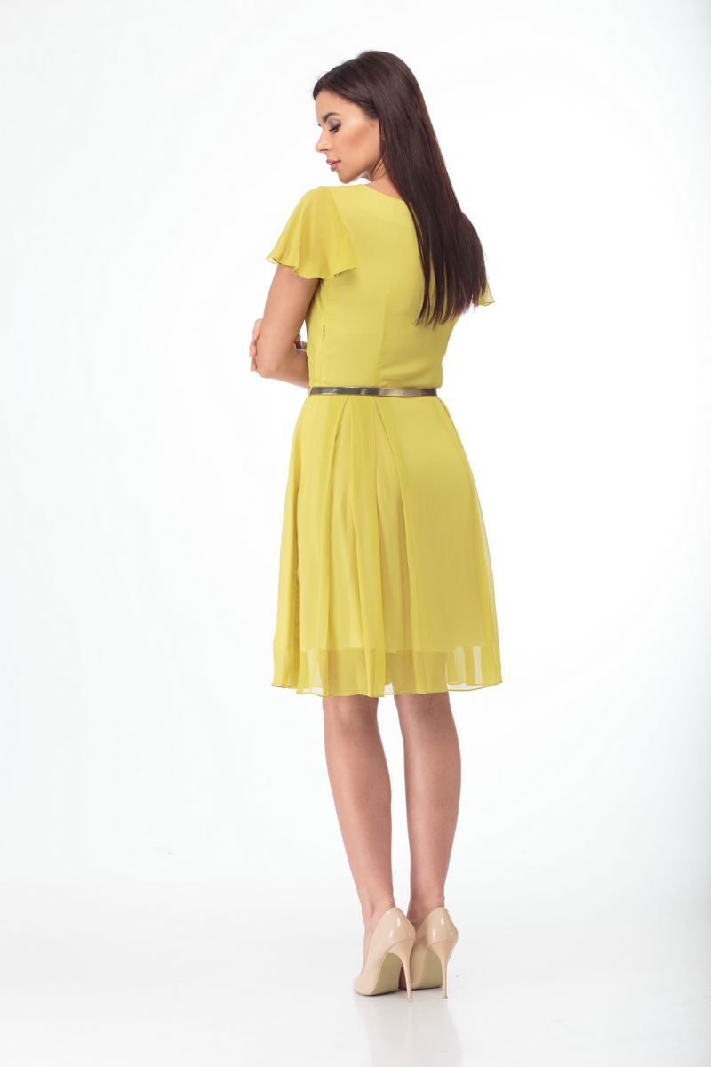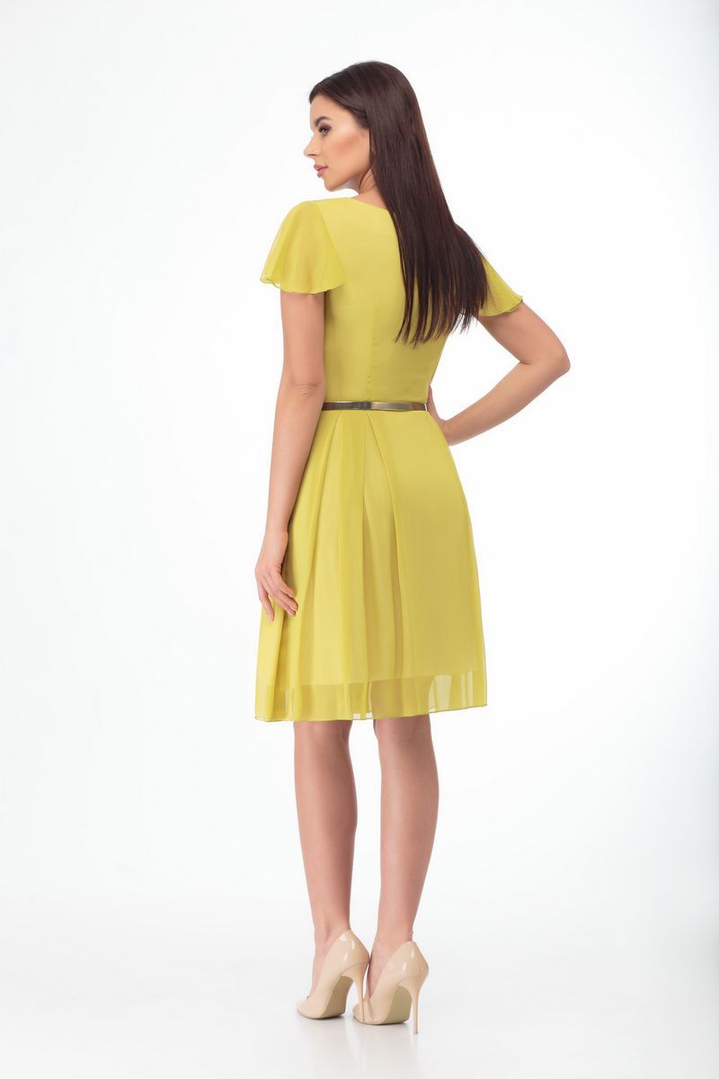 Шифоновое платье на подкладке, полуприлегающего силуэта, среднего объема, длиной до колена. Отрезное по линии талии с юбкой А-силуэта. Перед с параллельными талиевыми вытачками, спинка с талиевыми вытачками, на юбке обработаны складки, вырез горловины округлый, в левом боковом шве обработана потайная застёжка молния. Рукав короткий в виде крылышка. Платье дополнено готовым ремешком в тон. Платье выполнено в нескольких расцветках. Замеры: Рост фотомодели 171 см. ОГ- обхват груди; ОТ- обхват талии; ОБ – обхват бедер (подкладка); ДИ – длина изделия; ДР – длина рукава. Размер 44. ОГ-88; ОТ-78; ОБ-126; ДИ-87; ДР-15. Размер 46. ОГ-92; ОТ-80; ОБ-128; ДИ-87; ДР-16. Размер 48. ОГ-96; ОТ-84; ОБ-130; ДИ-88; ДР-16. Размер 50. ОГ-100; ОТ-88; ОБ-132; ДИ-89; ДР-16.