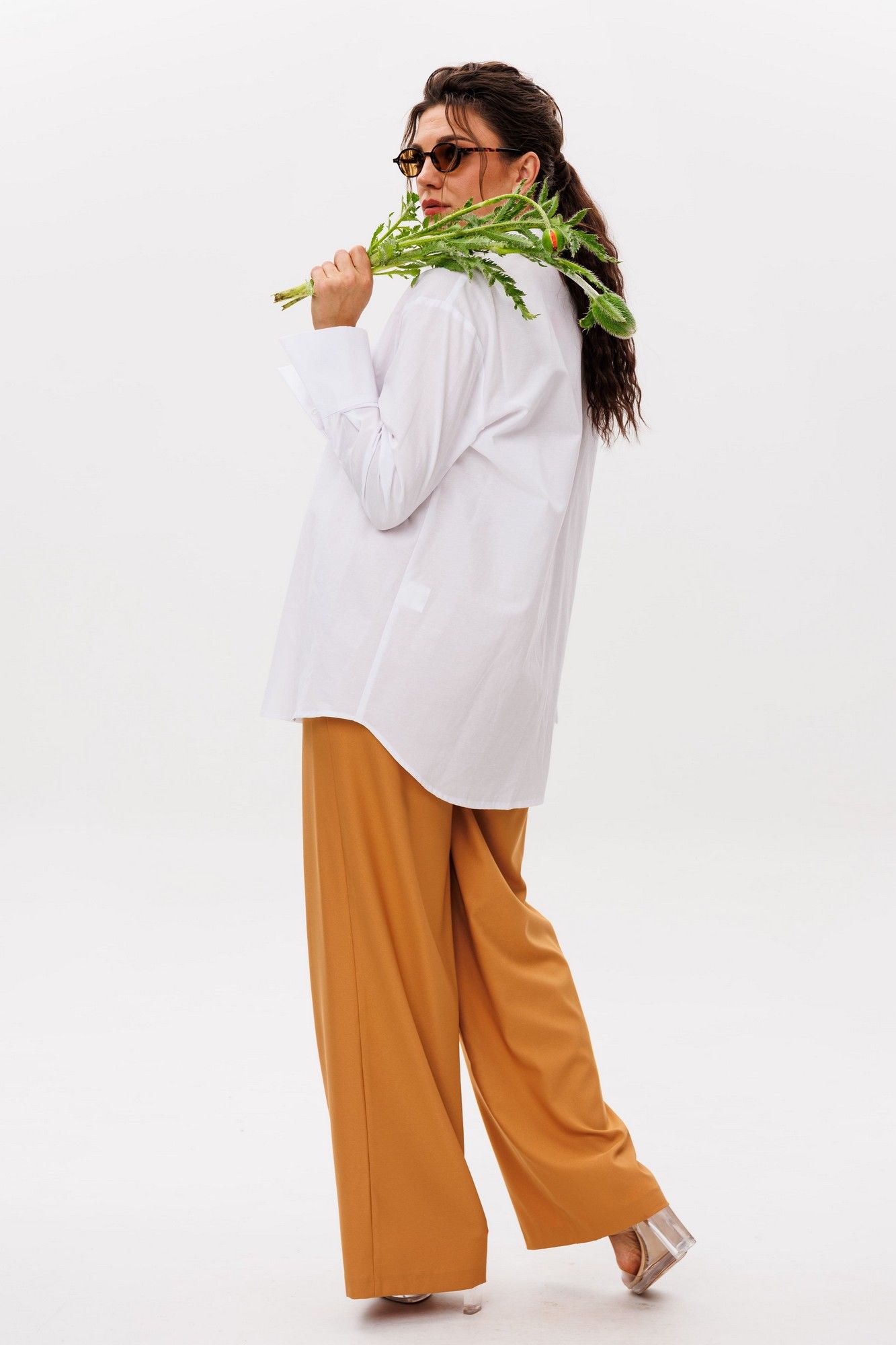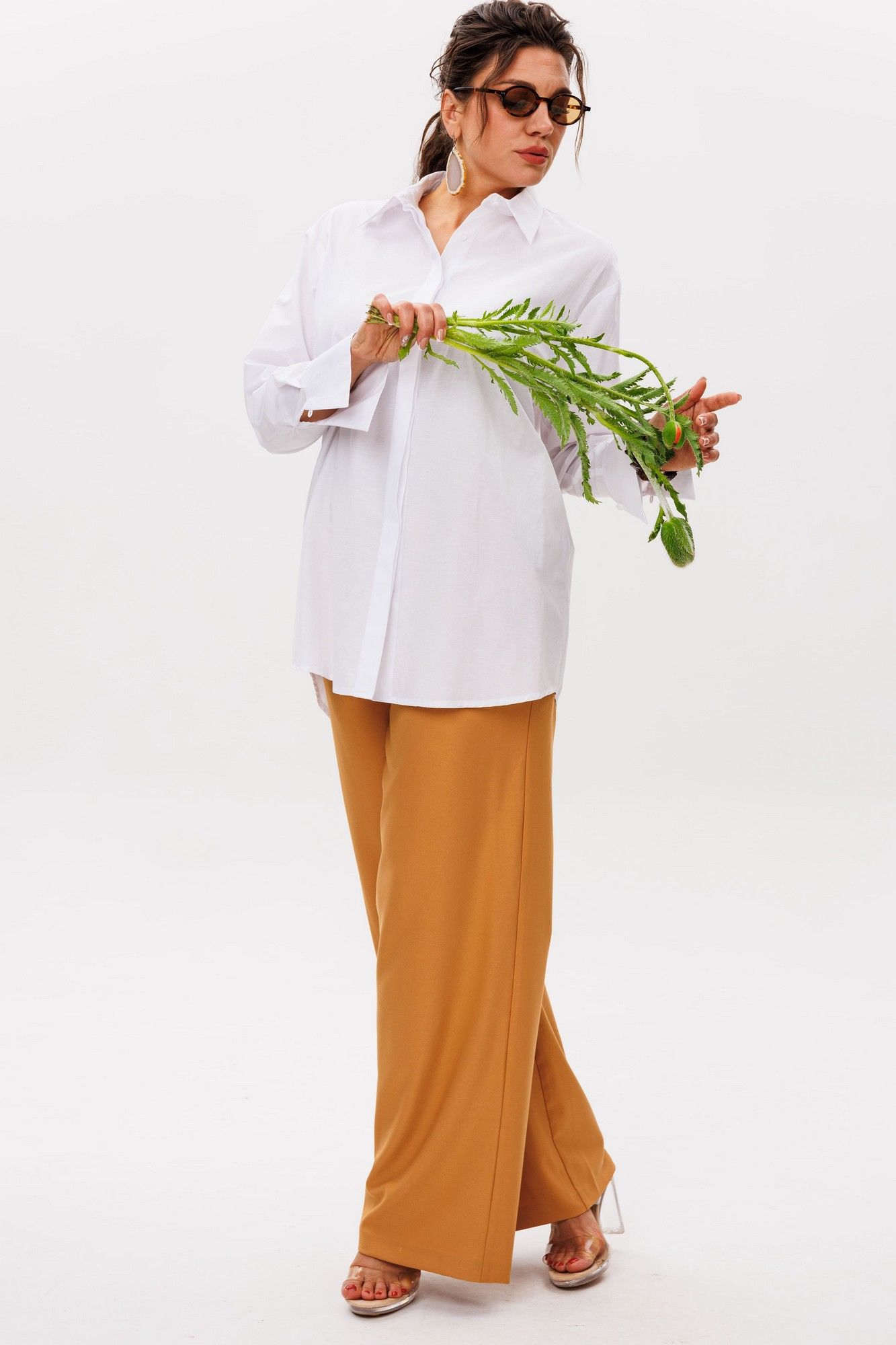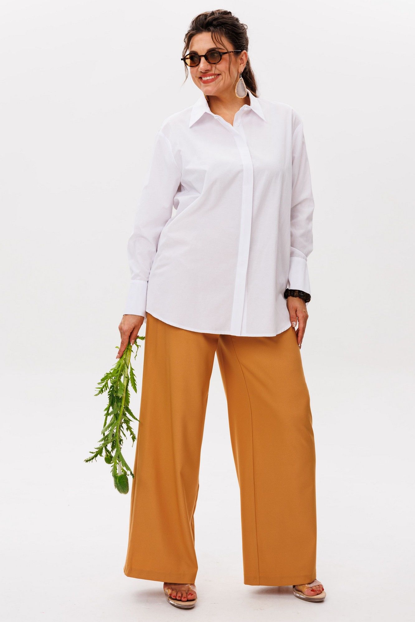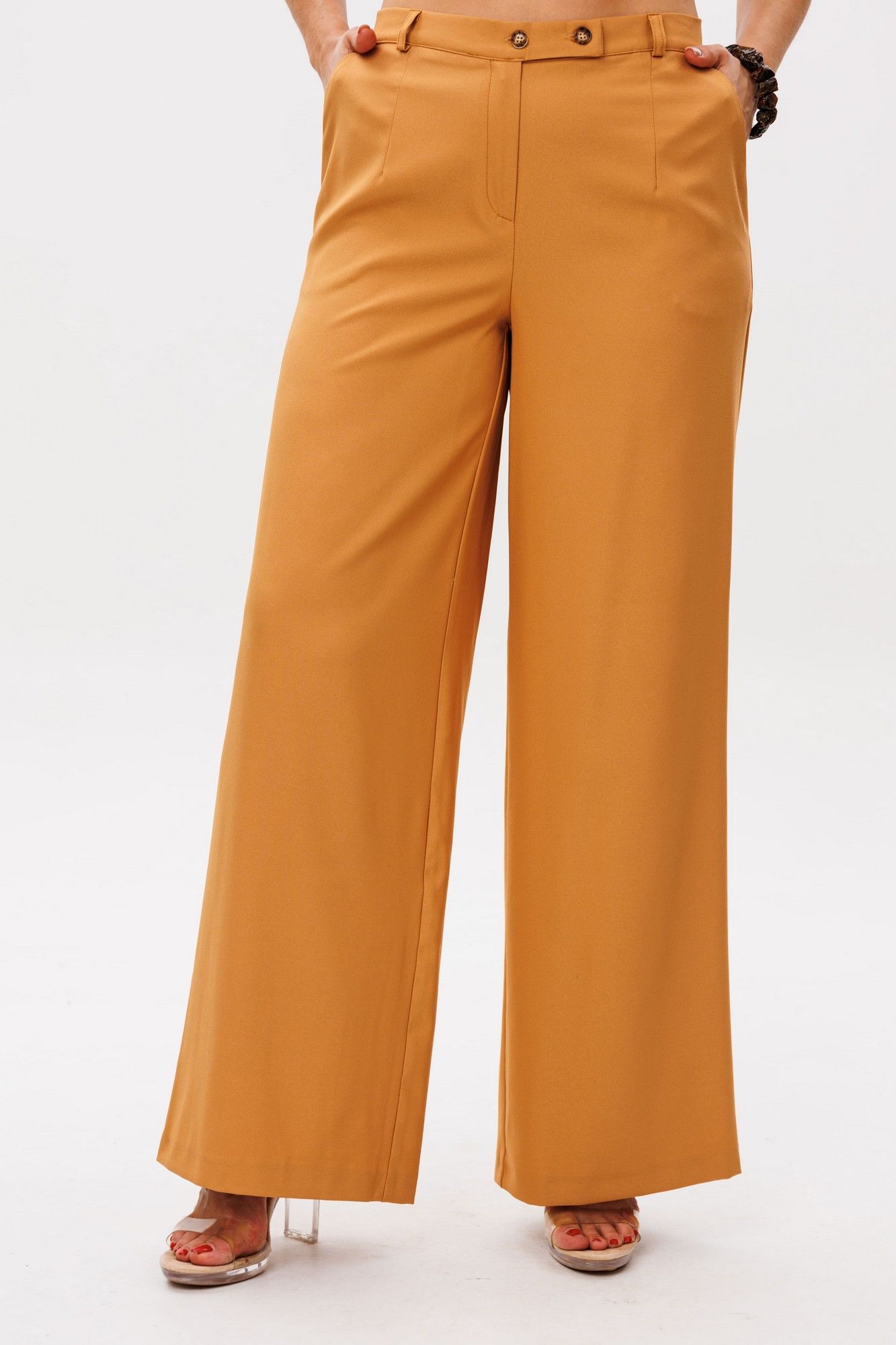 Брюки от Анелли имеют насыщенный «янтарно-жёлтый» оттенок, который наполняет образ теплом и энергией. Благородный цвет, напоминающий спелые мёдные соты, притягивает взгляды, превращая простой силуэт в настоящее стилевое заявление. Высокая посадка мягко подчёркивает талию, создавая женственный силуэт, а идеально прямые удлинённые штанины струятся по ноге, даря фигуре изящество и стройность. Тонкие вытачки по переду и спинке повторяют естественные изгибы тела, подчёркивая безупречность кроя. Невидимая резинка по спинке пояса обеспечивает комфорт, сохраняя при этом элегантность силуэта. Классическая застёжка с пуговицей добавляет ноту строгой эстетики, напоминая о лучших традициях классического кроя. Эти брюки станут драгоценным аккордом в вашем гардеробе – они одинаково прекрасно сочетаются с хрустящей белой рубашкой для офиса 1203, с нежным кремовым свитером для прогулки или с атласным топом для вечернего выхода. Вы ощутите ту особенную уверенность, которую дарит идеально сидящая вещь премиального качества. Это не просто брюки – это воплощение солнечного настроения и безупречного вкуса. Замеры (резинка растянута): Размер 46: ОТ-82; ОБ-98; ДИ-107; ширина по низу - 56; Размер 48: ОТ-86; ОБ-102; ДИ-107; ширина по низу - 58; Размер 50: ОТ-90; ОБ-106; ДИ-108; ширина по низу - 60; Размер 52: ОТ-94; ОБ-110; ДИ-108; ширина по низу - 62; Размер 54: ОТ-98; ОБ-114; ДИ-108; ширина по низу - 64; Размер 56: ОТ-102; ОБ-118; ДИ-108; ширина по низу - 66; Размер 58: ОТ-104; ОБ-122; ДИ-108; ширина по низу - 66;