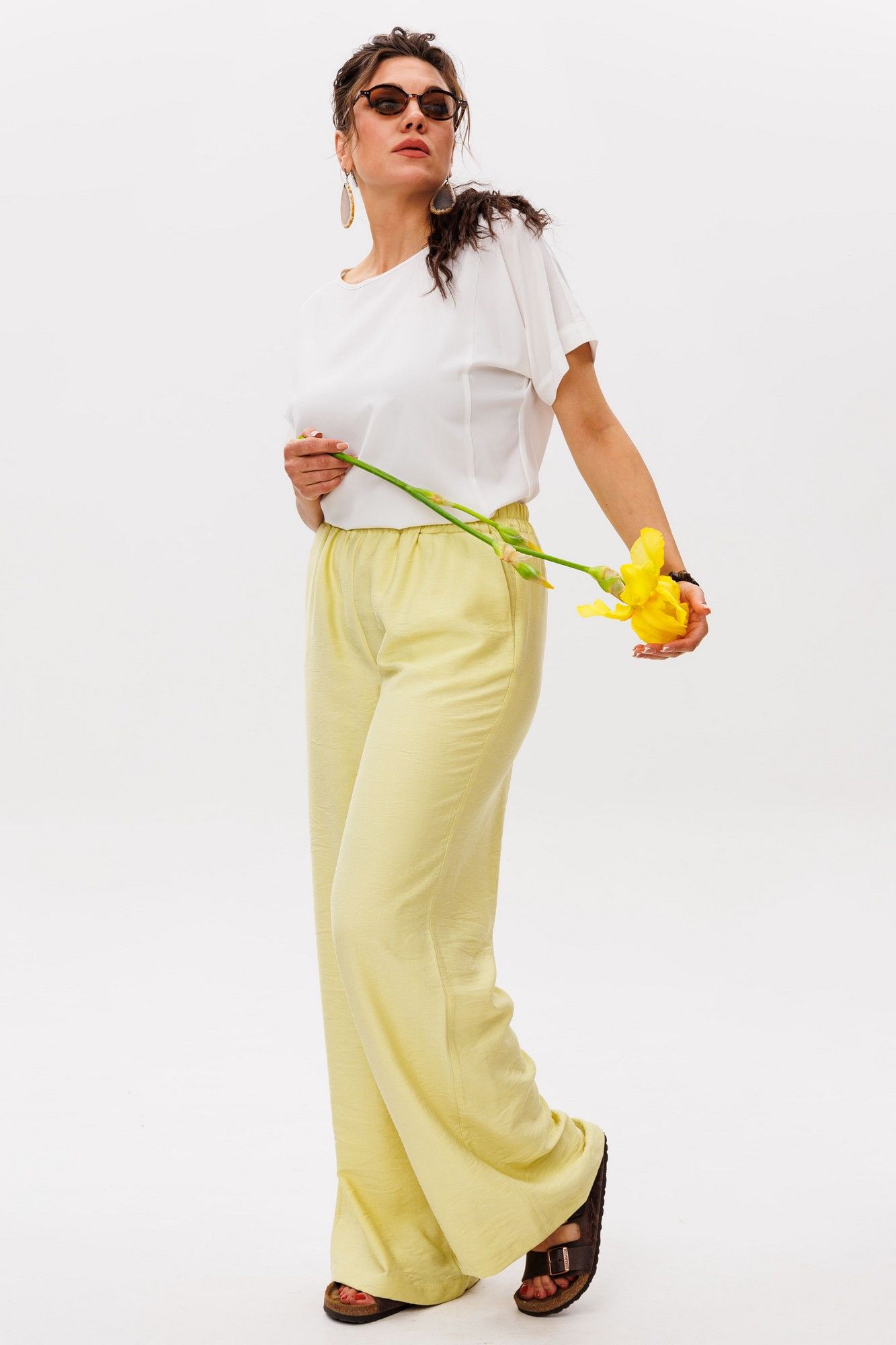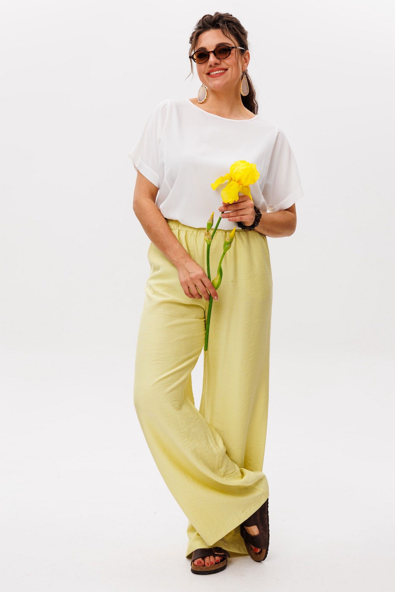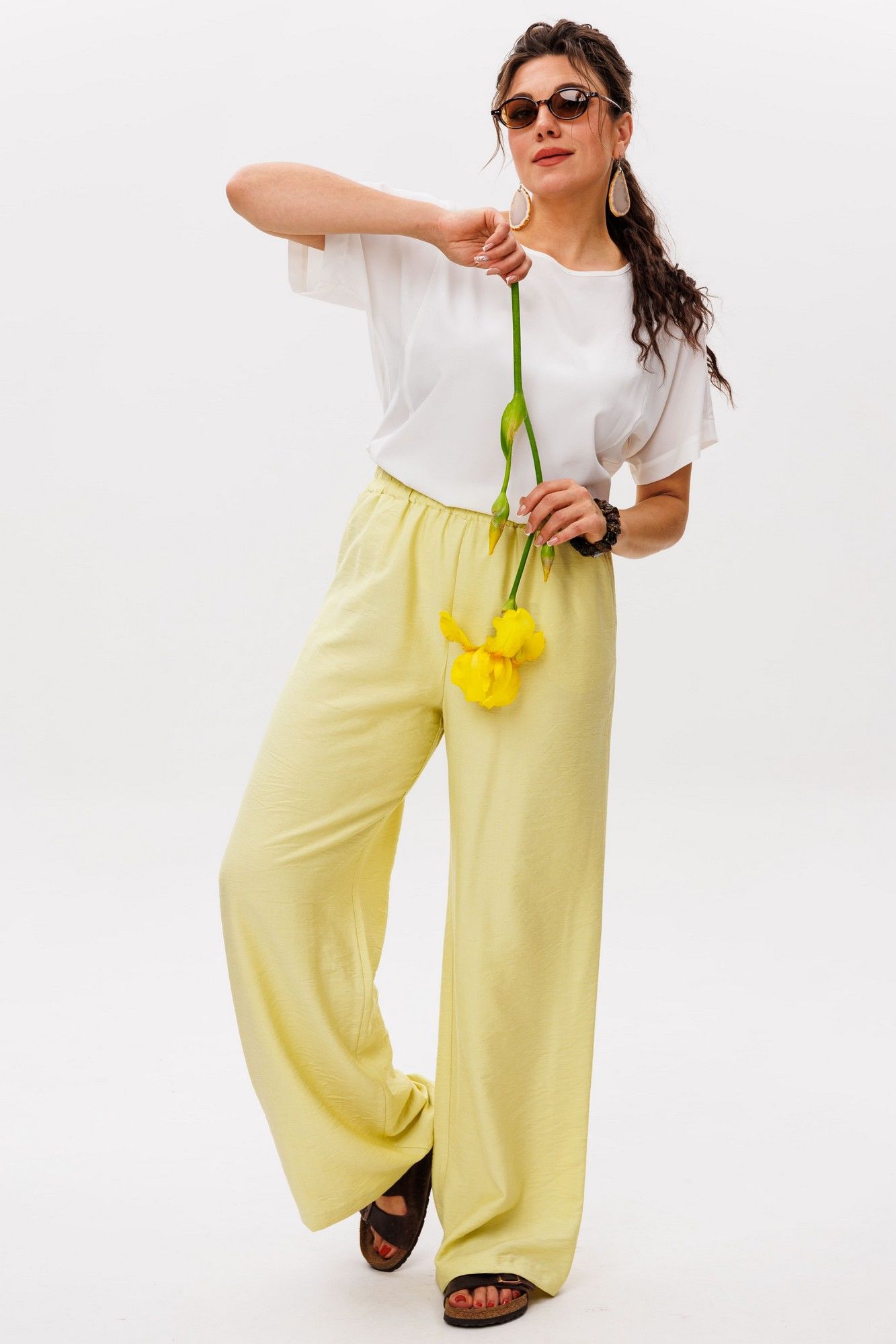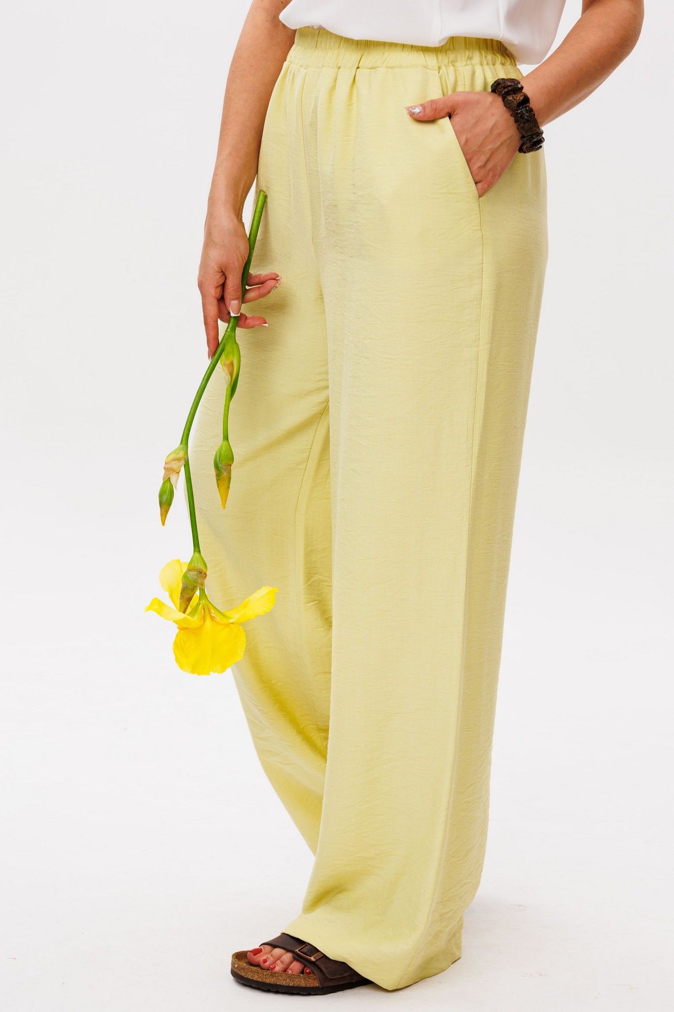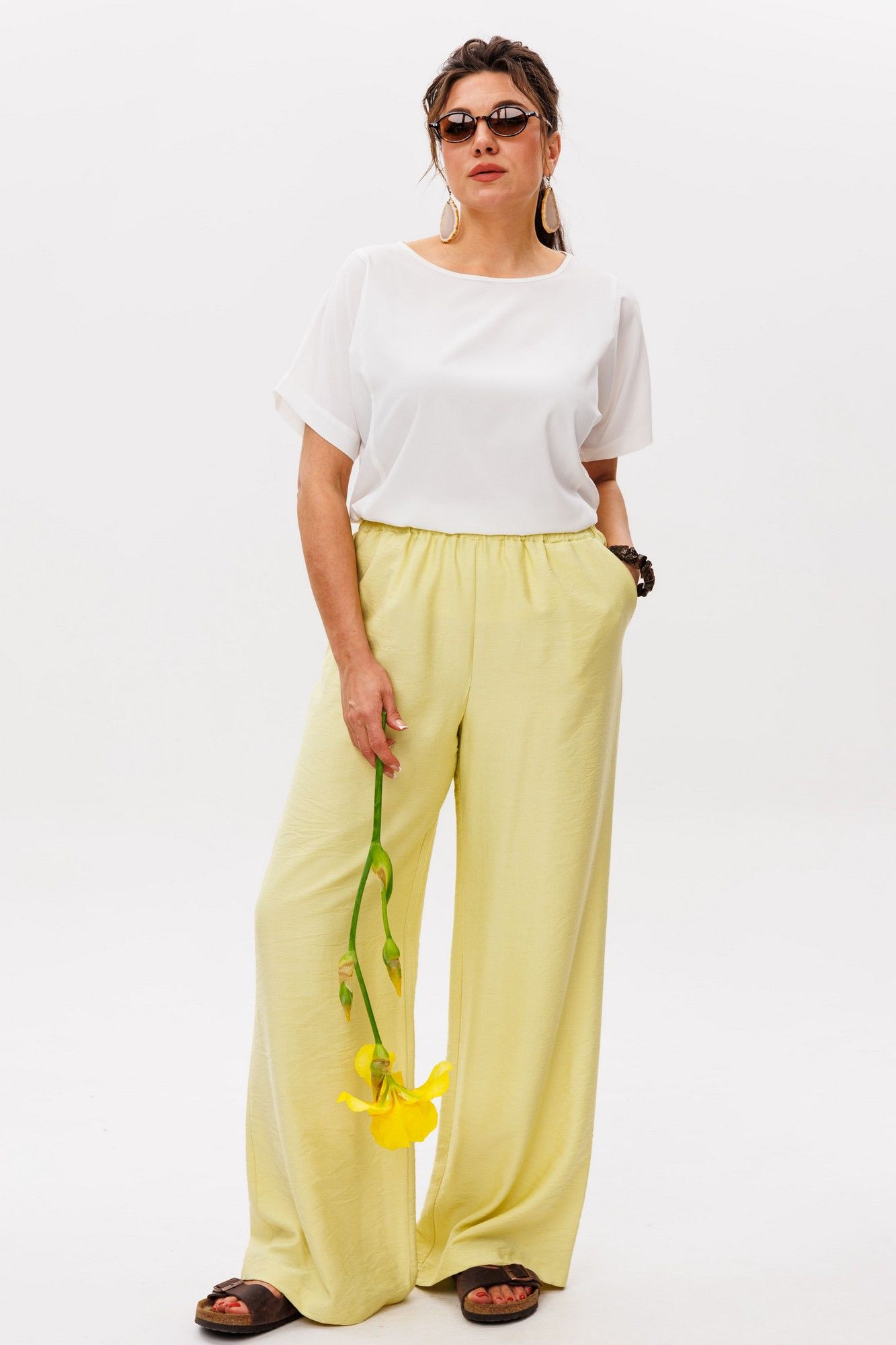 Брюки цвета «сицилийского лимона» — это воплощение летней легкости и утонченной простоты. Нежный, солнечно-желтый оттенок напоминает о спелых цитрусах, warmed by mediterranean sun, привнося в образ свежесть и жизнерадостность. Мягкая, струящаяся ткань обволакивает кожу, даря ощущение комфорта даже в самый жаркий день. Эластичная резинка на поясе обеспечивает идеальную посадку, подстраиваясь под изгибы тела без стеснения движений. Удобные карманы, delicately встроенные в силуэт, добавляют практичности, сохраняя чистоту линий. Эти брюки от Анелли словно сотканы из самого света — они воздушные, почти невесомые, но при этом сохраняют форму, создавая элегантный непринужденный силуэт. Они прекрасно сочетаются с босоножками на плоской подошве и льняными блузами, завершая образ в стиле effortless chic. Идеальны для прогулок по набережной, утреннего кофе в уютной кафешке или путешествий — там, где ценится свобода и легкость. В них каждая деталь продумана: от деликатного кроя до тактильных ощущений, превращая простую вещь в маленькое произведение fashion-искусства. Рост модели 173 см, размер 52. Для того чтобы подобрать для себя идеальный размер, обязательно сверяйтесь с замерами в описании, мы их делаем индивидуально к каждому изделию. А если будут вопросы задавайте их менеджерам или пишите в отдел заботы. Замеры: Размер 52: ОТ-85; ОБ-116; ДИ-109; ширина внизу - 65; Размер 54: ОТ-89; ОБ-120; ДИ-109; ширина внизу - 66; Размер 56: ОТ-93; ОБ-124; ДИ-109; ширина внизу - 67; Размер 58: ОТ-98; ОБ-128; ДИ-109; ширина внизу - 68; Размер 60: ОТ-102; ОБ-132; ДИ-110; ширина внизу - 68; Размер 62: ОТ-106; ОБ-136; ДИ-111; ширина внизу - 69;