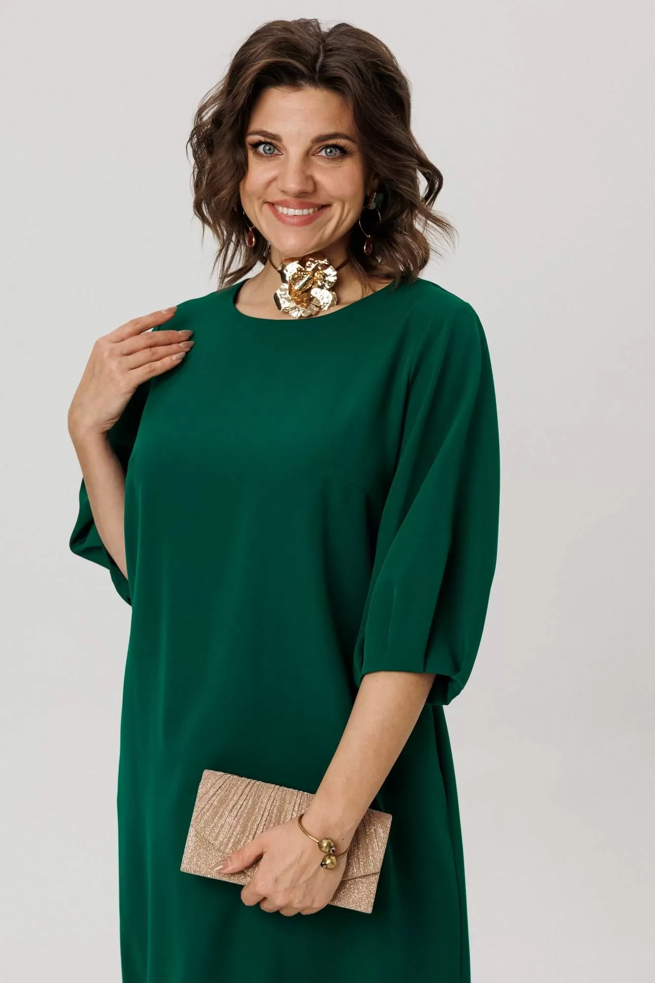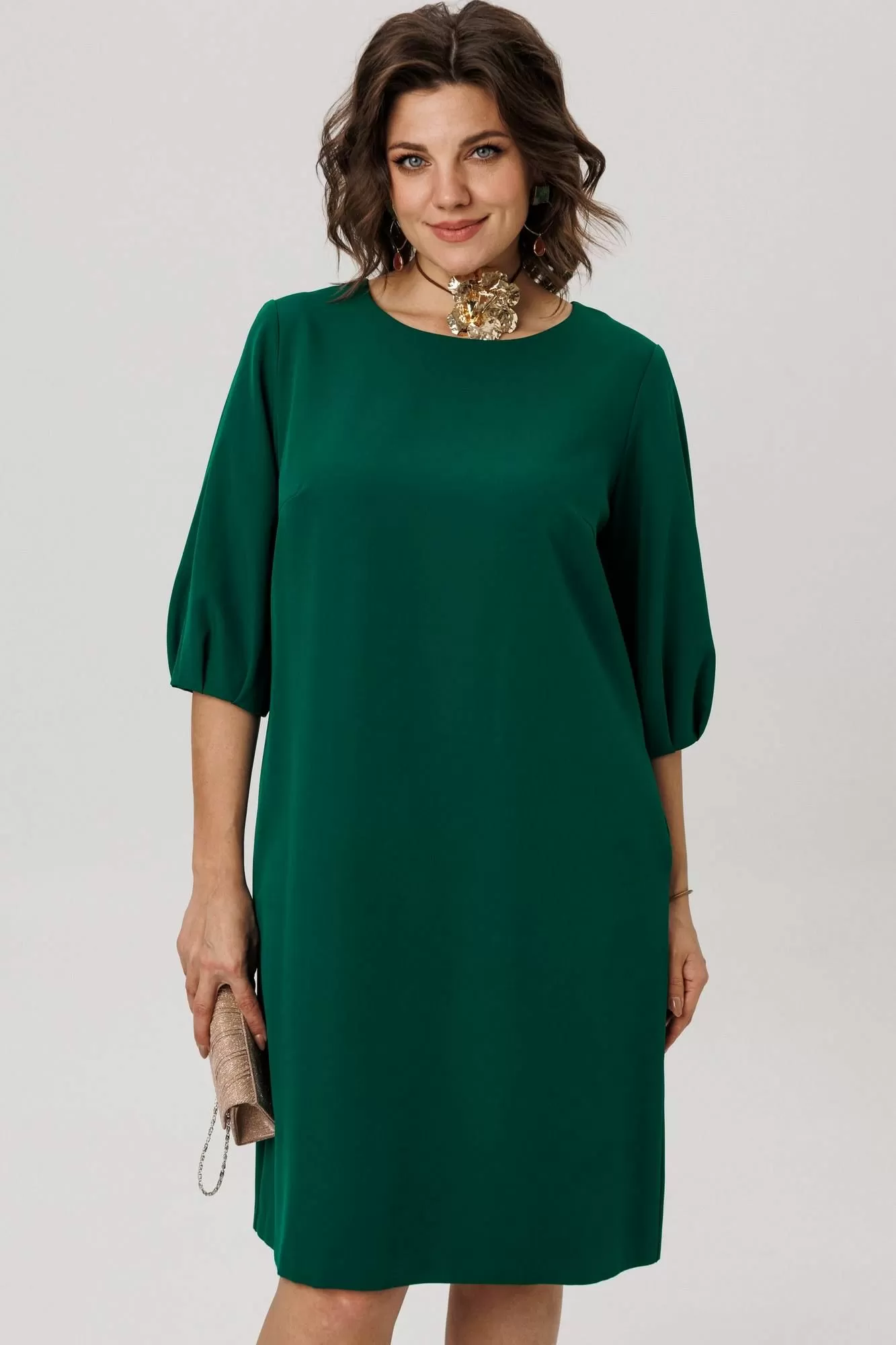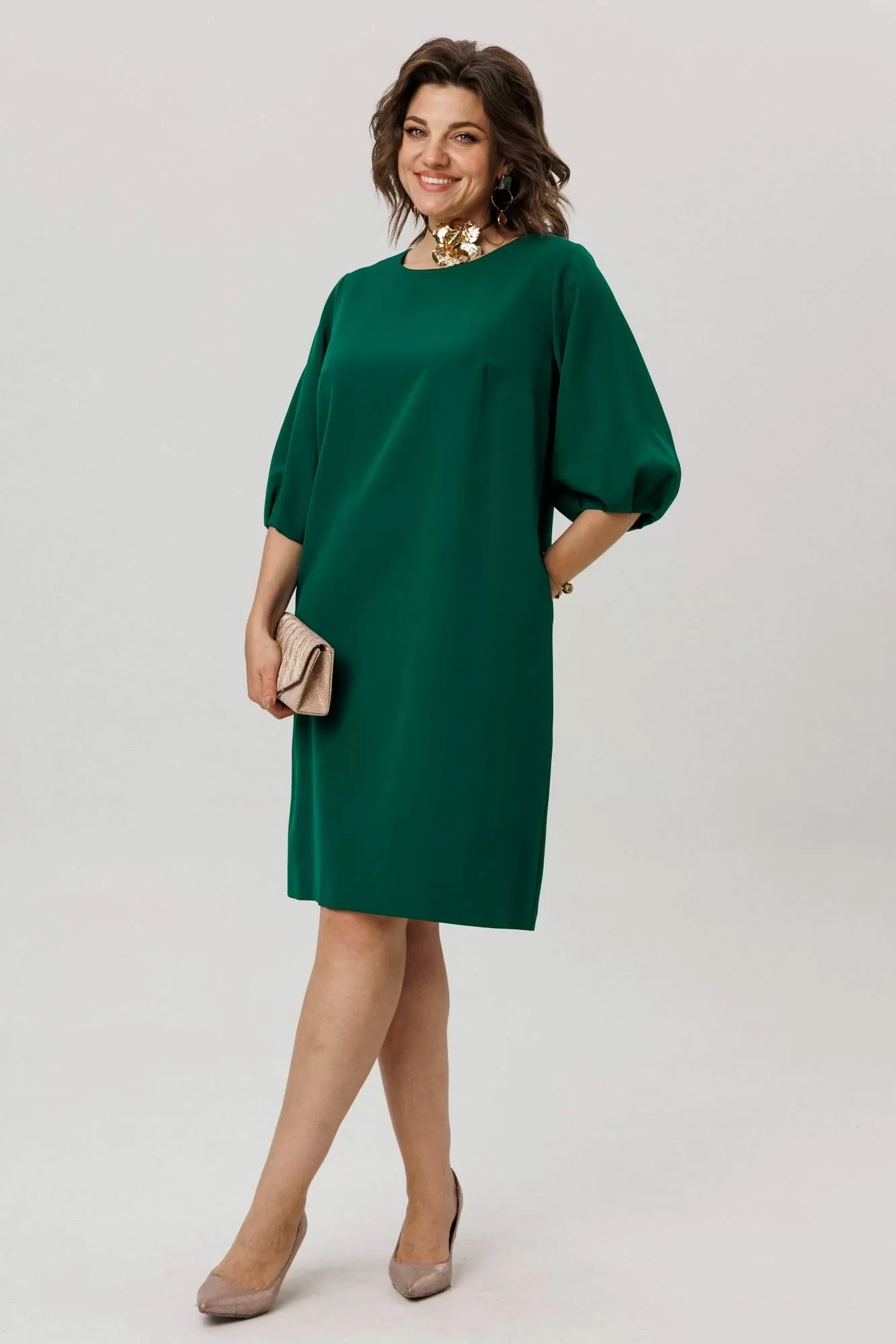 Мягкий рукав платья украшен у запястья изящной сборкой, придающей образу лёгкость и утончённость. Идеальная длина, прикрывающая колени, создана для повседневного комфорта, сохраняя при этом элегантность силуэта.