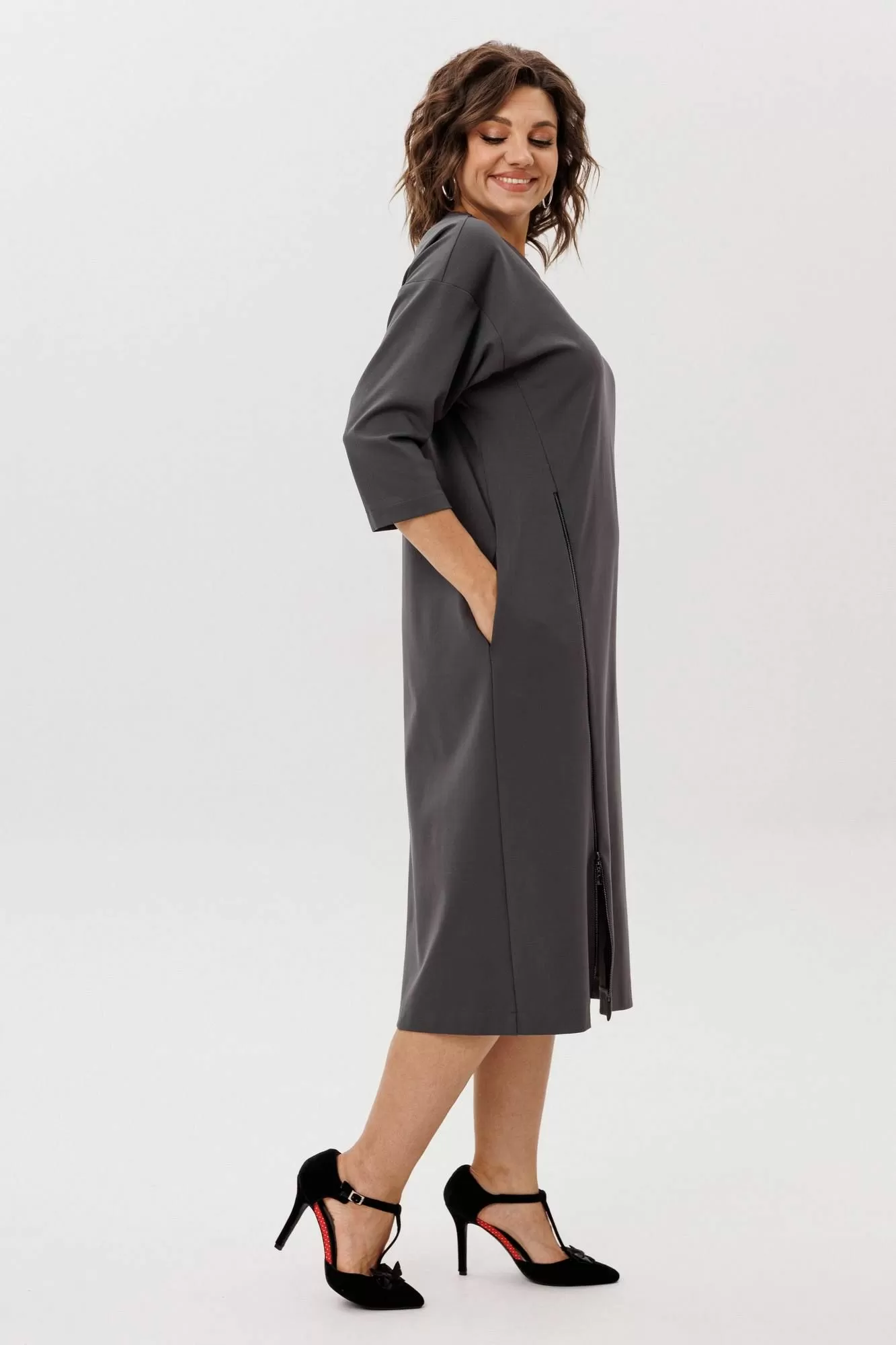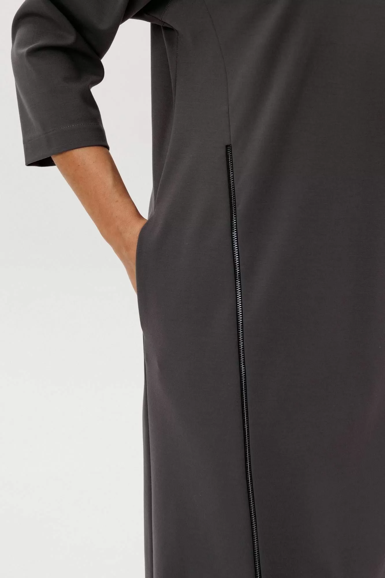Модель декорирована двумя металлическими молниями: одна служит застежкой на горловине, а вторая формирует стильный разрез на ноге, который можно регулировать по вашему желанию.