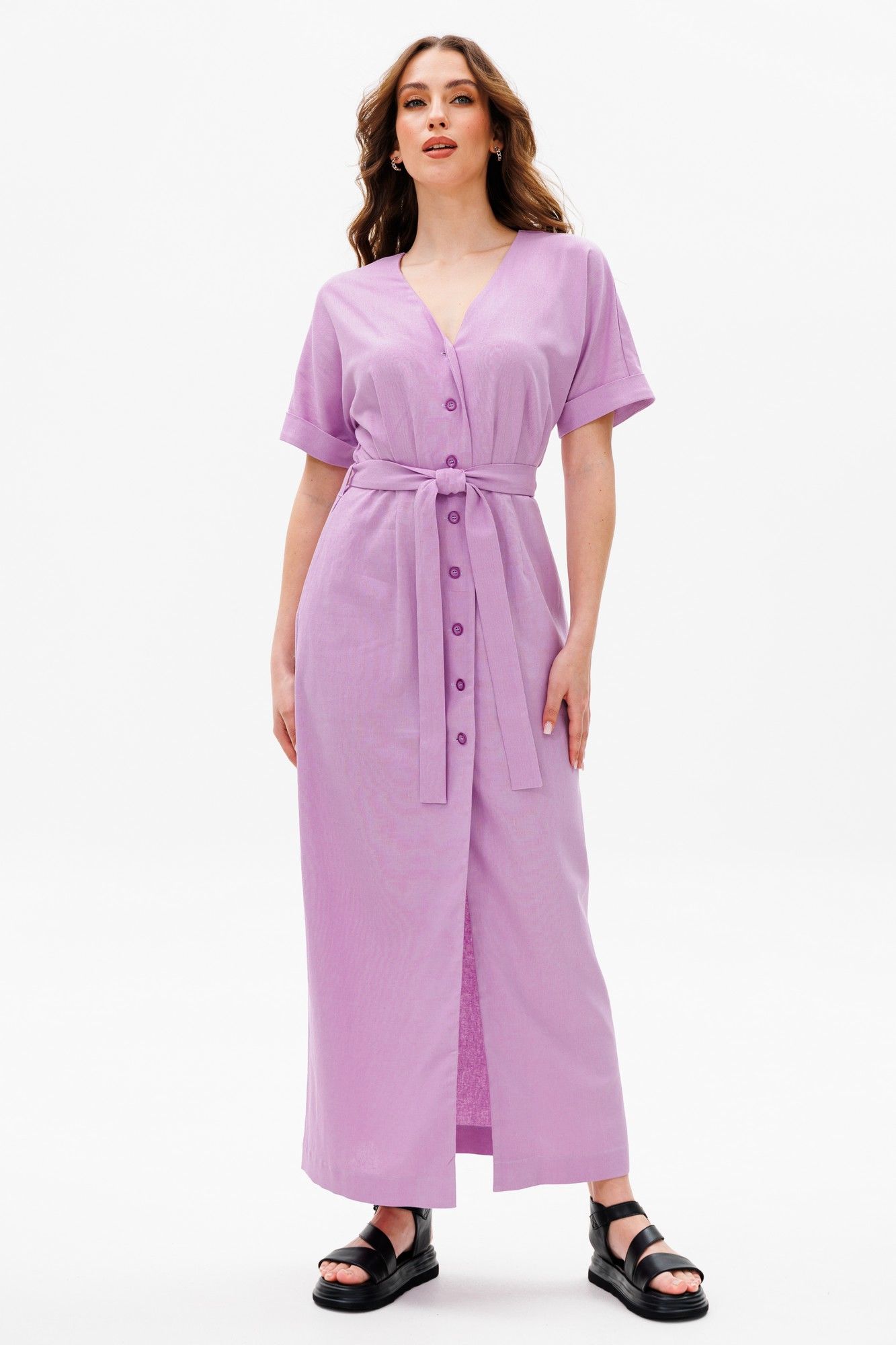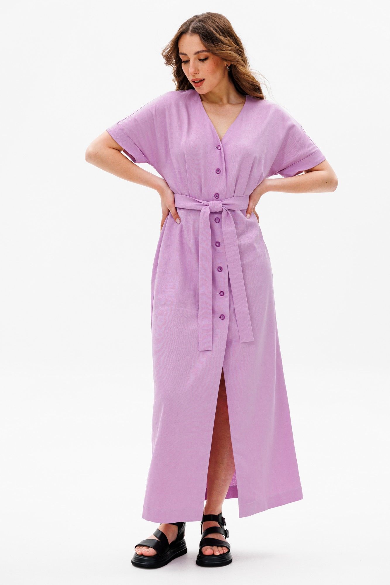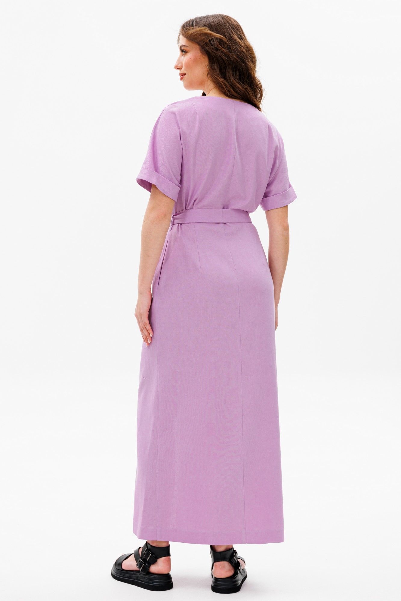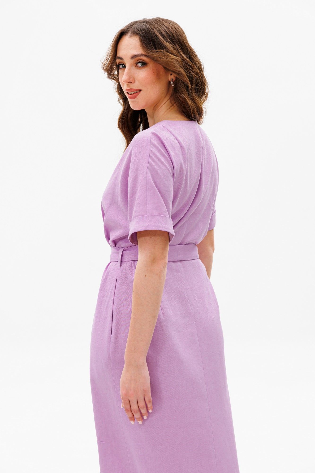 Платье умеренного объема, прилегающего силуэта, отрезное по линии талии, со съемным поясом.У платья V-образный вырез горловины. Универсальная модель, подойдет на разные случаи жизни. Ткань с натуральным составом, за которой легко ухаживать. Длина миди по спинке в росте 170 - 135 см, цельнокроеный рукав длиной выше локтя в росте 170 - 32 см.
