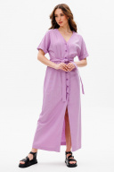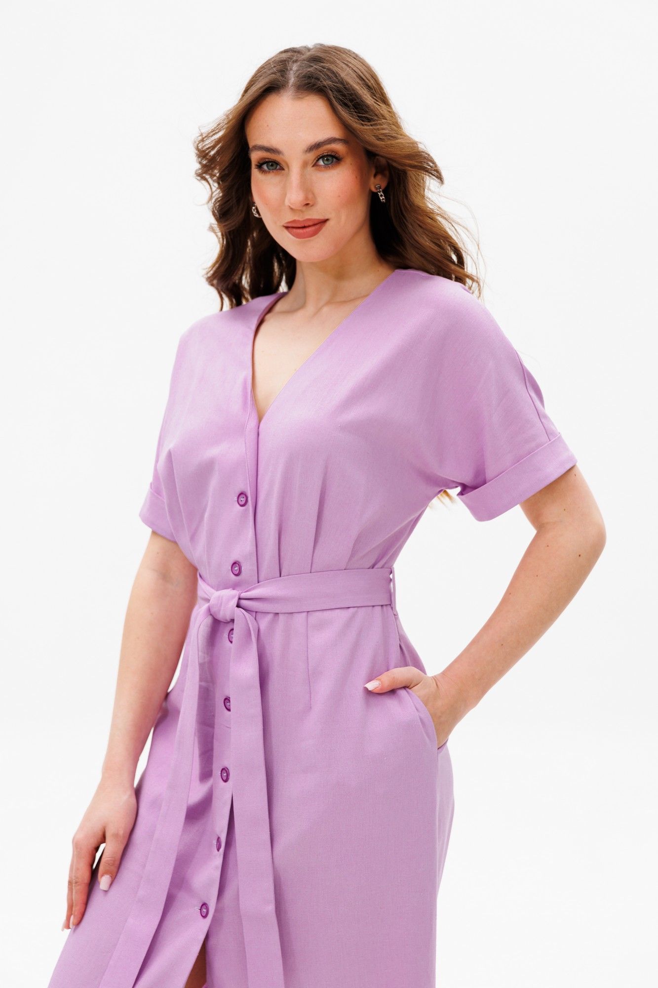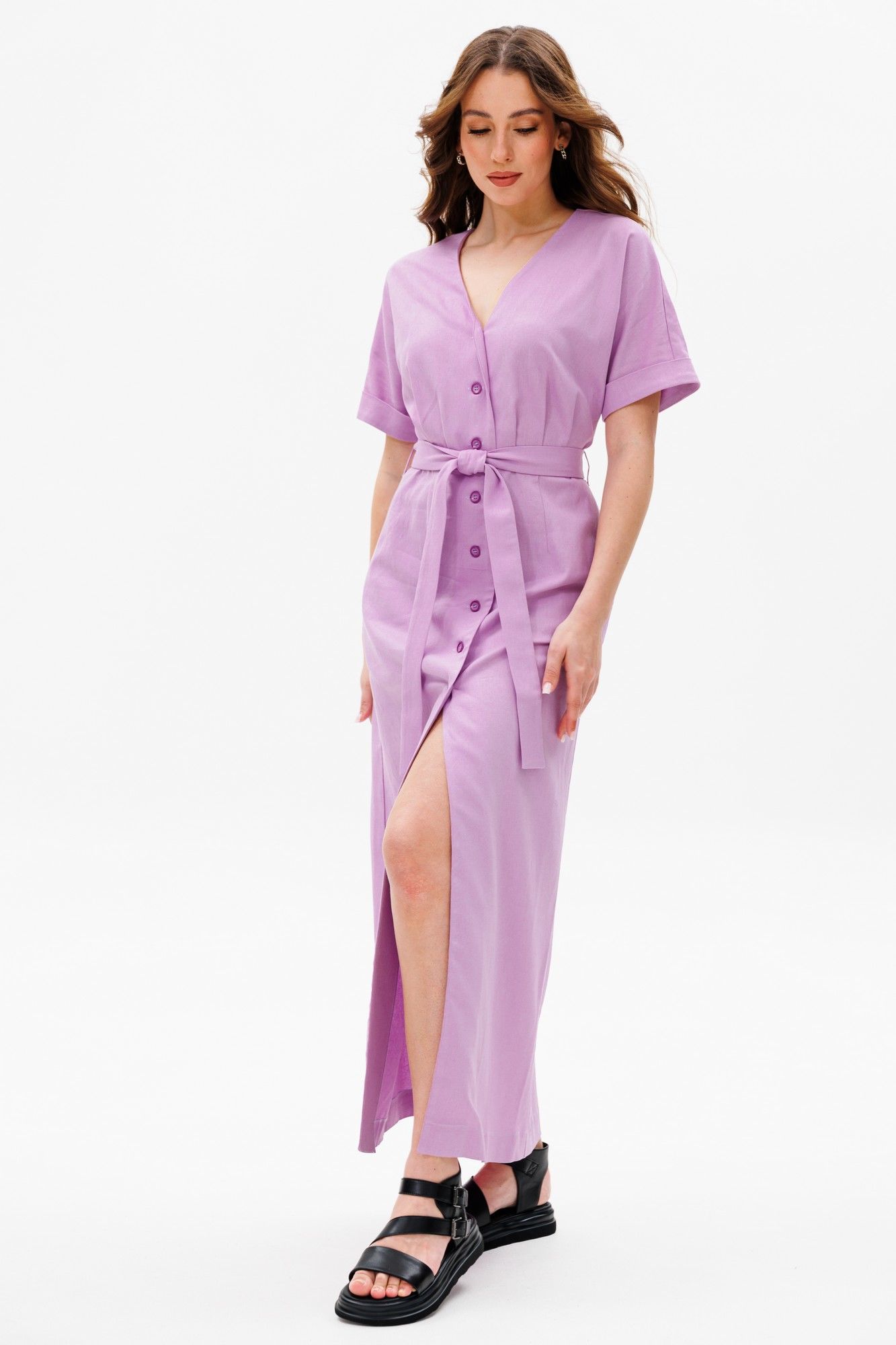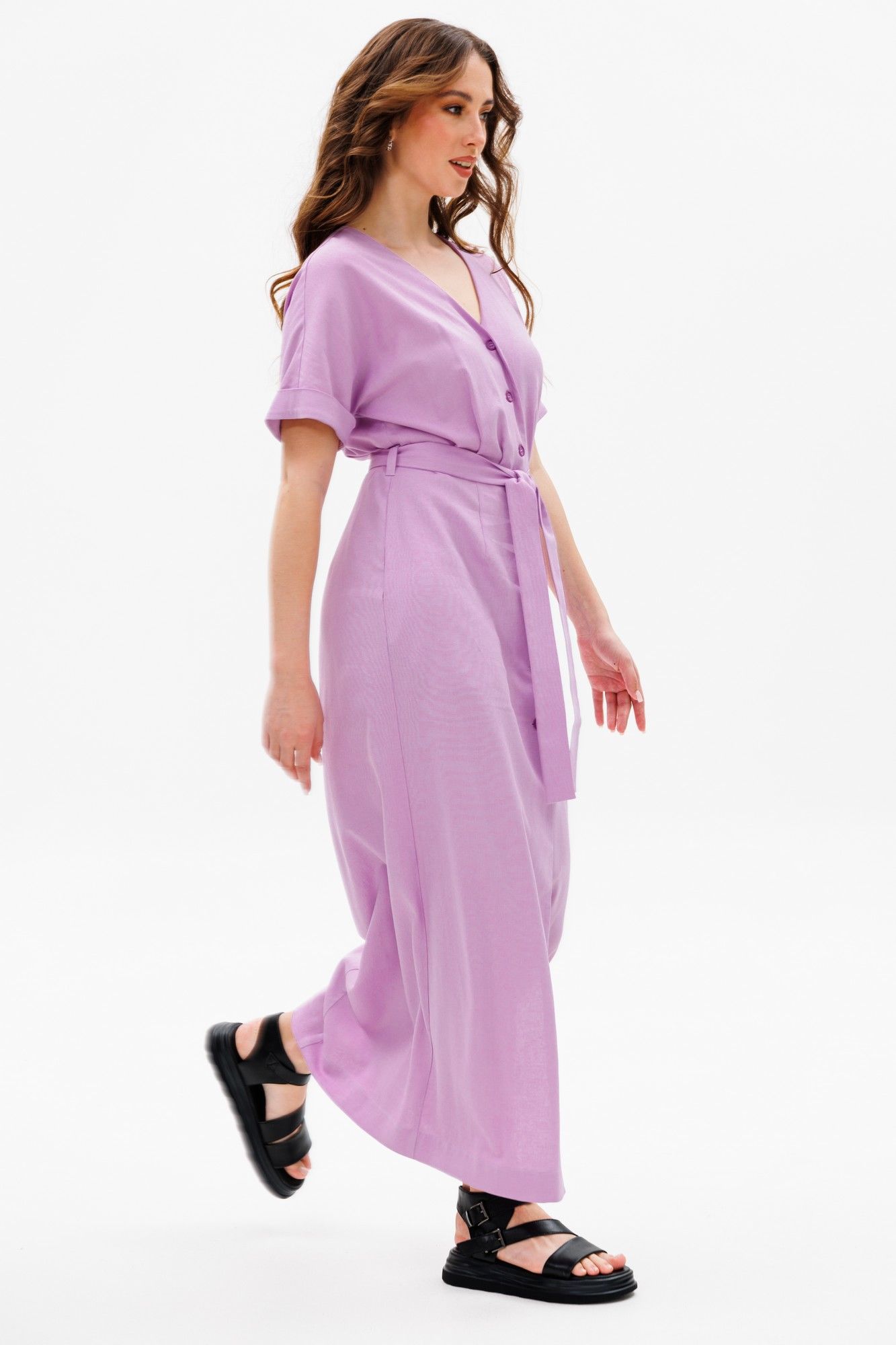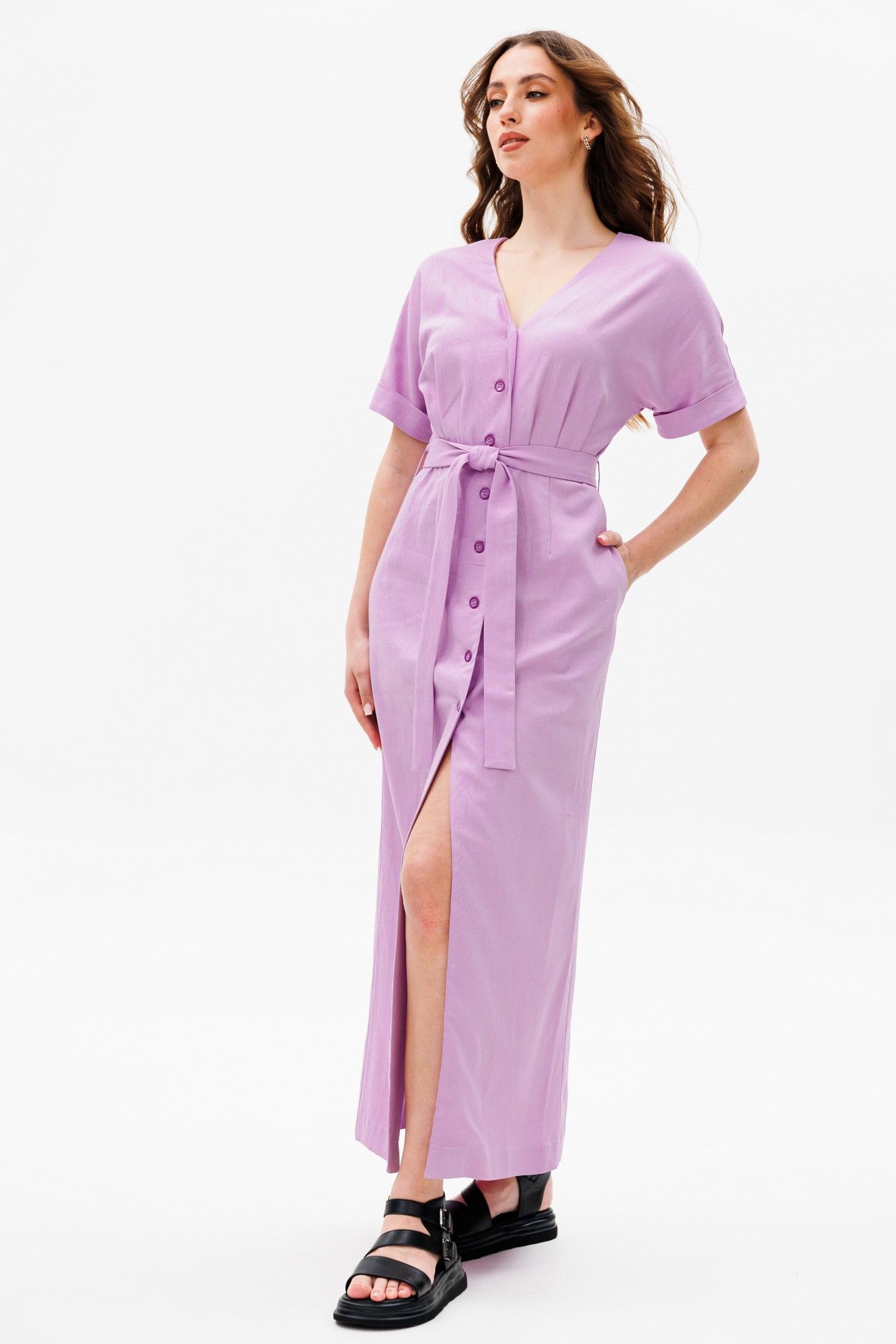 Платье умеренного объема, прилегающего силуэта, отрезное по линии талии, со съемным поясом.У платья V-образный вырез горловины. Универсальная модель, подойдет на разные случаи жизни. Ткань с натуральным составом, за которой легко ухаживать. Длина миди по спинке в росте 170 - 135 см, цельнокроеный рукав длиной выше локтя в росте 170 - 32 см.