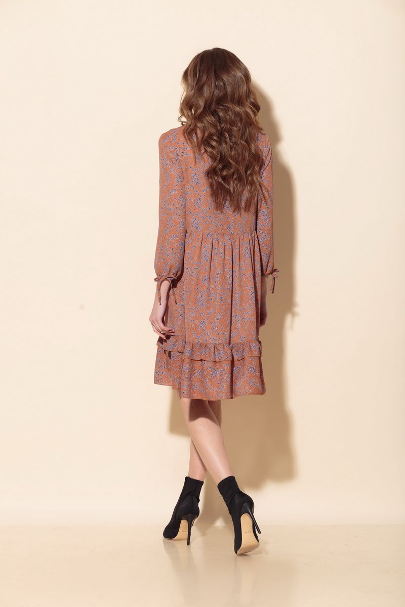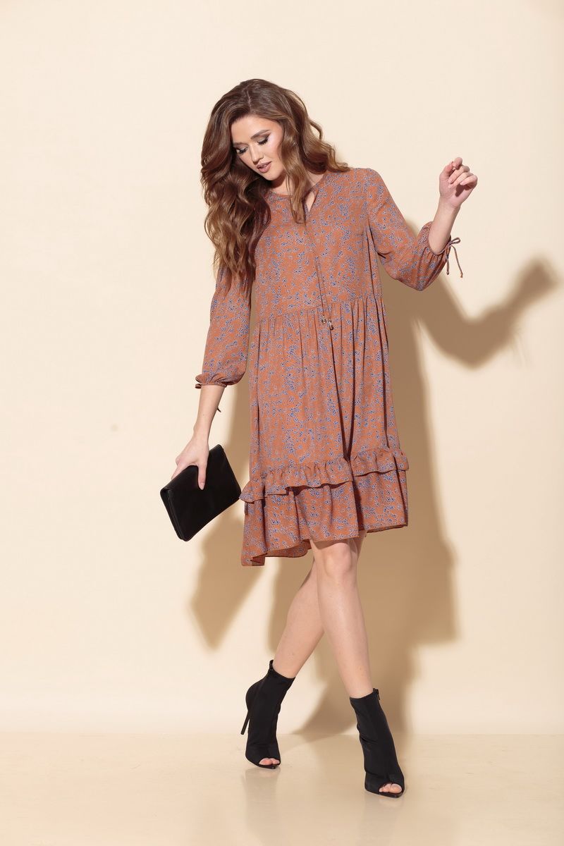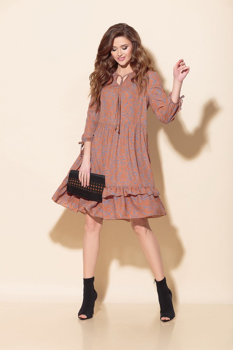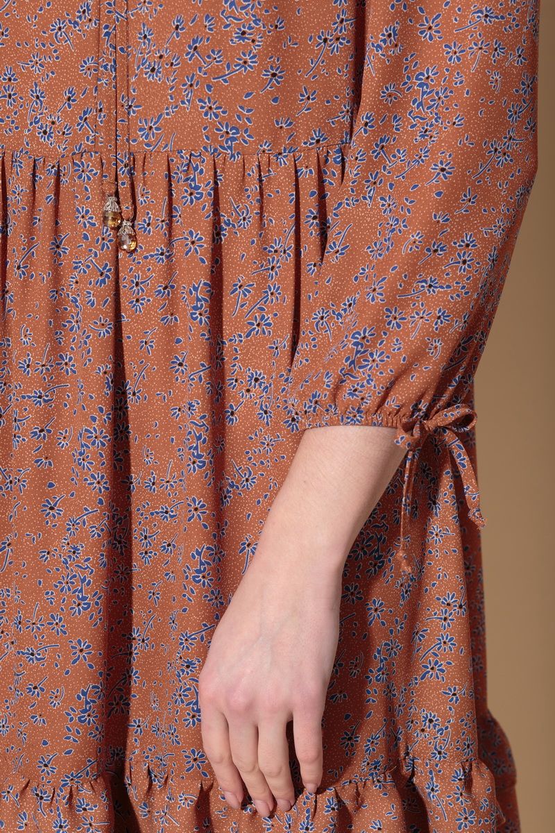Платье свободного силуэта из шифоновой ткани с принтом, подрезом в области линии талии со сборкой и воланом по низу. Перед с V-образным вырезом и завязками с наконечником. Рукав втачной, длина - 3/4, низ на резинке. Длина платья в 44р. - 99 см., длина рукава в 44р. - 52,5 см. Длина платья в 50р. - 102см., длина рукава в 50р. - 52,5 см.