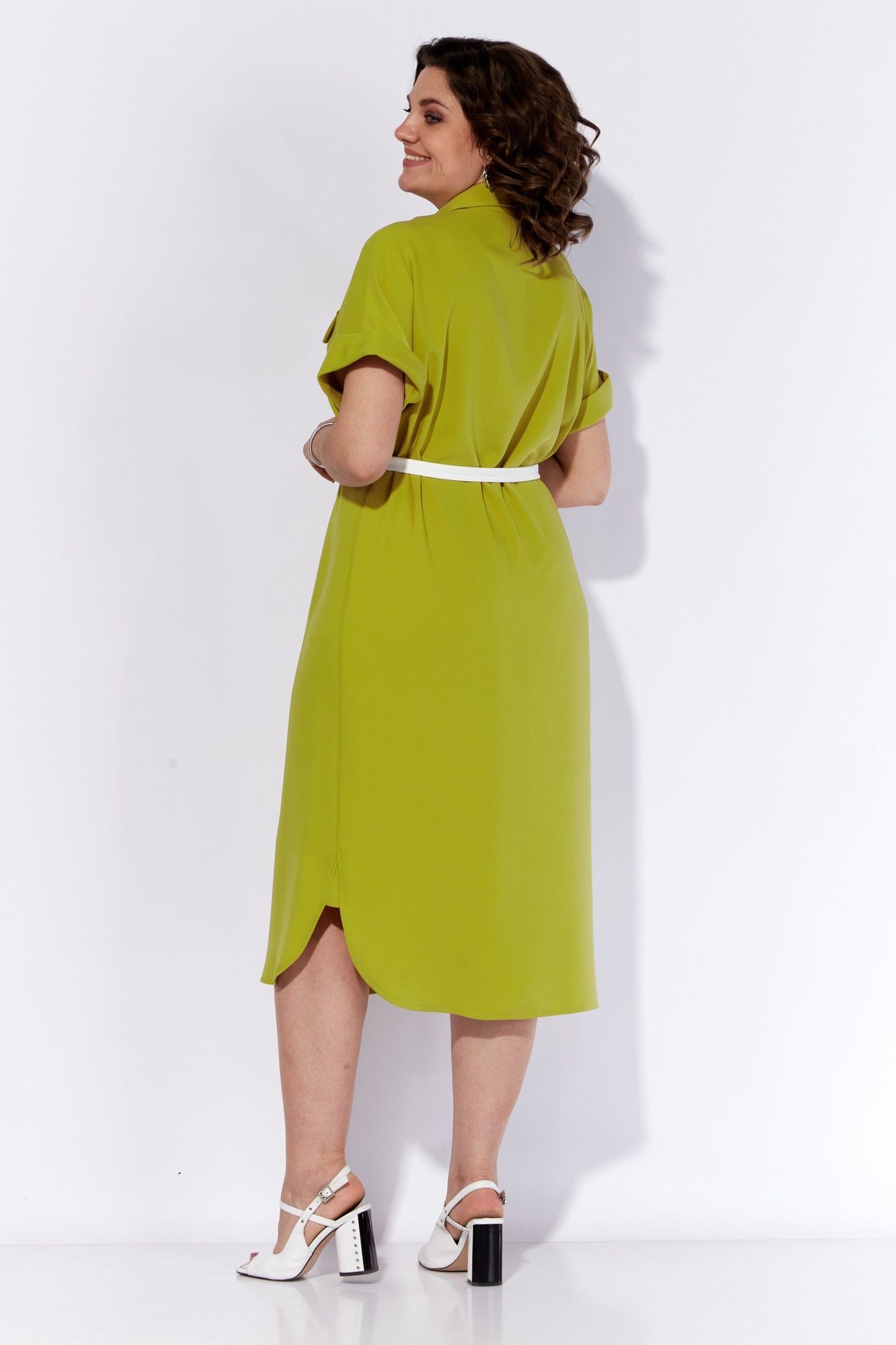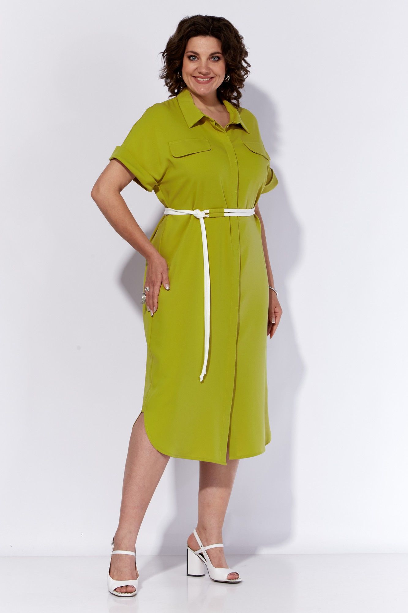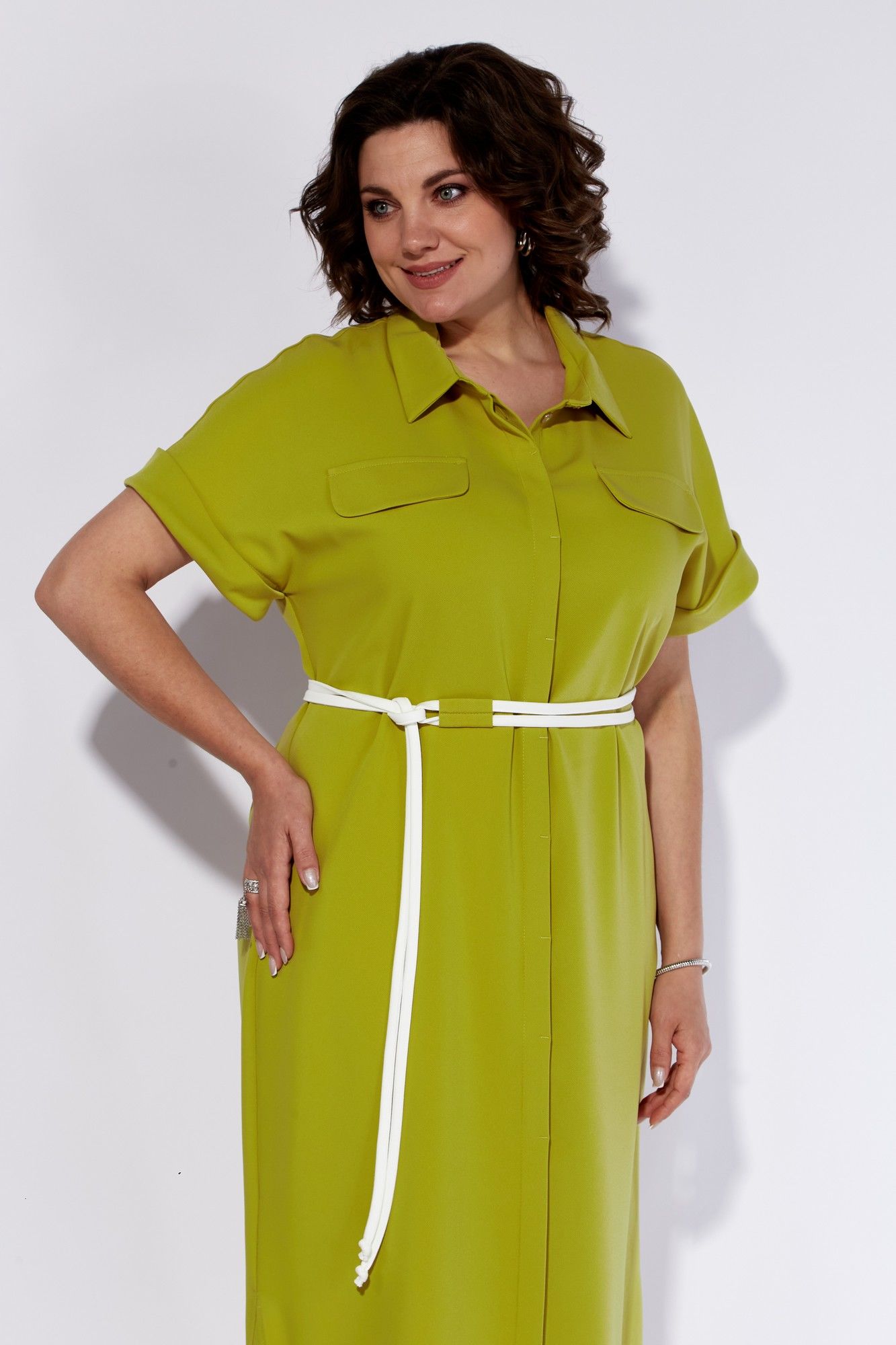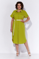 Стильное платье-рубашка из текстильного полотна. Платье с центральной потайной застежкой на планку с пуговицами, рубашечным воротником на стойке и с клапанами на переде. Рукава цельнокроеные, короткие, с притачными манжетами В комплекте прилагается съемный пояс из текстиля. Длина изделия 116 см.