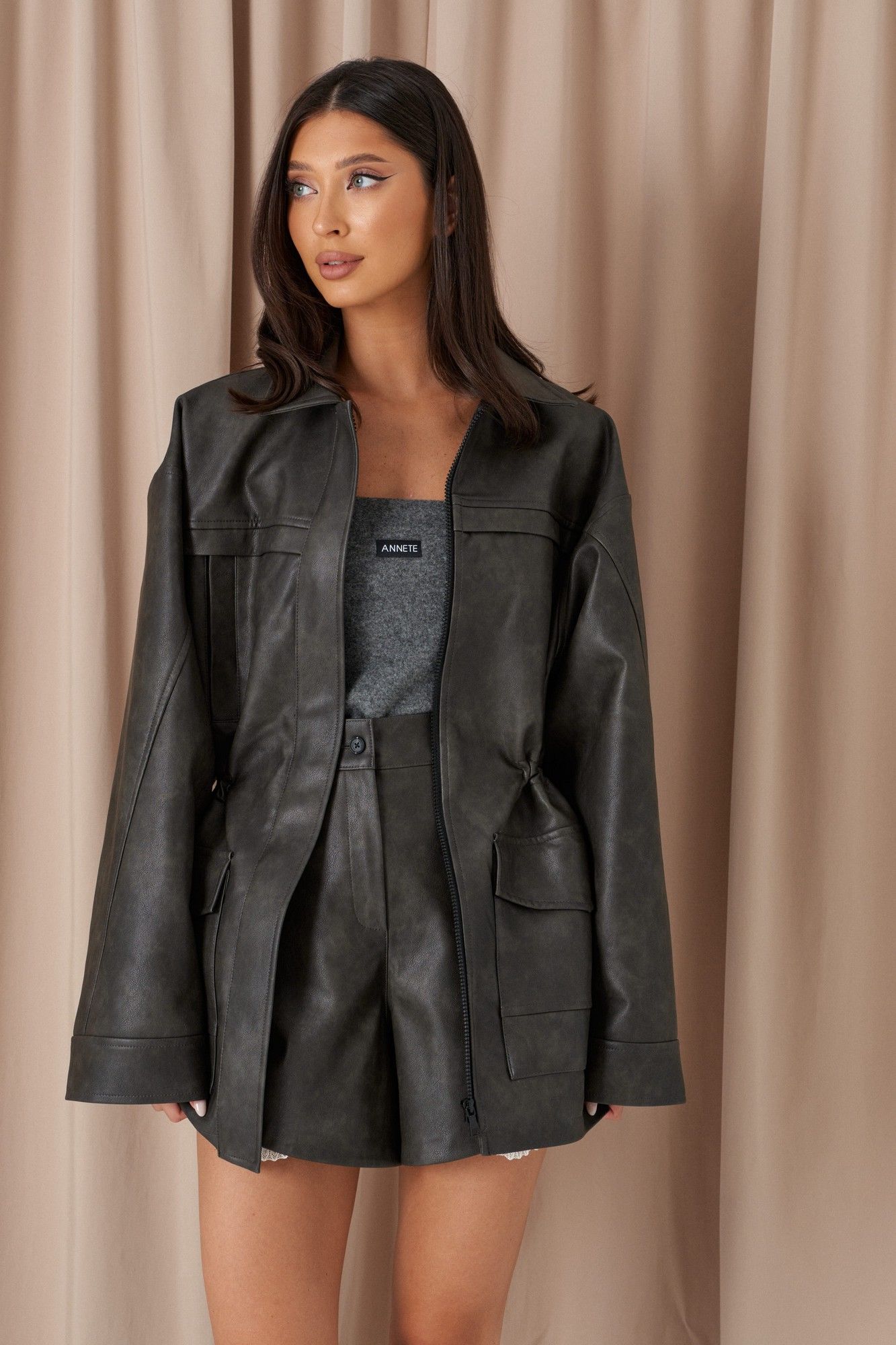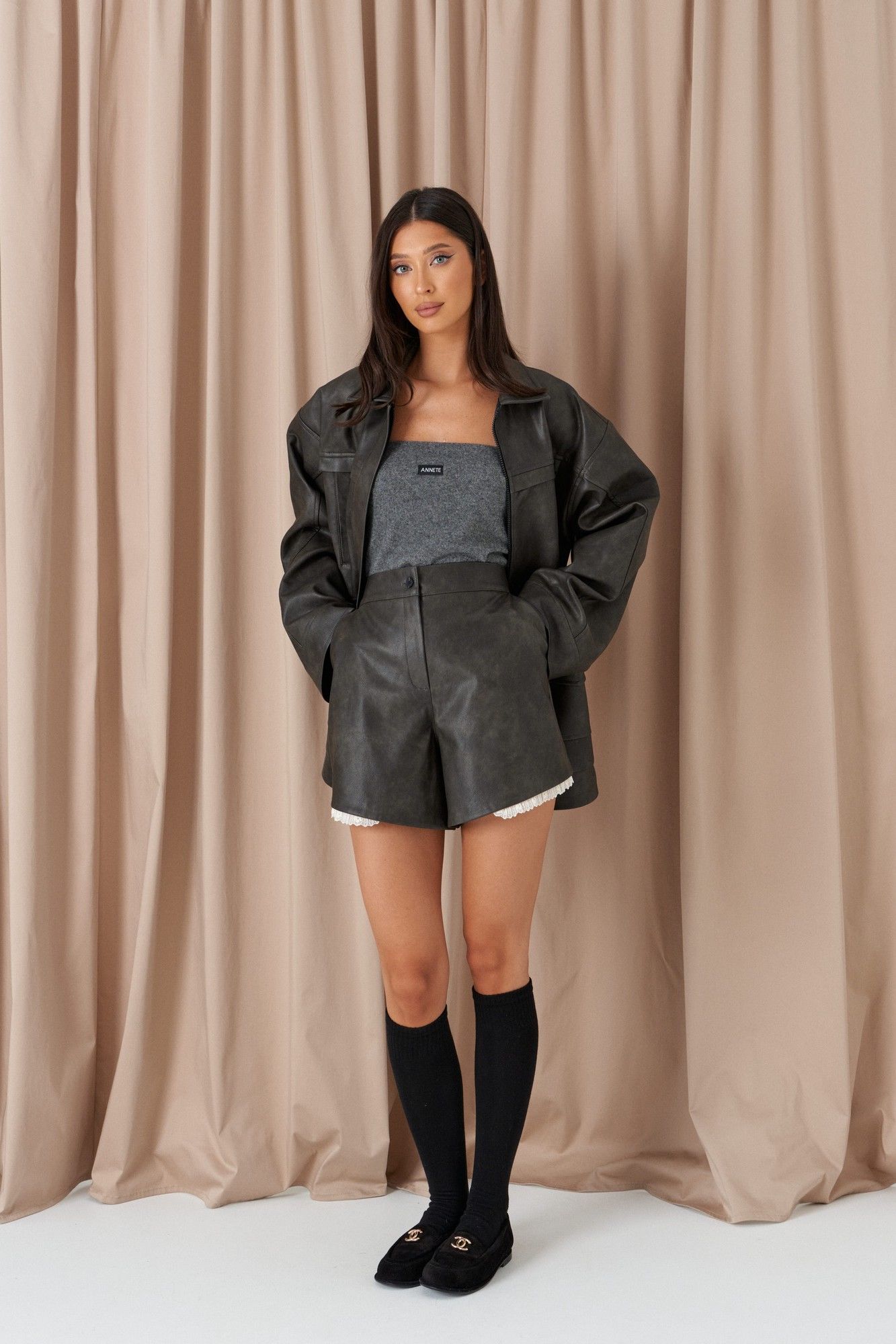 Шорты свободного кроя выполнены из эко-кожи. Характеристика: стабильный пояс, засежка молния и петля-пуговица, по низу изделия нашито декоративное кружево, брендированная подкладка. Длина по боковому шву 39 см.
