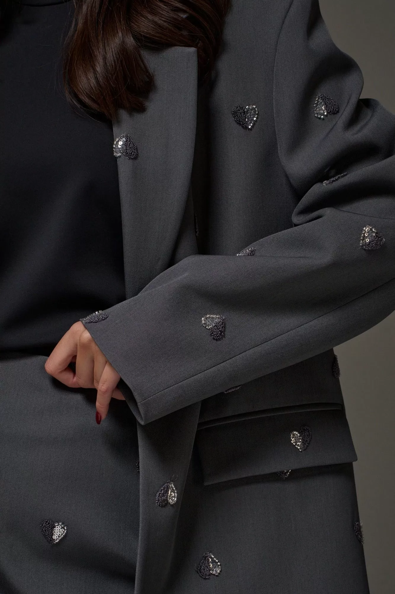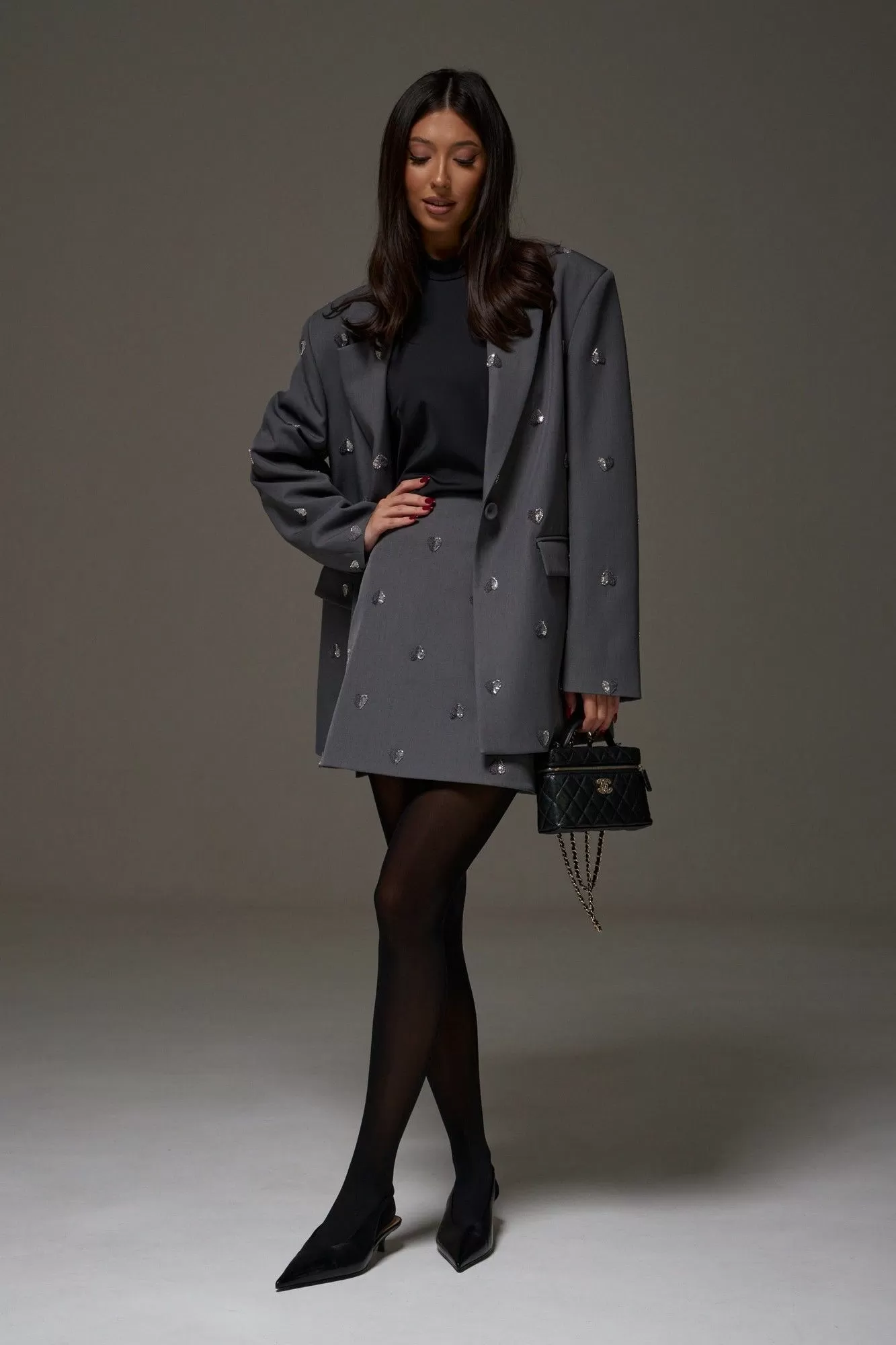 Юбка-мини прямого кроя. Выполнена из костюмной ткани серого цвета, декорированной сердечками. Силуэт - трапеция, брендированная подкладка. Застежка - потайная молния в шве заднего полотна изделия. Длина 42см.