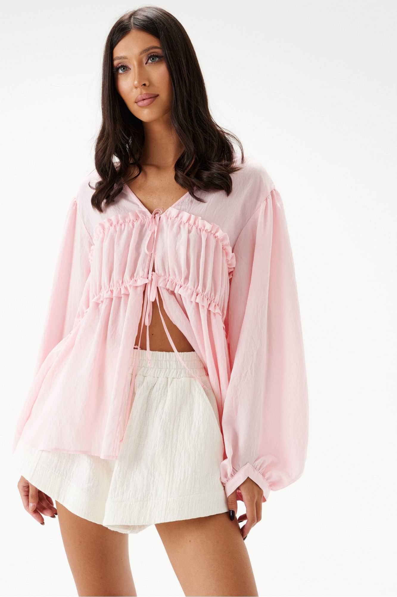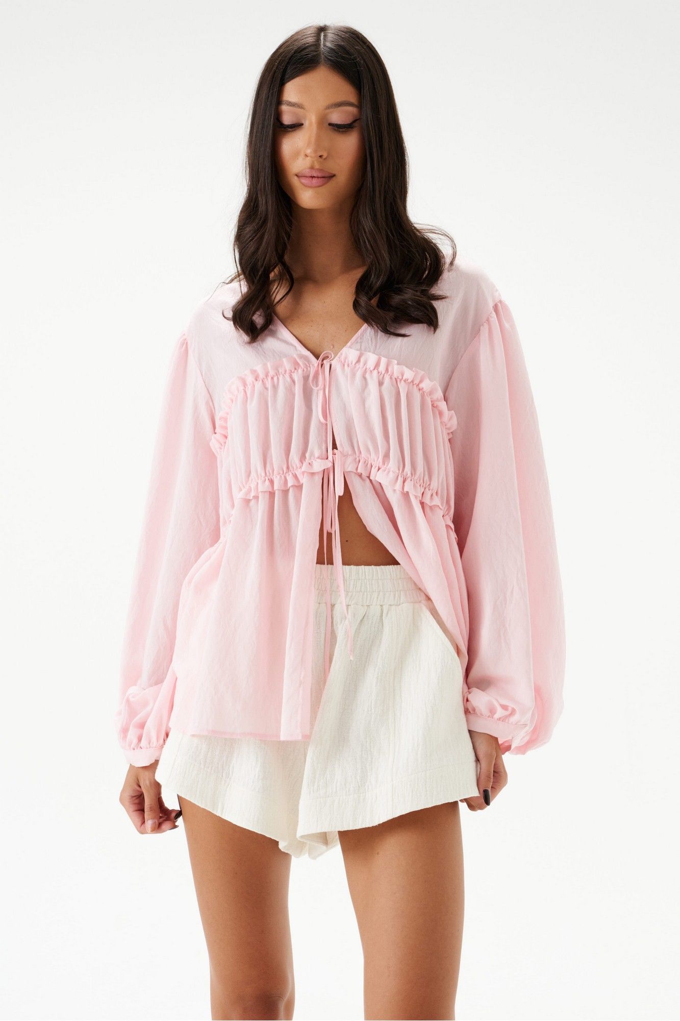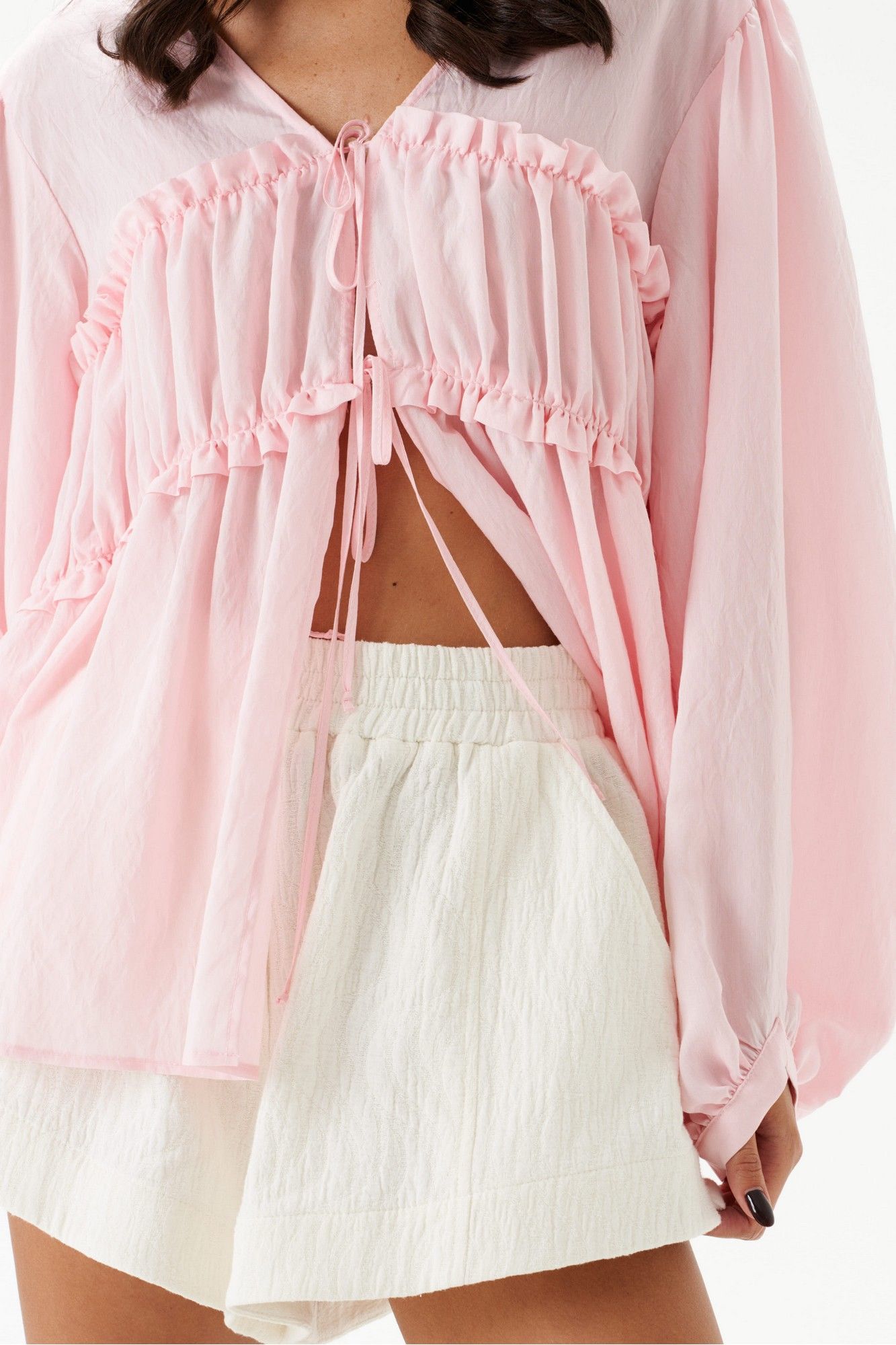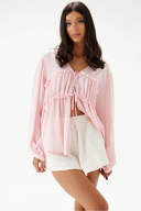 Блузка свободного кроя, выполнена из полупрозрачного натурального полотна RAMI. Прямой свободный крой, рукав широкий вточной, низ присборен на фигурную узкую манжету, V-образный вырез, лиф отрезной по линии талии, застежка центральная на шнурки-завязки. Длина по спинке 64 см, длина рукава от края горловины 68 см.