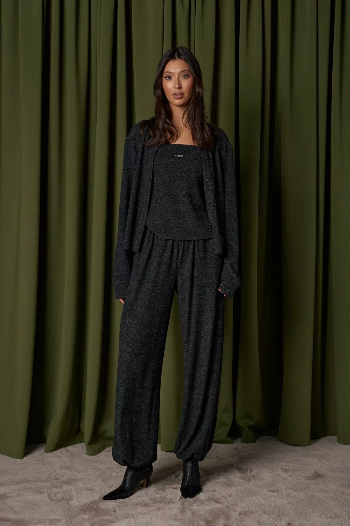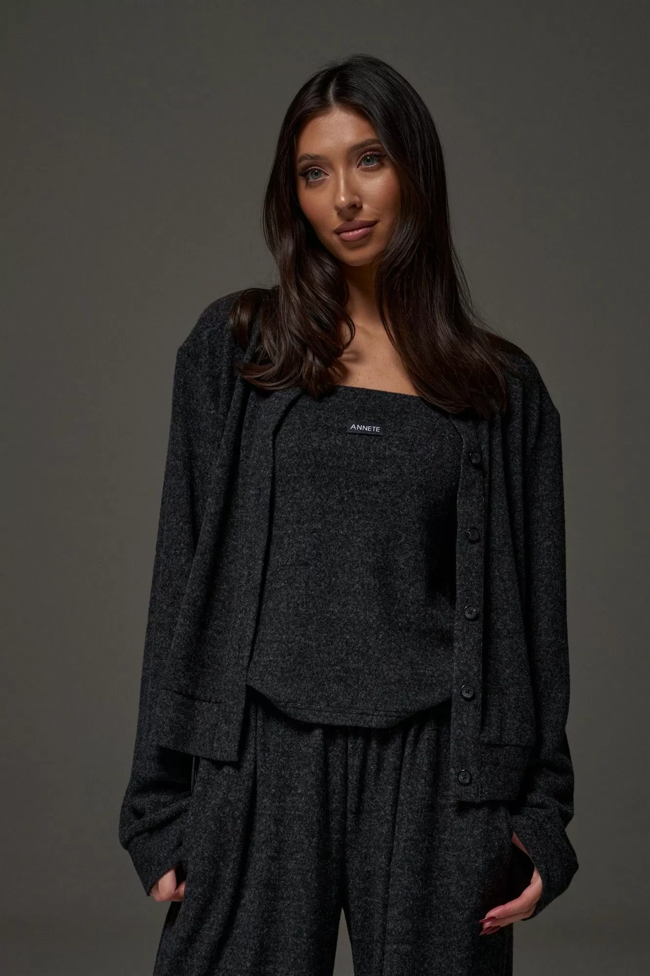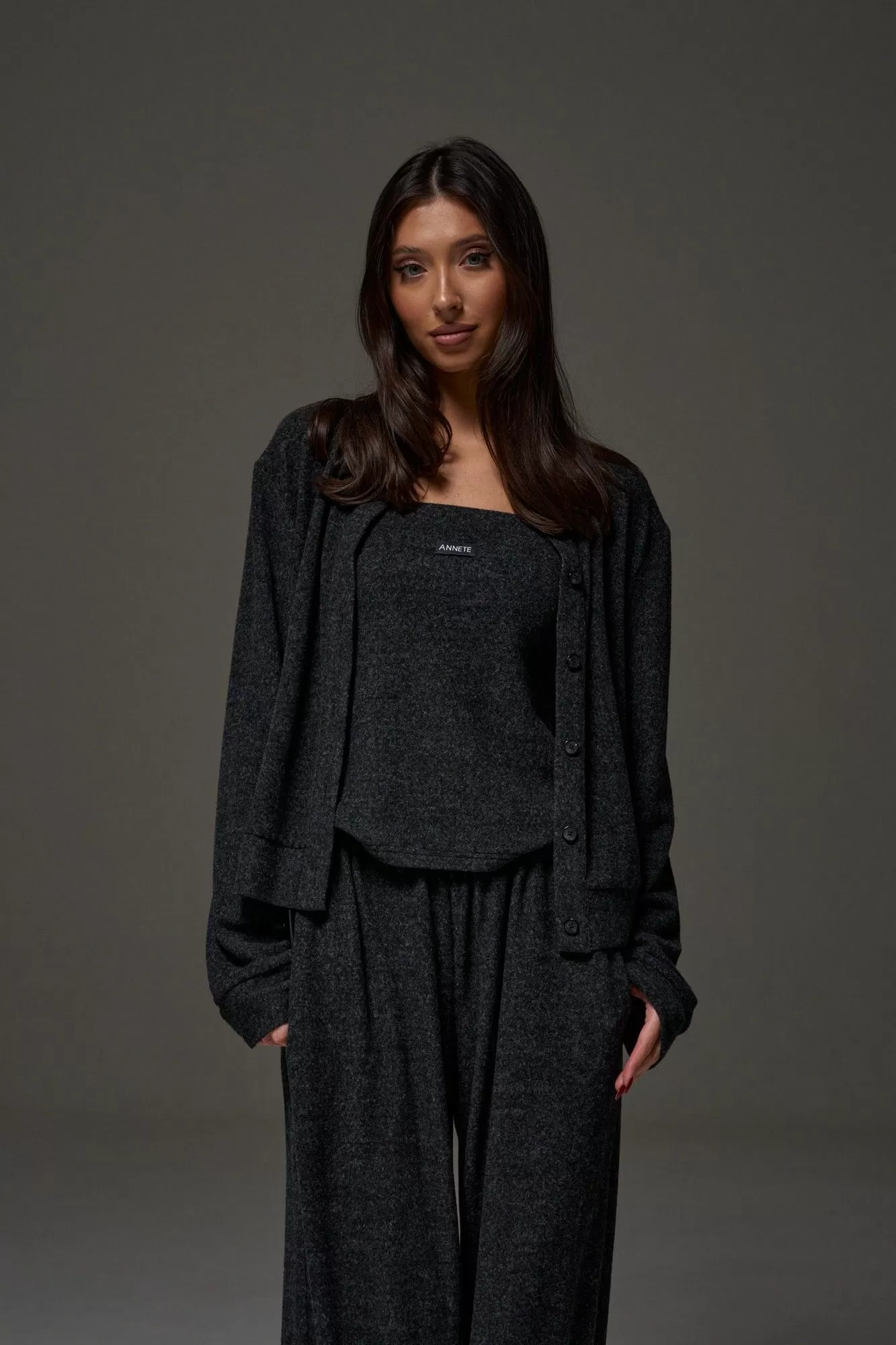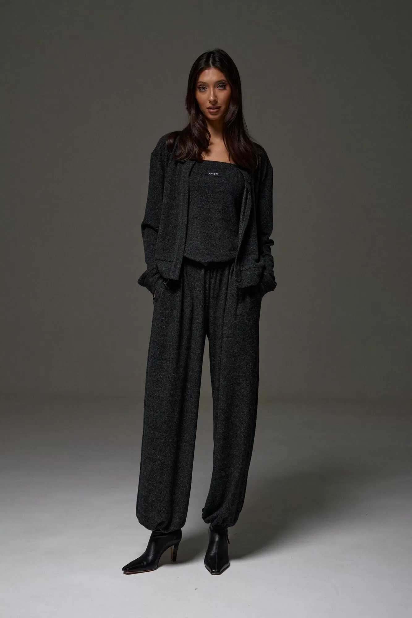Джемпер прямого кроя, выполнен из трикотажного ворсистого полотна графитового цвета. Характеристика: прямой крой, воротник стойка, застежка центральная планка на петли-пуговицы, по низу планка чуть заужена, рукав втачной, манжет широкий. Длина рукава от края горловины 86 см, длина изделия по спинке 56 см.