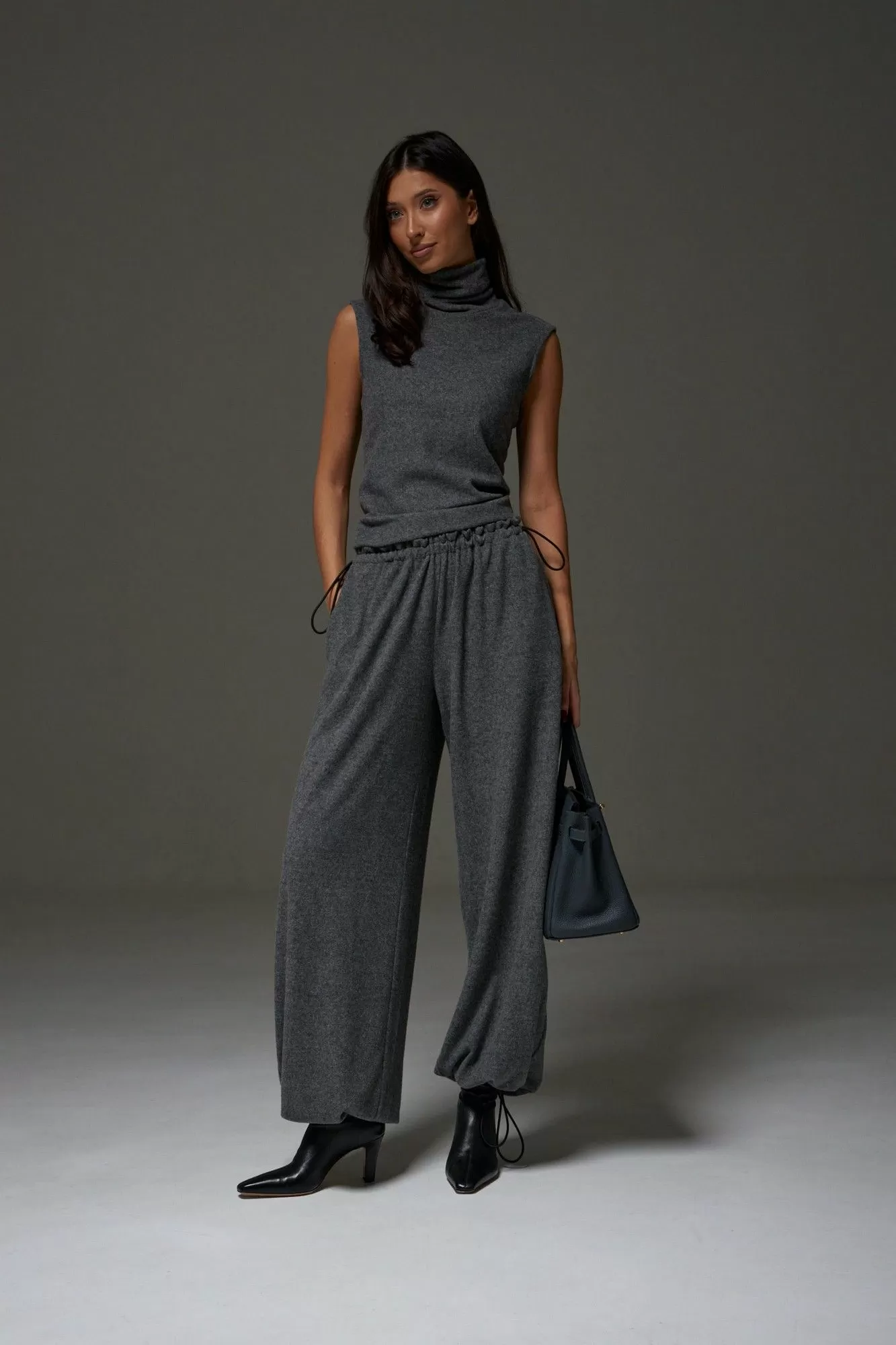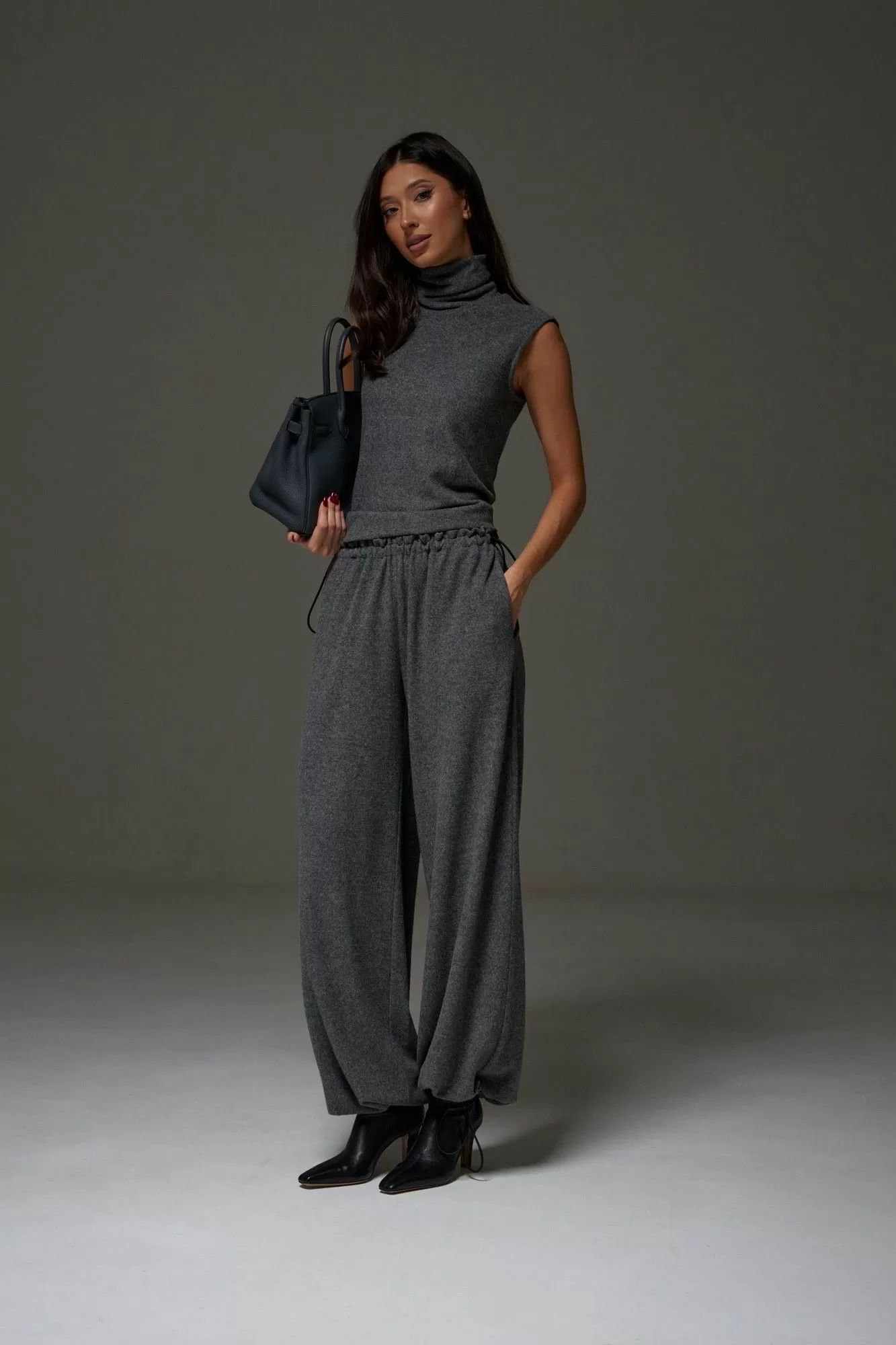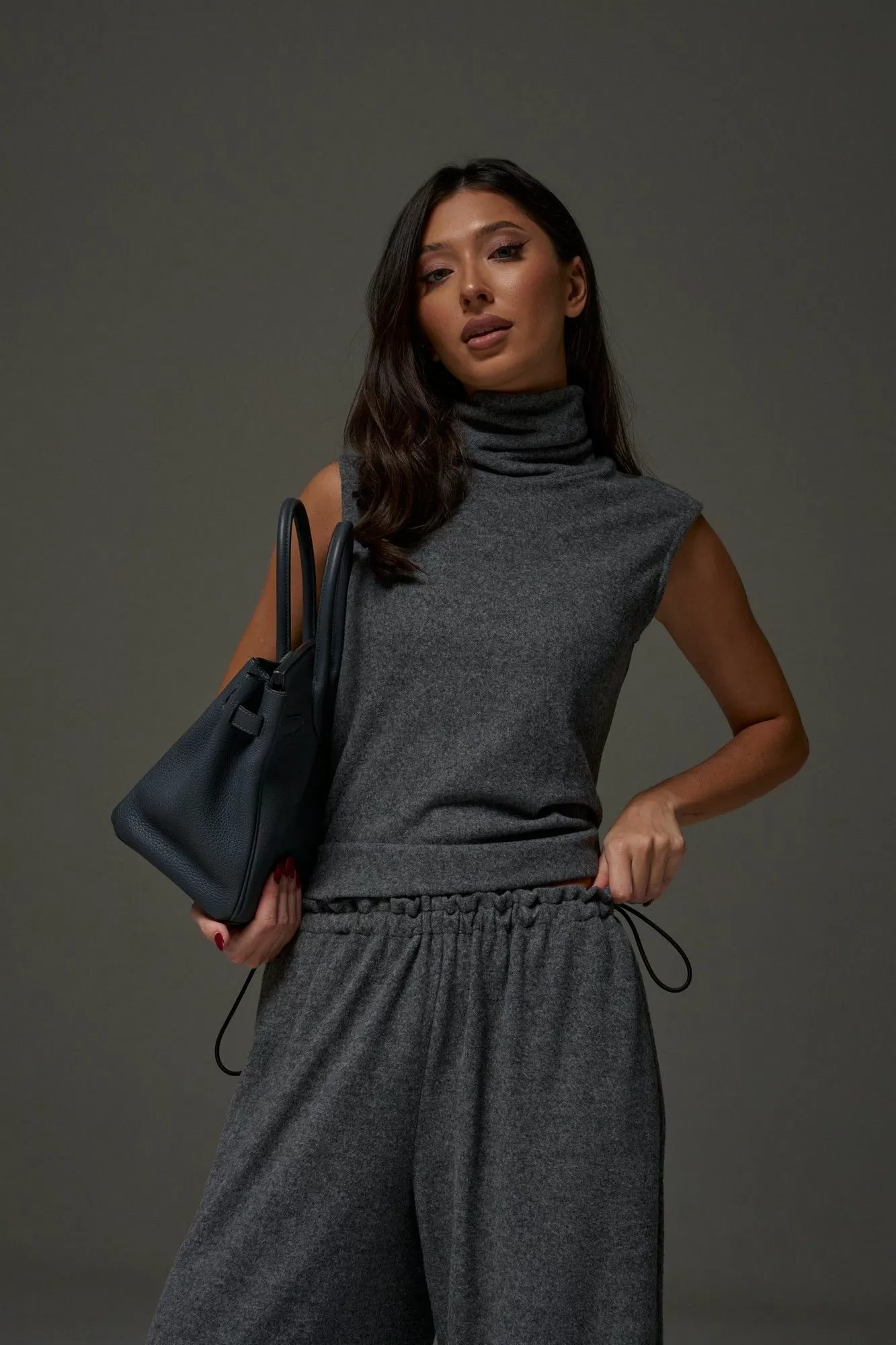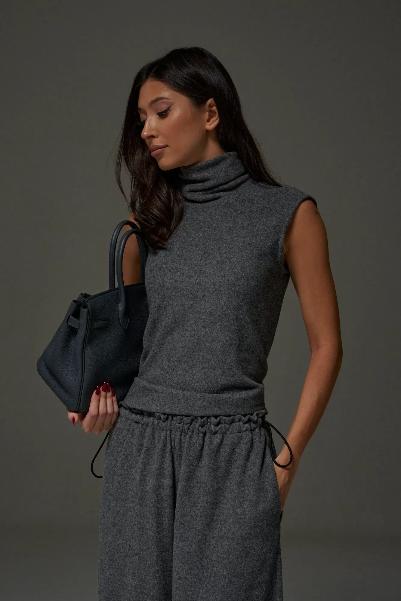 Джемпер без рукавов прилегающего силуэта, выполнен из мягкого ворсистого трикотажного полотна серого цвета. Характеристики: Горловина-стойка, в естественную складку. Длина спинки от края горловины 54 см.