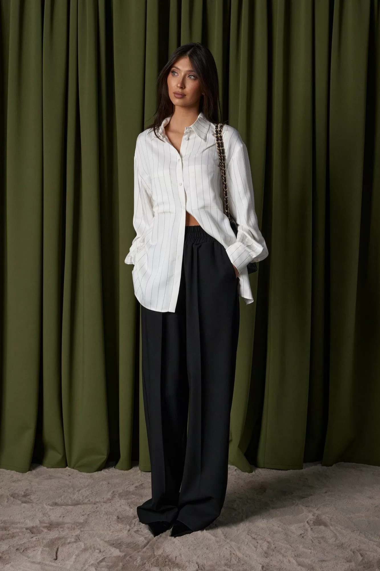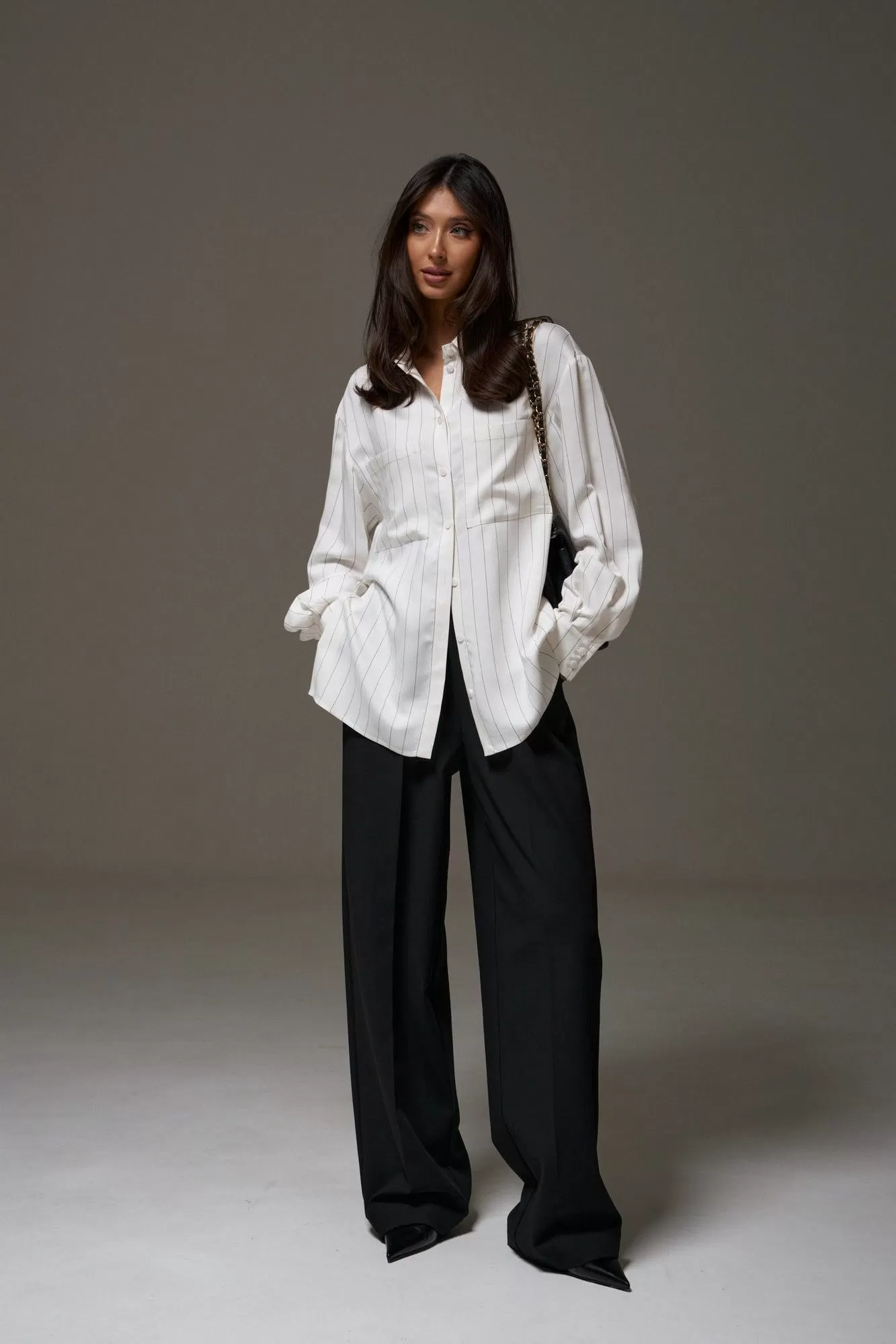 Рубашка свободного кроя выполнена из тексильного полотна бежевого цвета с геометрическим принтом. Характеристики: прямой крой, горловина круглая с отложным воротником на стойке, рукав втачной, немного спущен, с манжетой на двух пуговицах, в боковых швах разрезы 27см, на груди функциональные карманы. Длина рукава 58см, длина по спинке 70см.