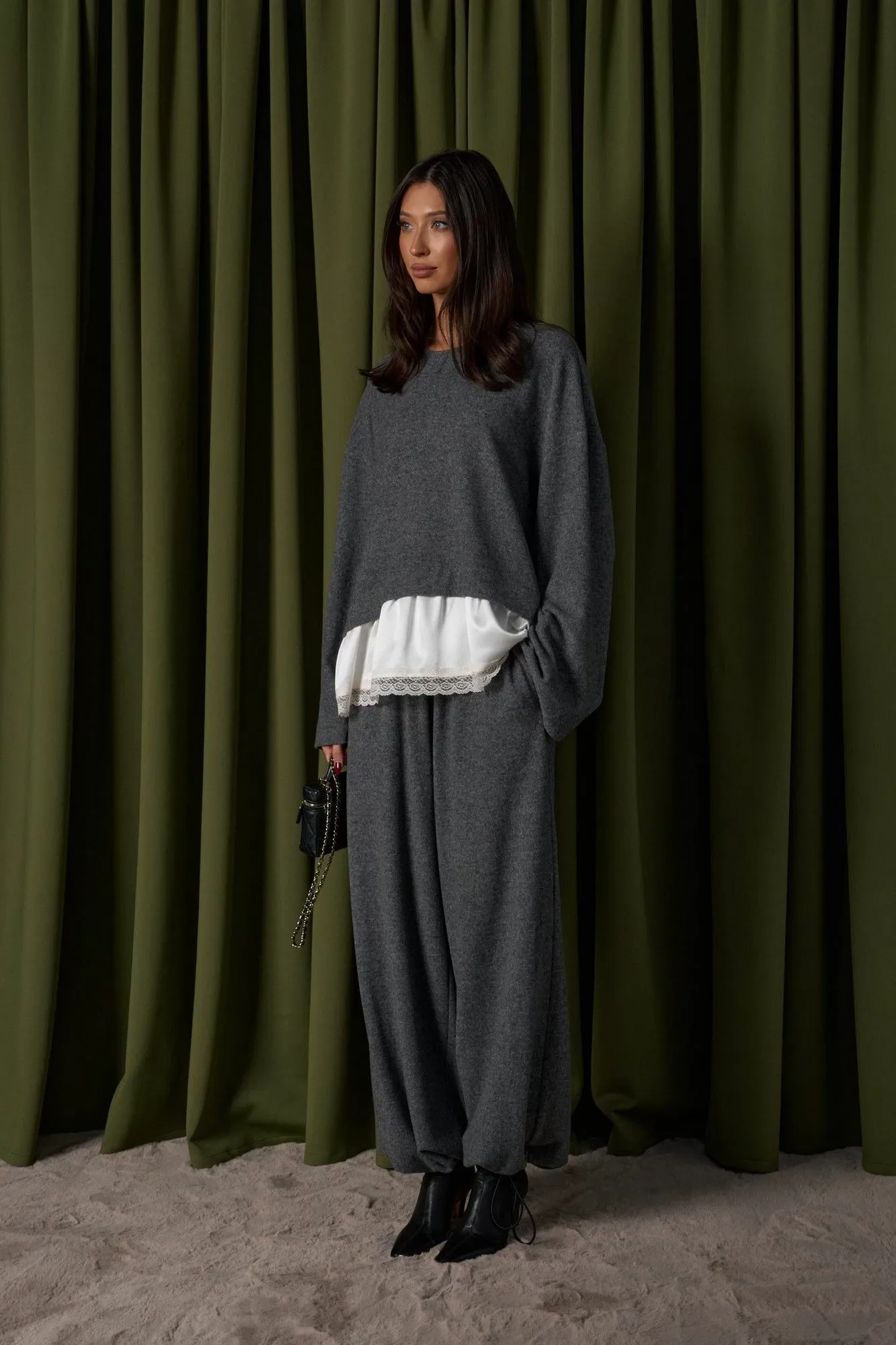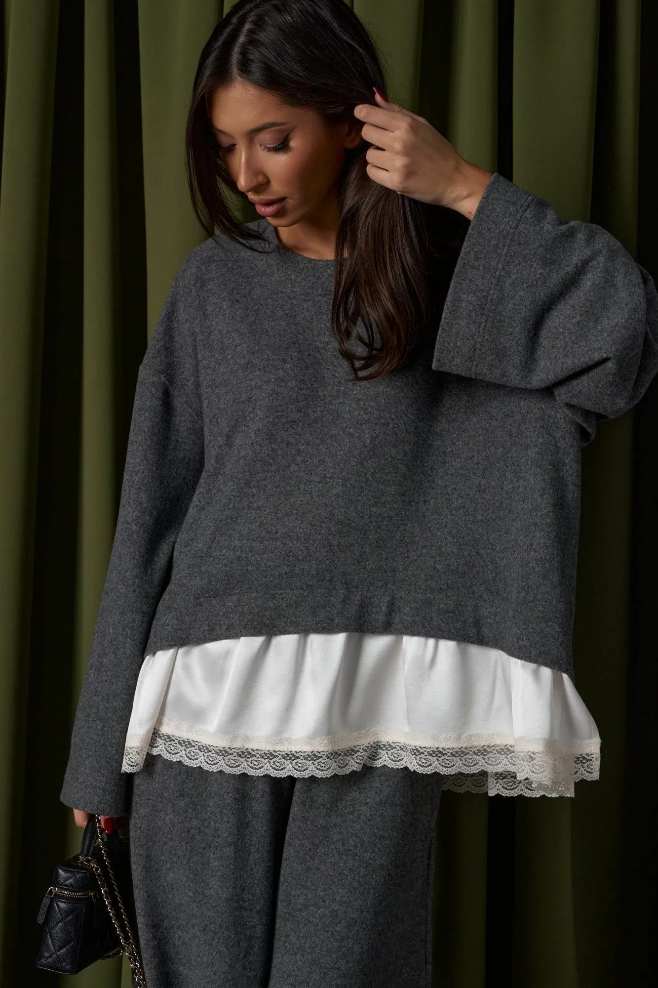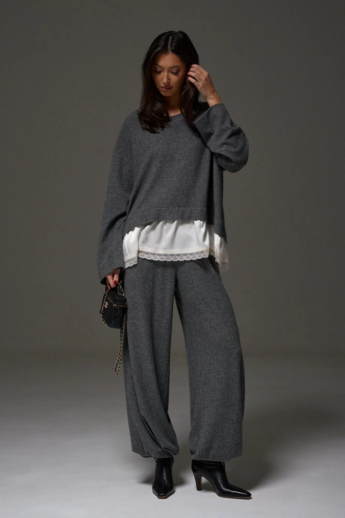 Джемпер в крое трапеция, выполнен из трикотажного полотна серого цвета. Характеристика: крой трапеция - расширяется к низу, овальная горловина, рукав спущен, спинка изделия чуть удлинена, по низу изделия пришита рюша из струящейся ткани с кружевом. Длина изделия по центру спинки 67 см ( с учетом кружева), длина рукава от края горловины 73 см.